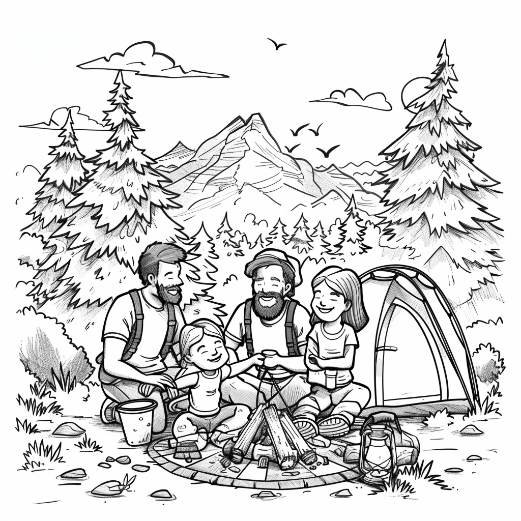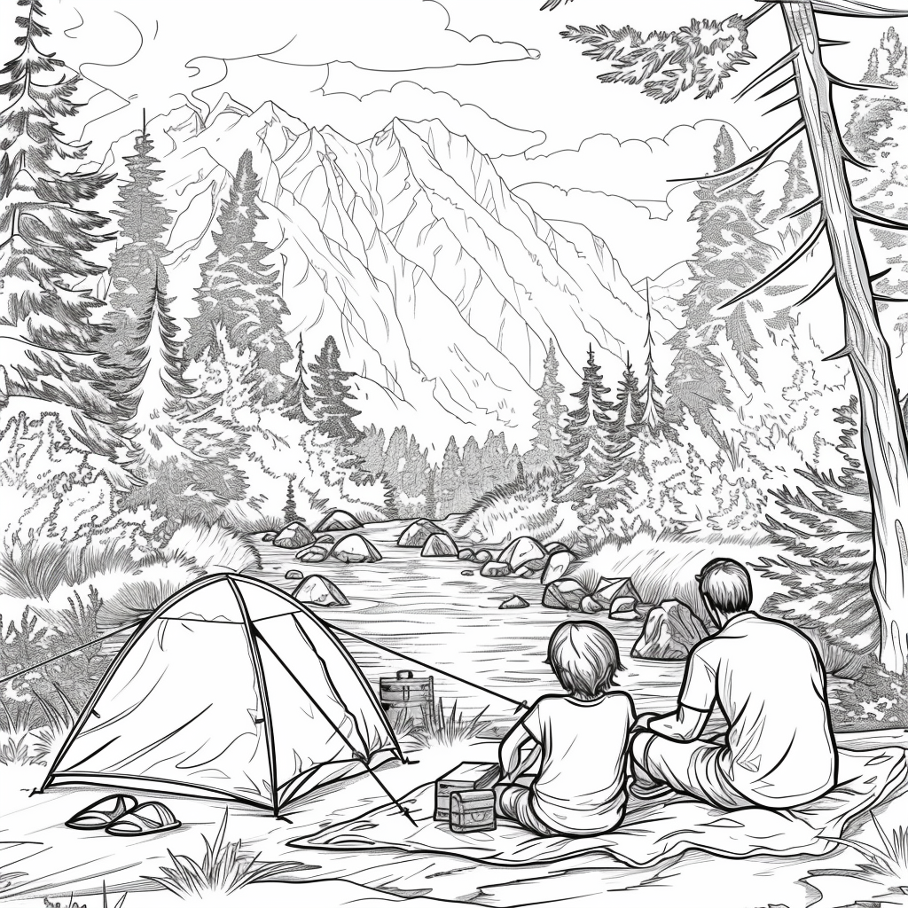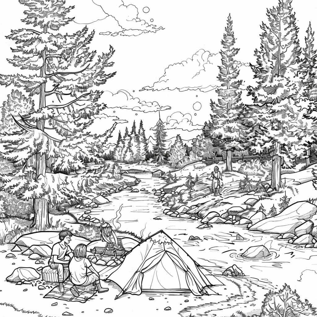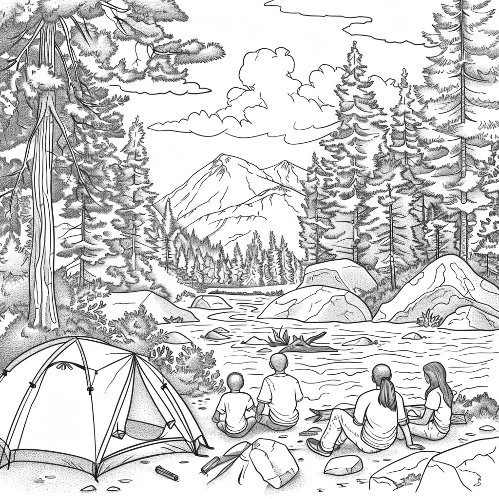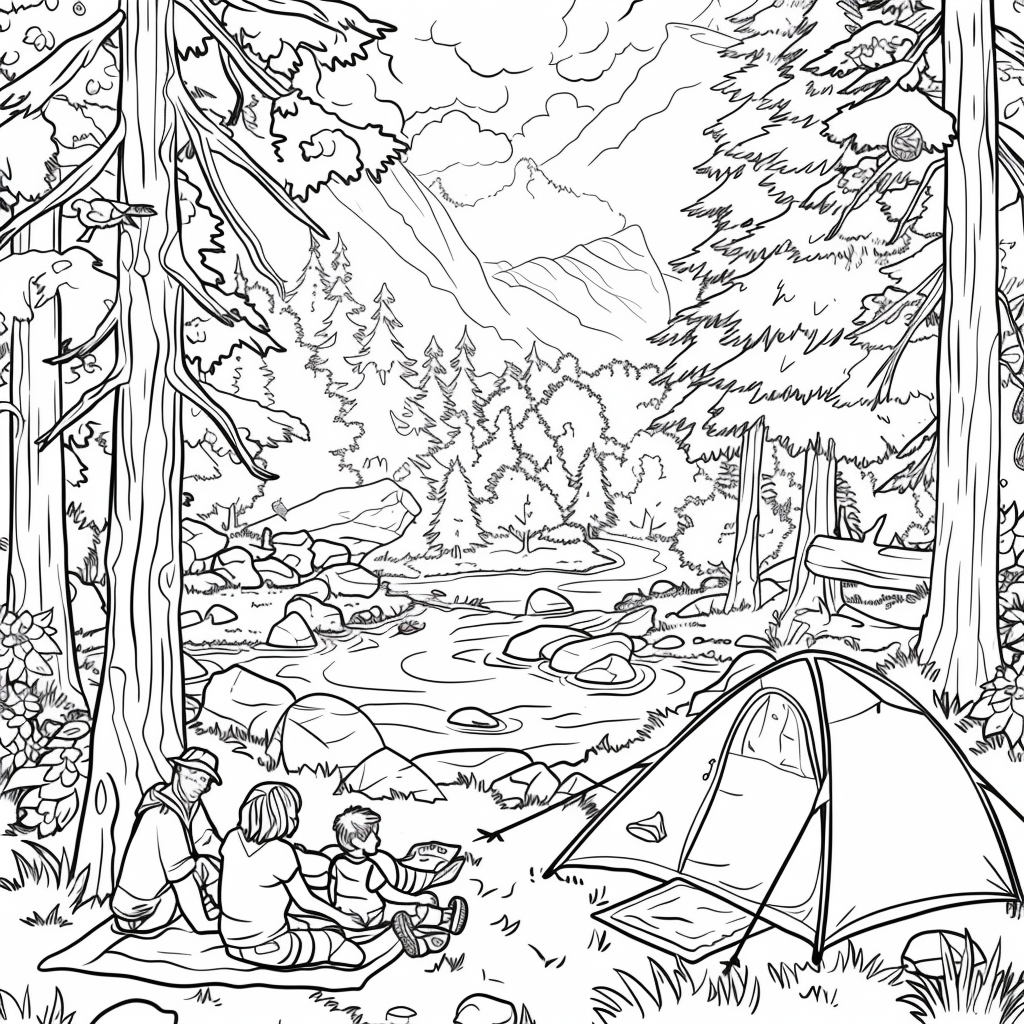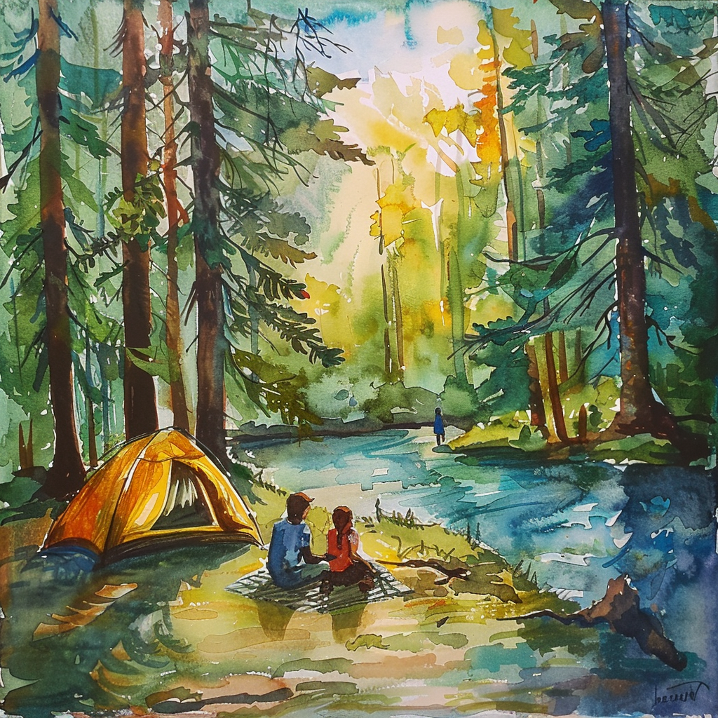 Bathed in golden morning light, a small family shares a peaceful moment beside a forest stream, nestled deep in towering pines. Their bright orange tent glows warmly against the cool greens and blues of the forest, while dappled sunlight filters through the trees, casting a magical hue over the scene. Painted in loose, expressive watercolor strokes, this artwork captures the serenity of nature and the intimacy of simple connection—an ode to slowing down, breathing deeply, and cherishing the wild beauty around us.