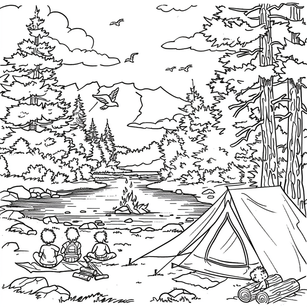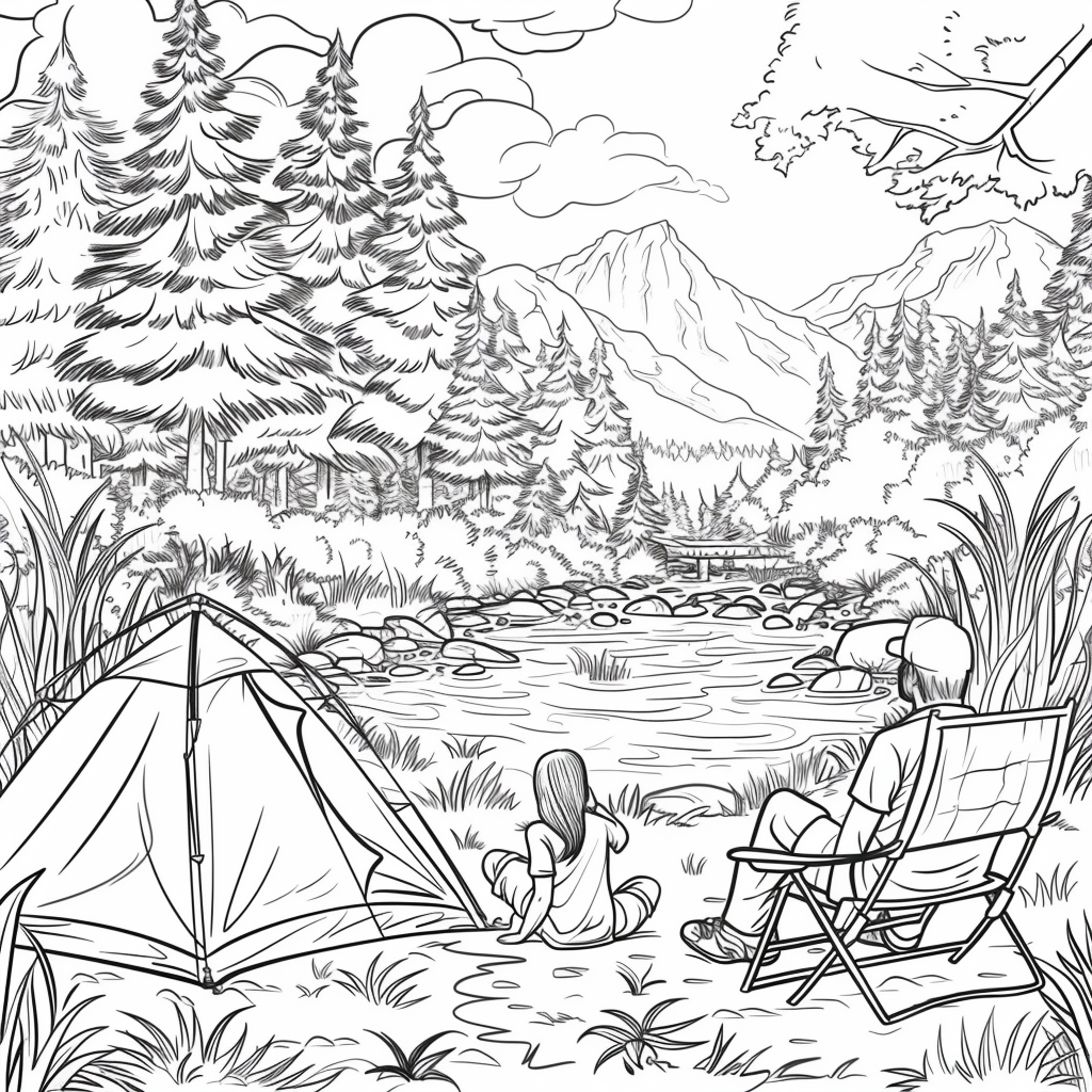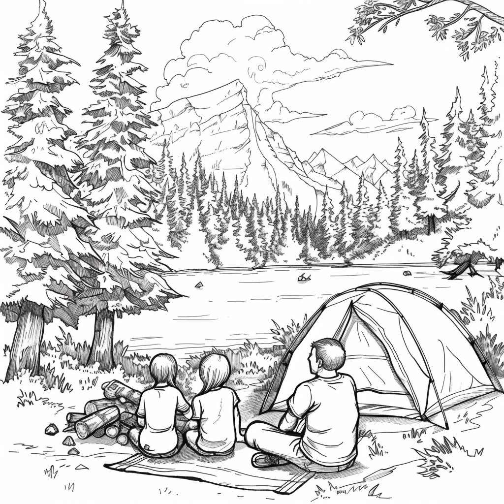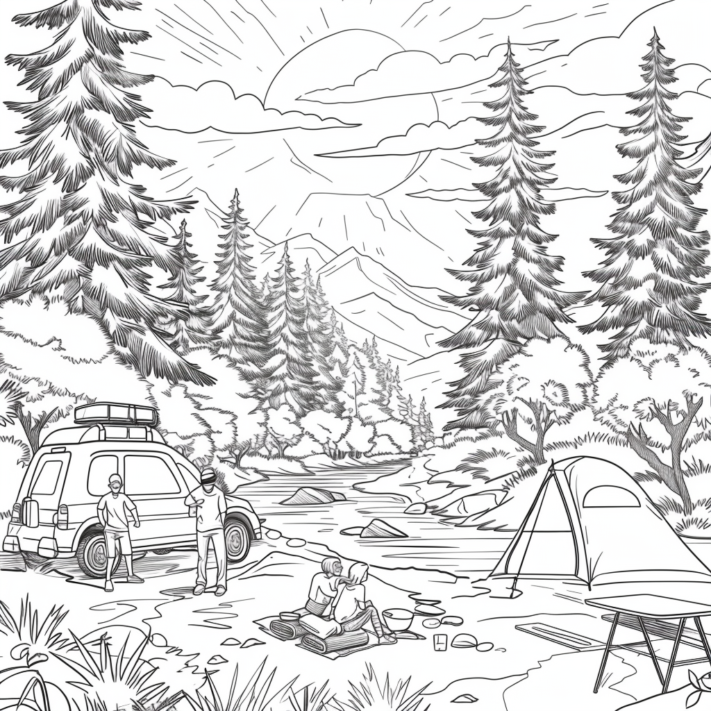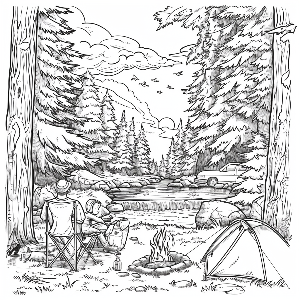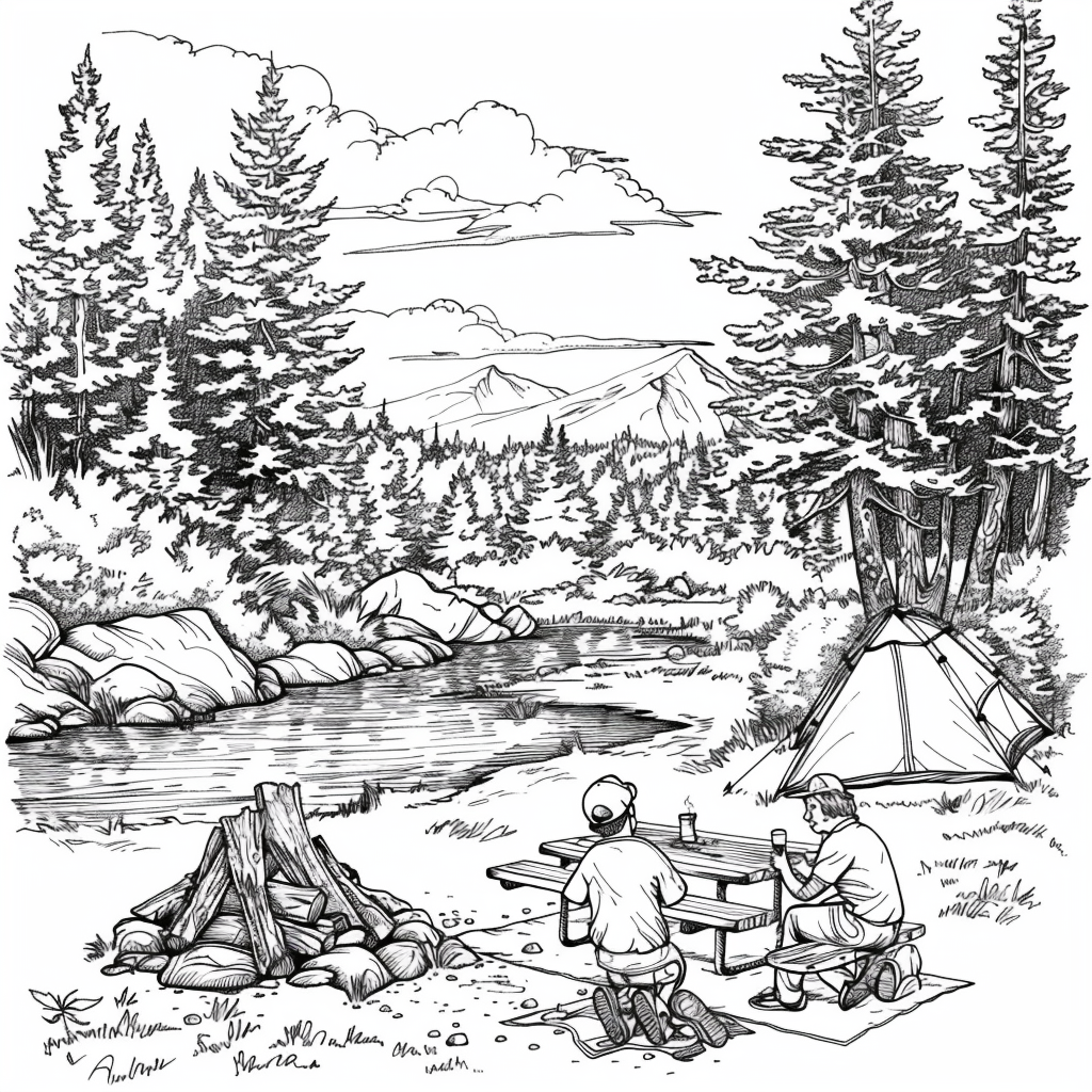 Bathed in golden morning light, a small family shares a peaceful moment beside a forest stream, nestled deep in towering pines. Their bright orange tent glows warmly against the cool greens and blues of the forest, while dappled sunlight filters through the trees, casting a magical hue over the scene. Painted in loose, expressive watercolor strokes, this artwork captures the serenity of nature and the intimacy of simple connection—an ode to slowing down, breathing deeply, and cherishing the wild beauty around us.