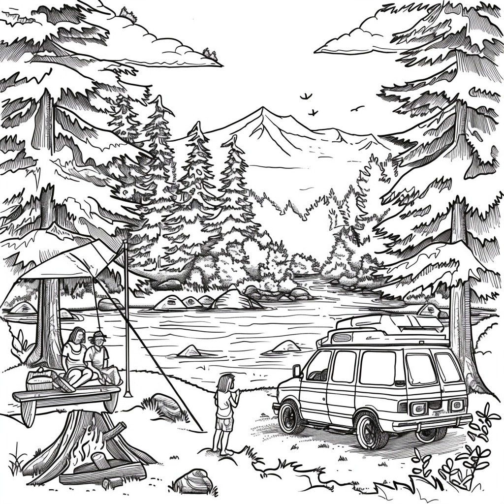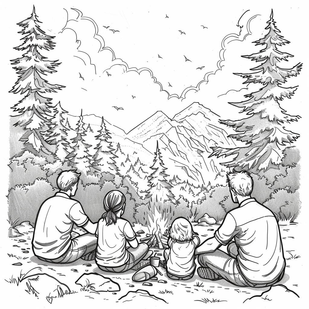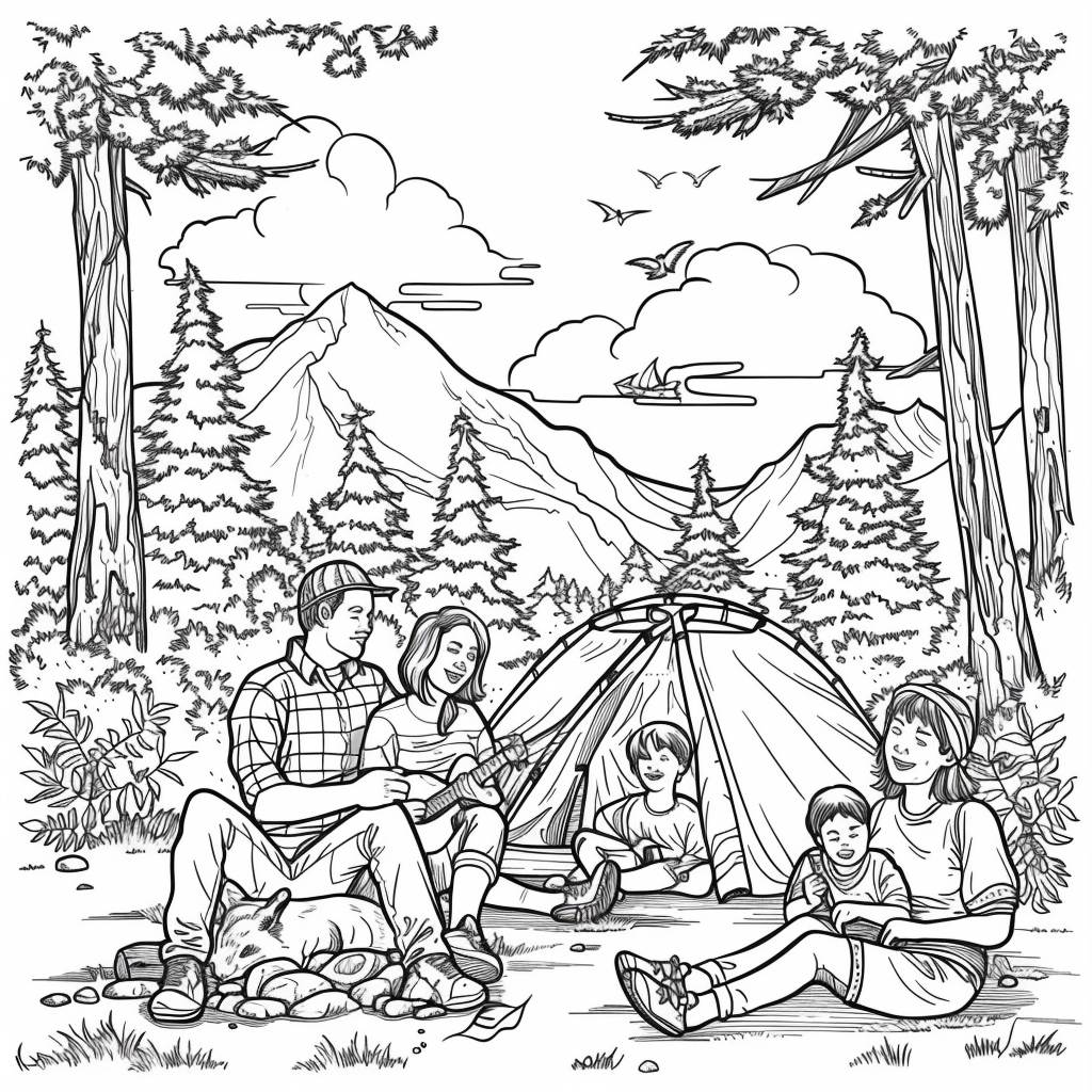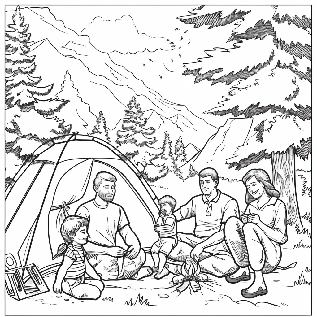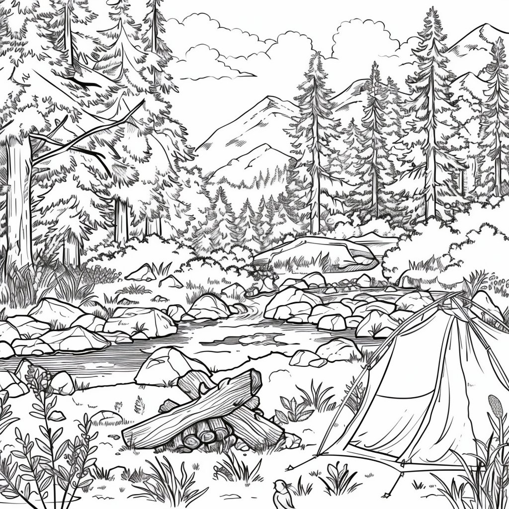 Bathed in golden morning light, a small family shares a peaceful moment beside a forest stream, nestled deep in towering pines. Their bright orange tent glows warmly against the cool greens and blues of the forest, while dappled sunlight filters through the trees, casting a magical hue over the scene. Painted in loose, expressive watercolor strokes, this artwork captures the serenity of nature and the intimacy of simple connection—an ode to slowing down, breathing deeply, and cherishing the wild beauty around us.
