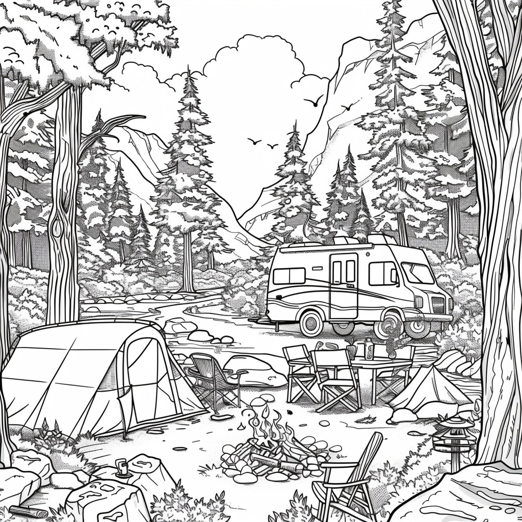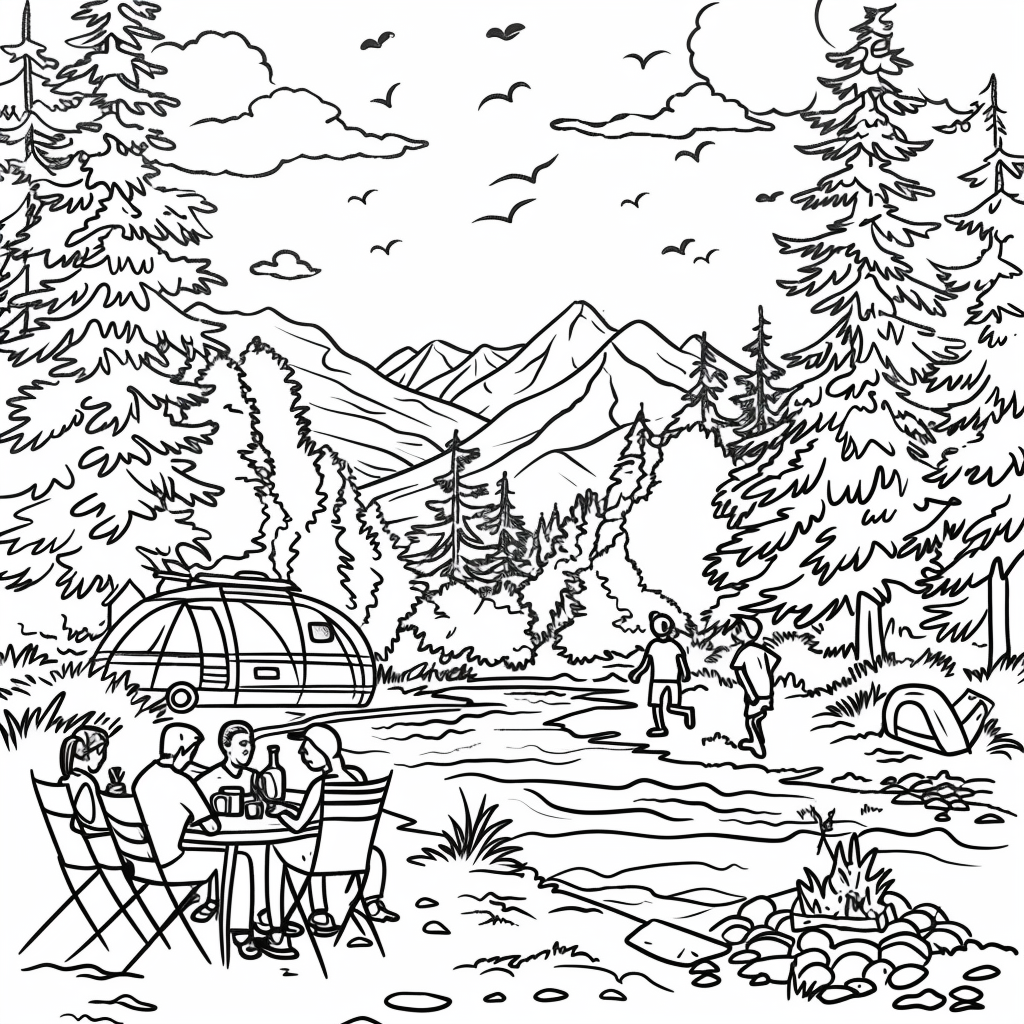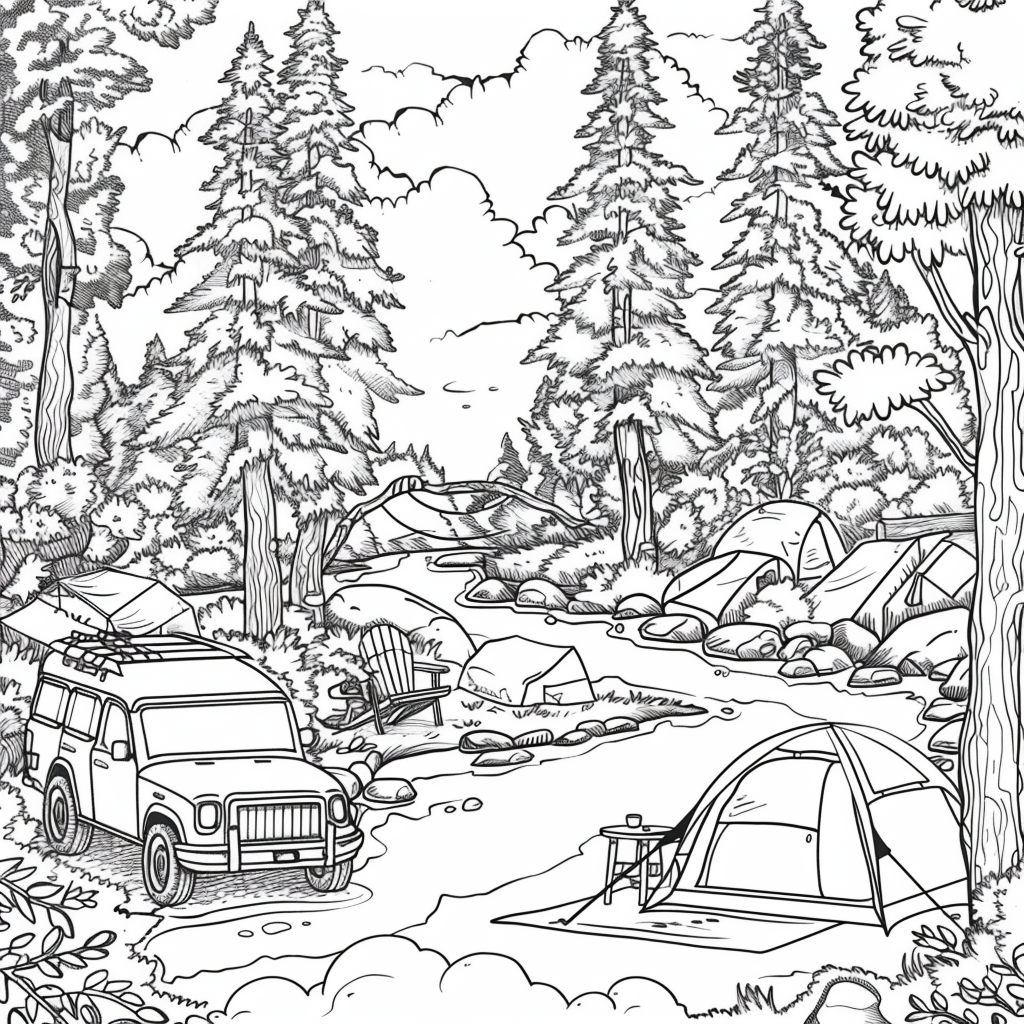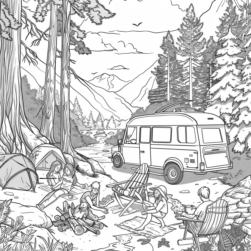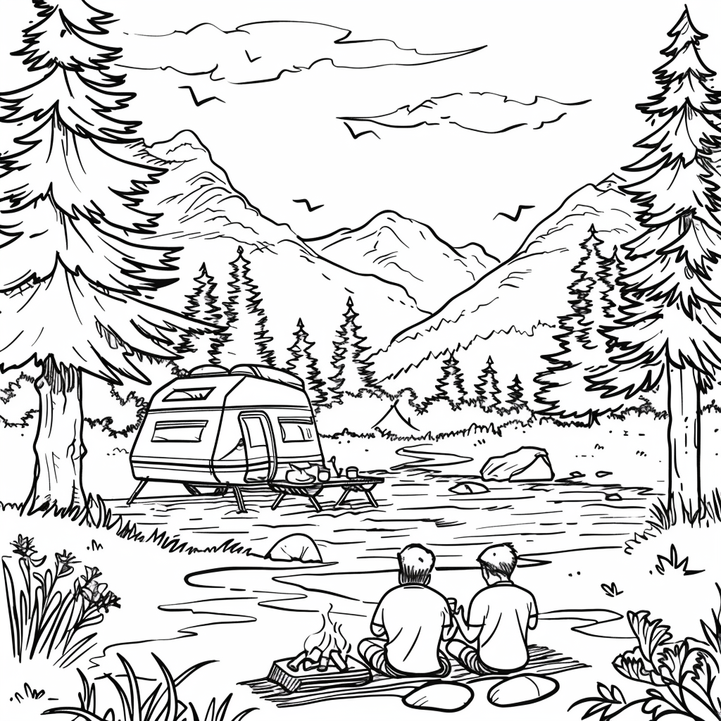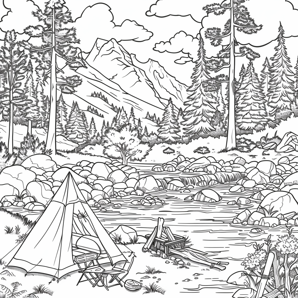 Bathed in golden morning light, a small family shares a peaceful moment beside a forest stream, nestled deep in towering pines. Their bright orange tent glows warmly against the cool greens and blues of the forest, while dappled sunlight filters through the trees, casting a magical hue over the scene. Painted in loose, expressive watercolor strokes, this artwork captures the serenity of nature and the intimacy of simple connection—an ode to slowing down, breathing deeply, and cherishing the wild beauty around us.