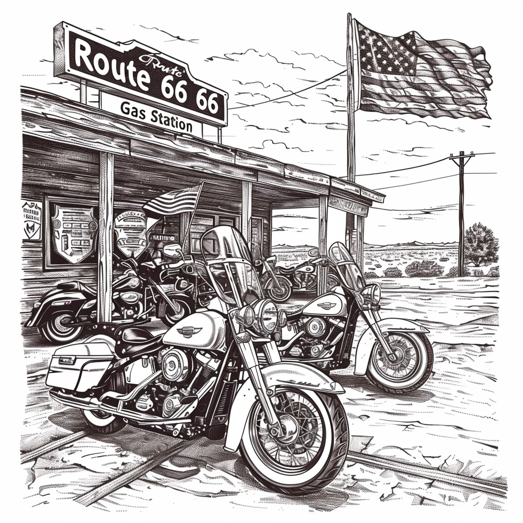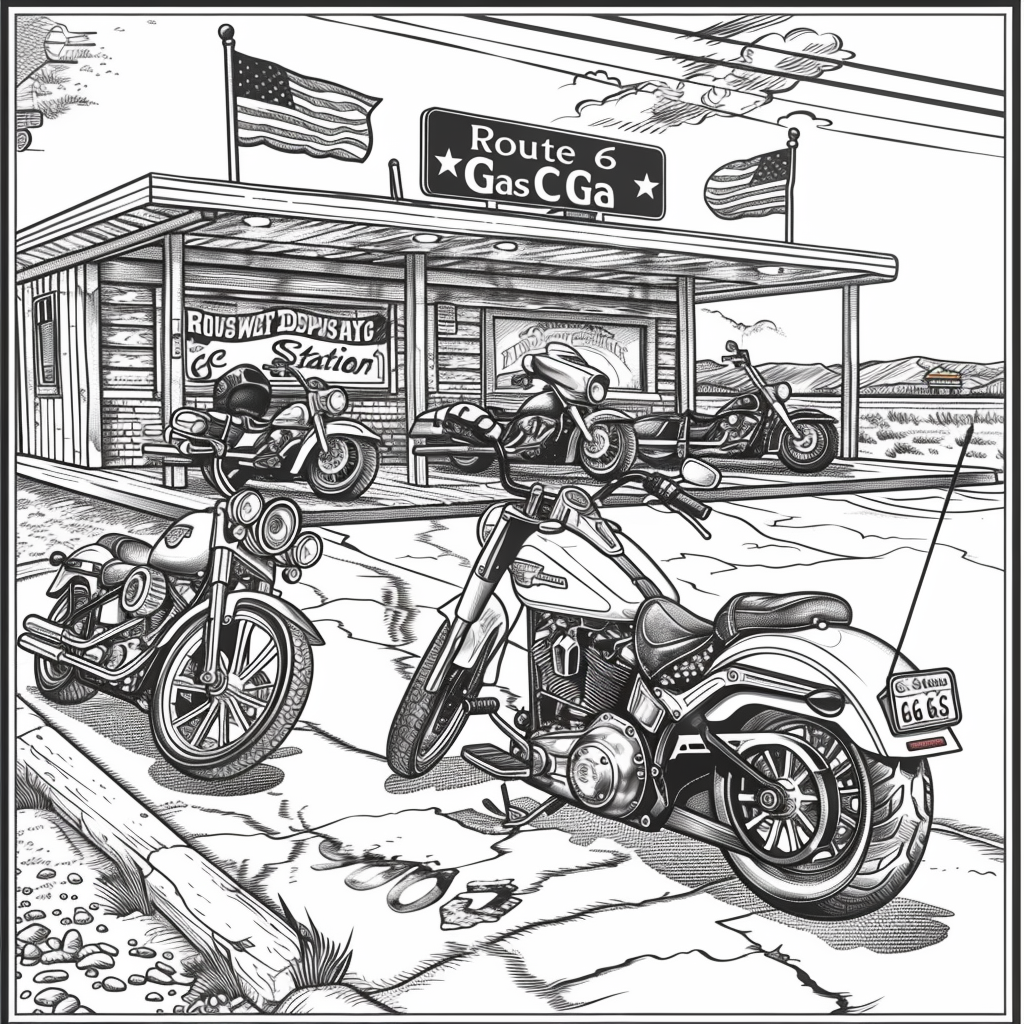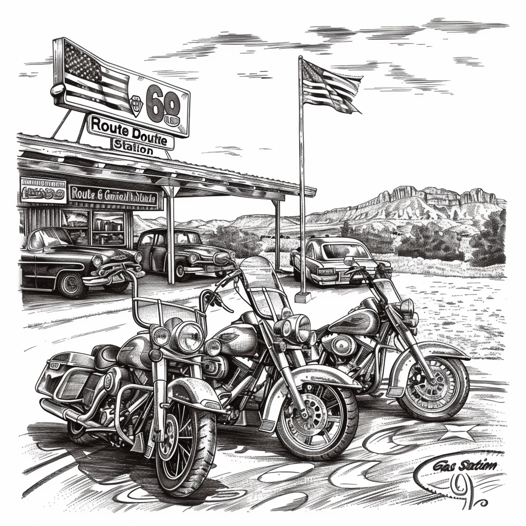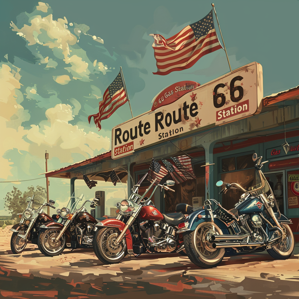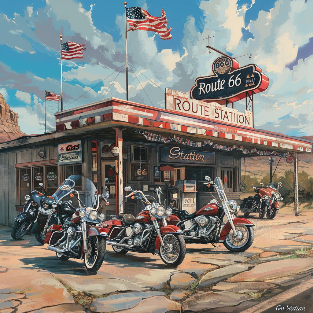 A nostalgic tribute to the golden age of American road travel, this artwork captures a classic gas station along historic Route 66, where chrome gleams under desert skies and the Stars and Stripes flutter proudly in the wind. Vintage Harley-Davidsons line the cracked pavement, their red-and-black paint jobs echoing the bold signage and retro charm of the station behind them. With dramatic skies, weathered wood, and timeless Americana vibes, this piece is perfect for lovers of the open road, motorcycle culture, and vintage travel posters.