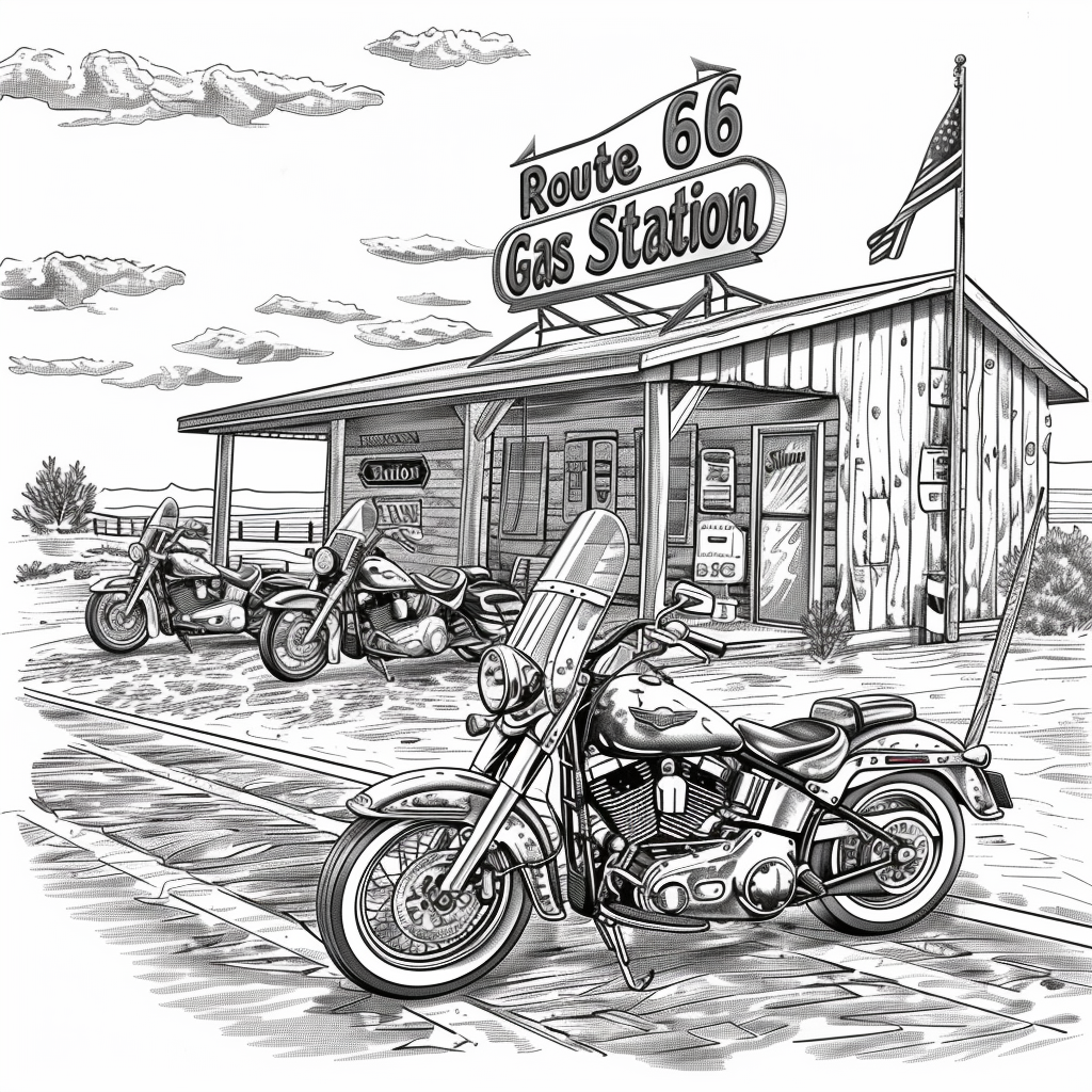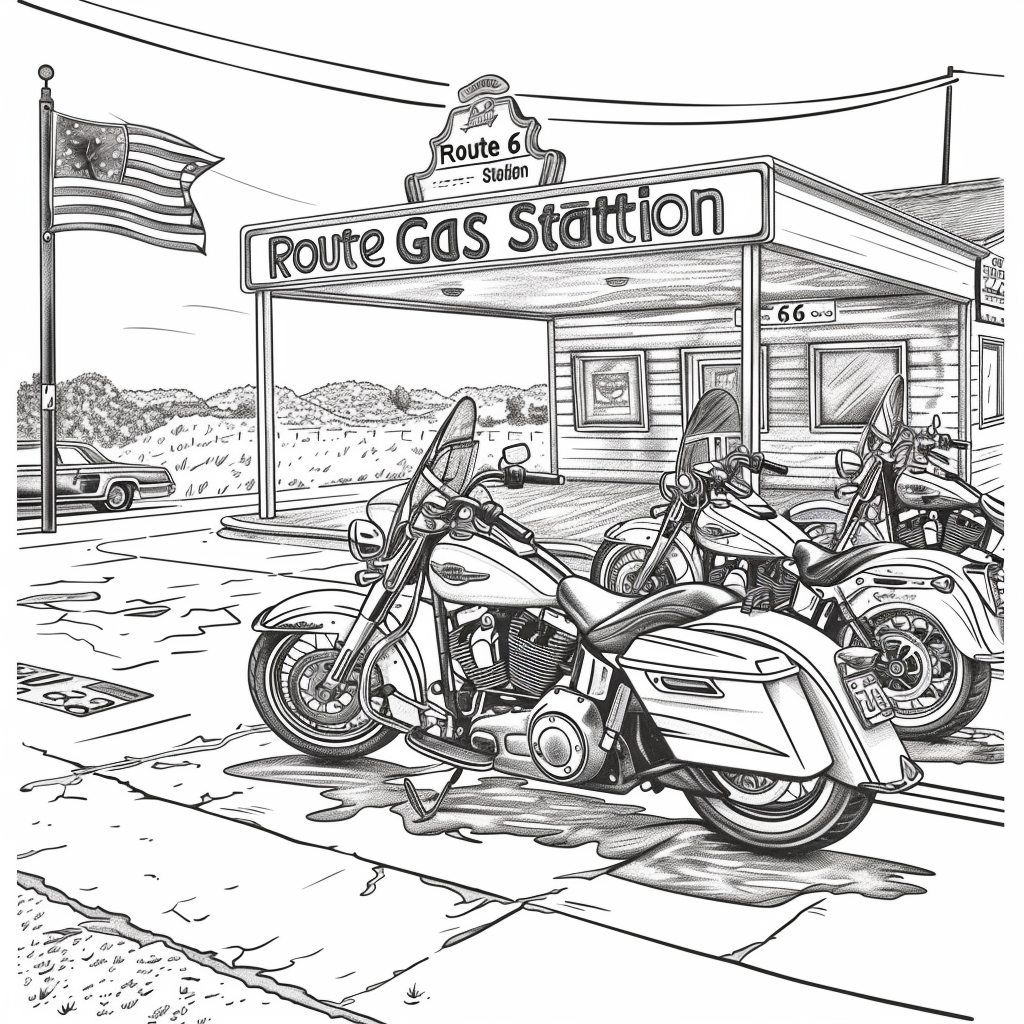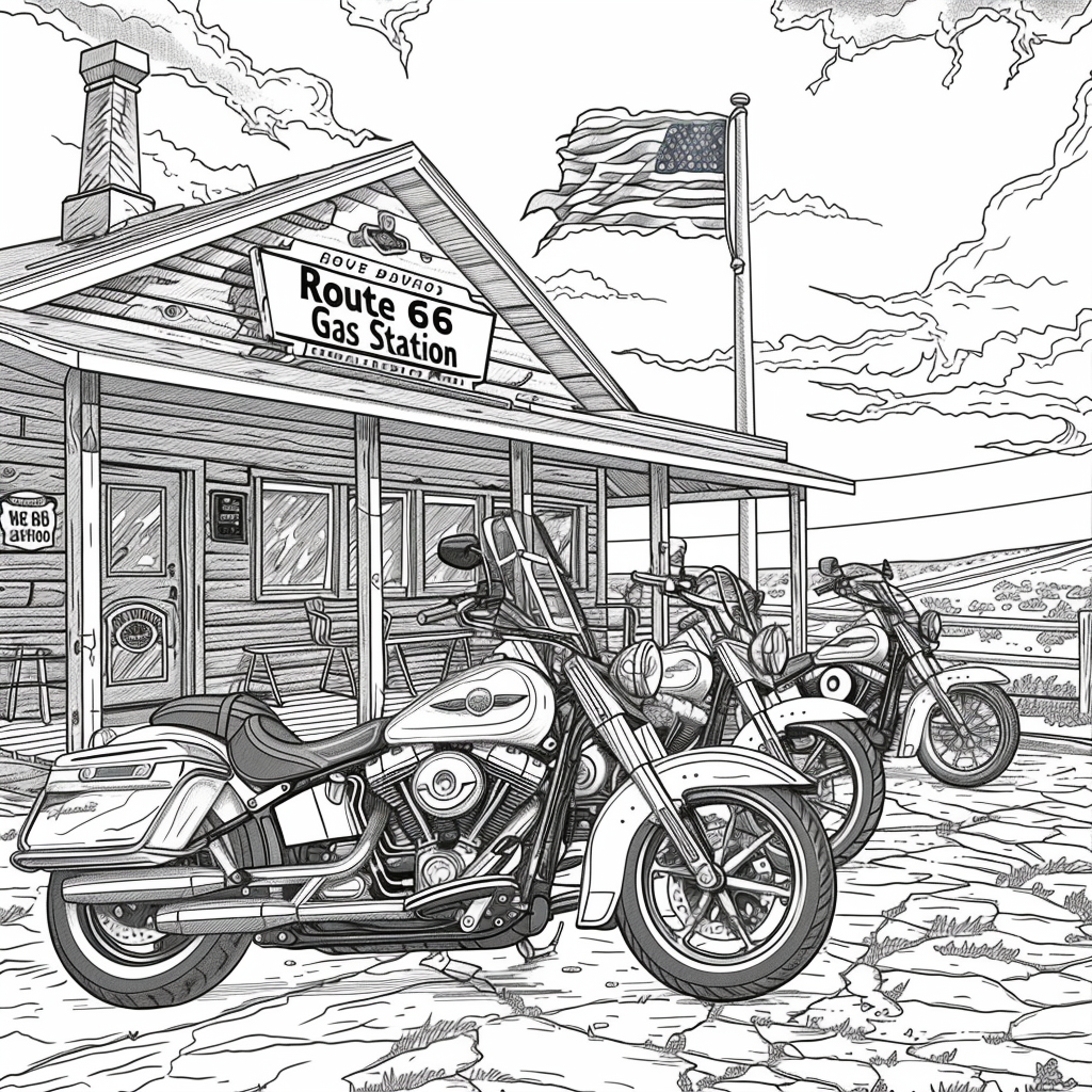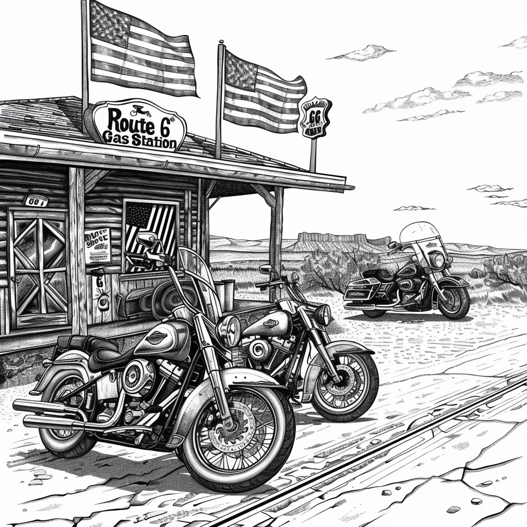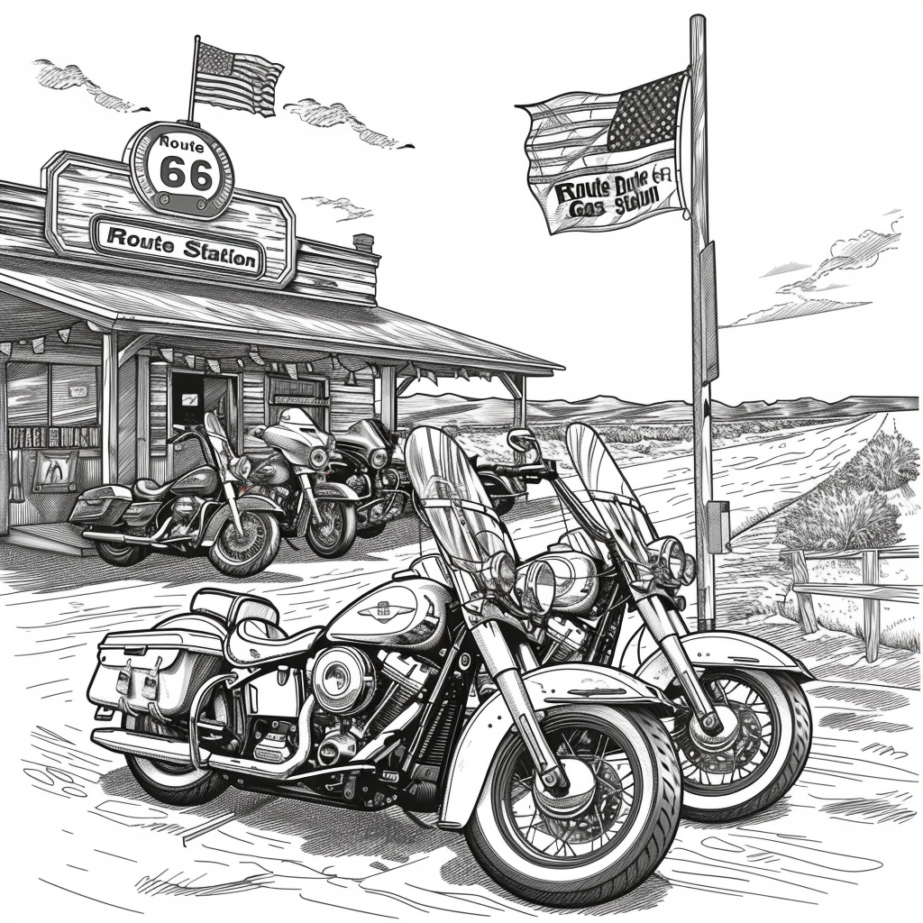 A nostalgic tribute to the golden age of American road travel, this artwork captures a classic gas station along historic Route 66, where chrome gleams under desert skies and the Stars and Stripes flutter proudly in the wind. Vintage Harley-Davidsons line the cracked pavement, their red-and-black paint jobs echoing the bold signage and retro charm of the station behind them. With dramatic skies, weathered wood, and timeless Americana vibes, this piece is perfect for lovers of the open road, motorcycle culture, and vintage travel posters.
