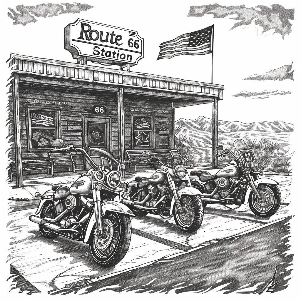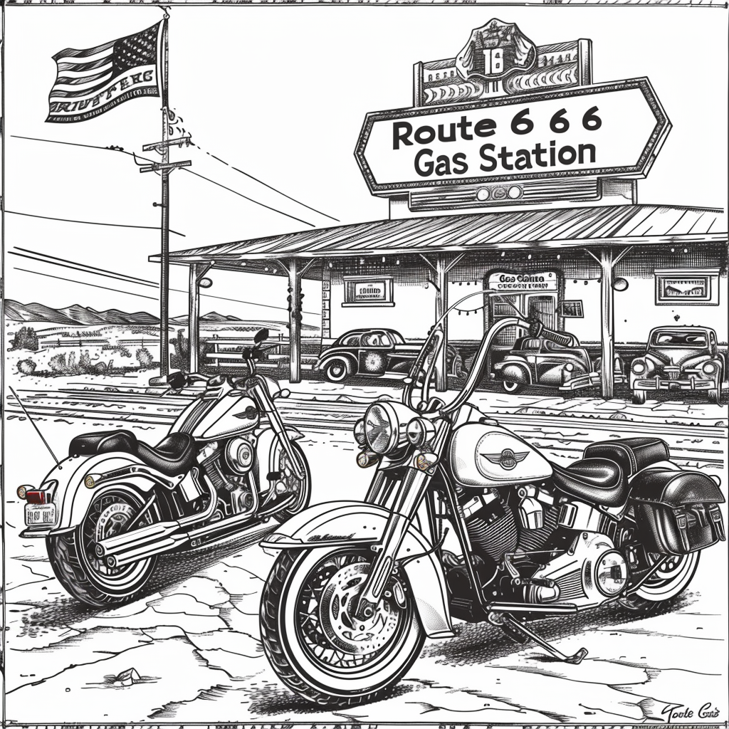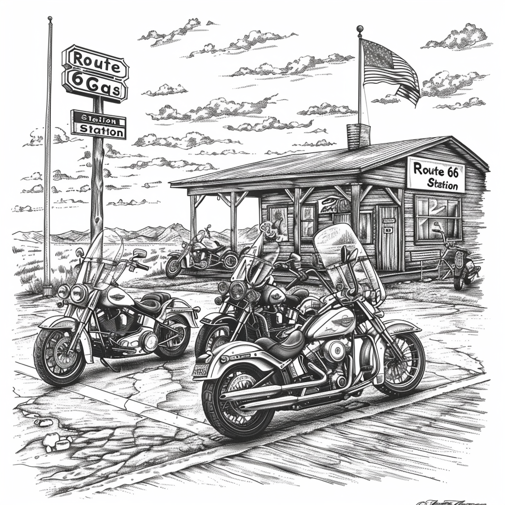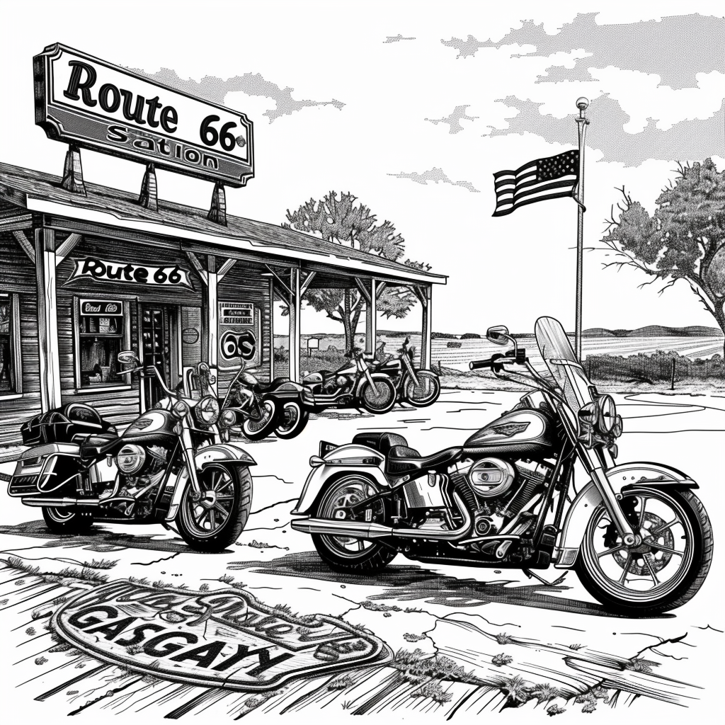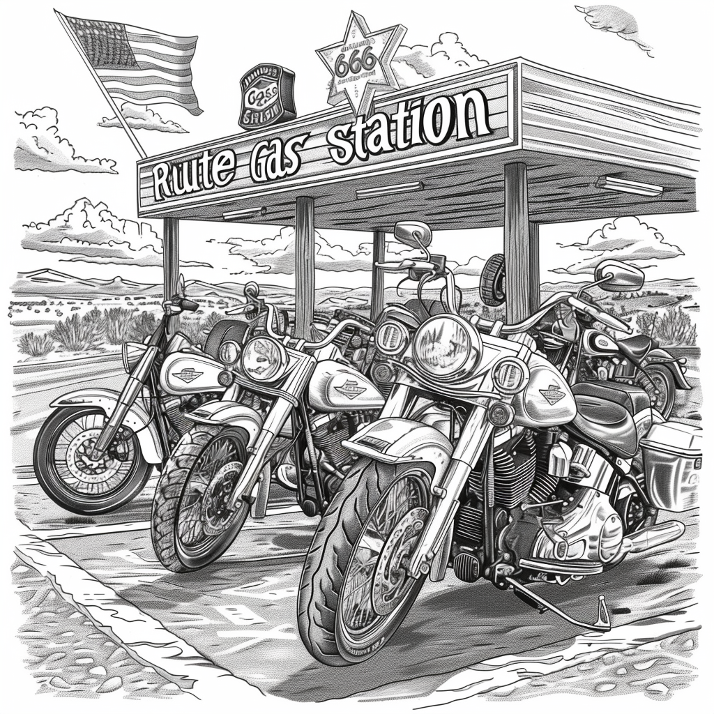 A nostalgic tribute to the golden age of American road travel, this artwork captures a classic gas station along historic Route 66, where chrome gleams under desert skies and the Stars and Stripes flutter proudly in the wind. Vintage Harley-Davidsons line the cracked pavement, their red-and-black paint jobs echoing the bold signage and retro charm of the station behind them. With dramatic skies, weathered wood, and timeless Americana vibes, this piece is perfect for lovers of the open road, motorcycle culture, and vintage travel posters.
