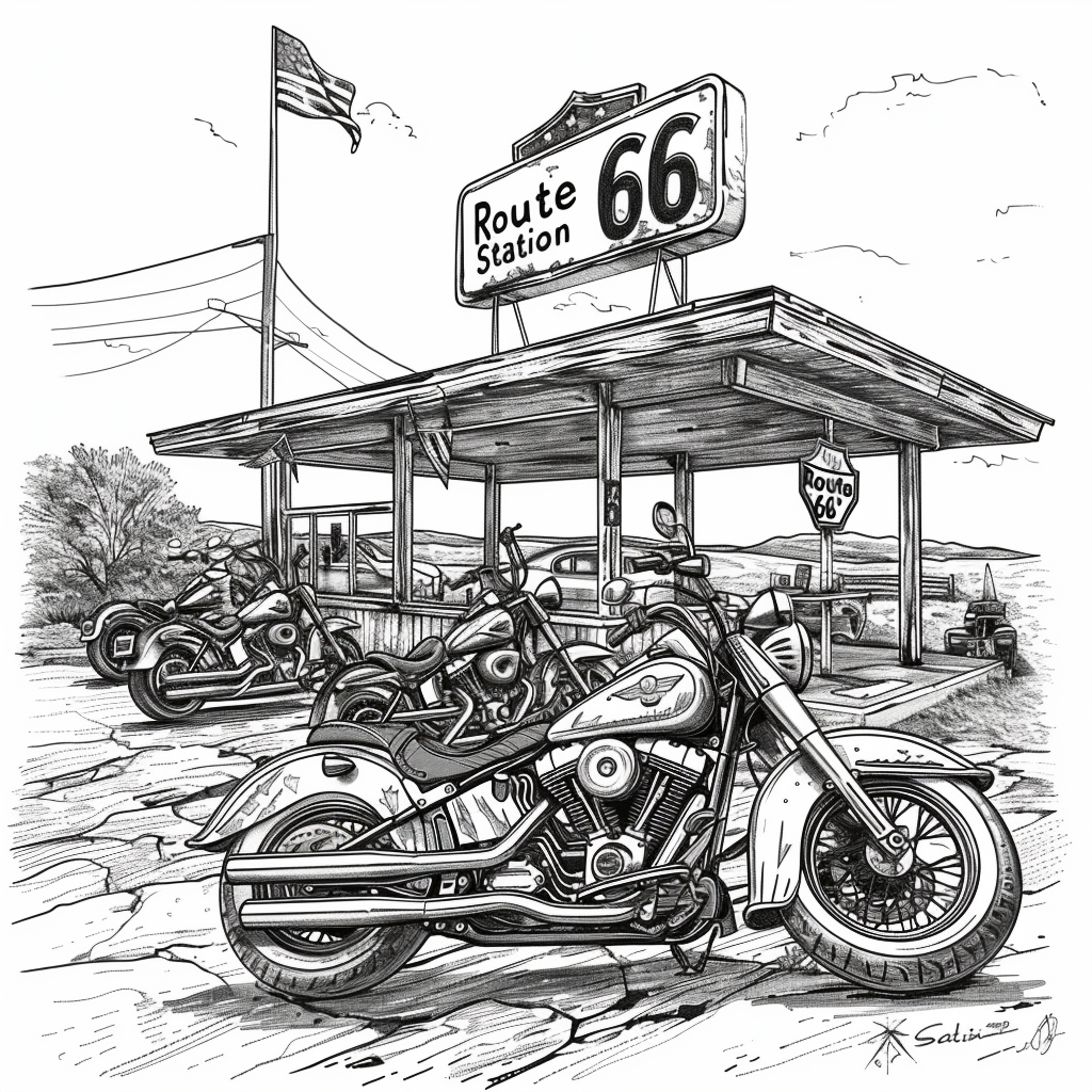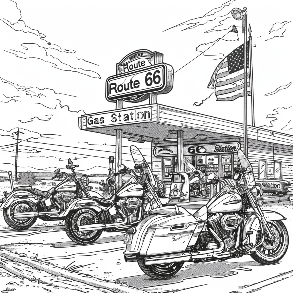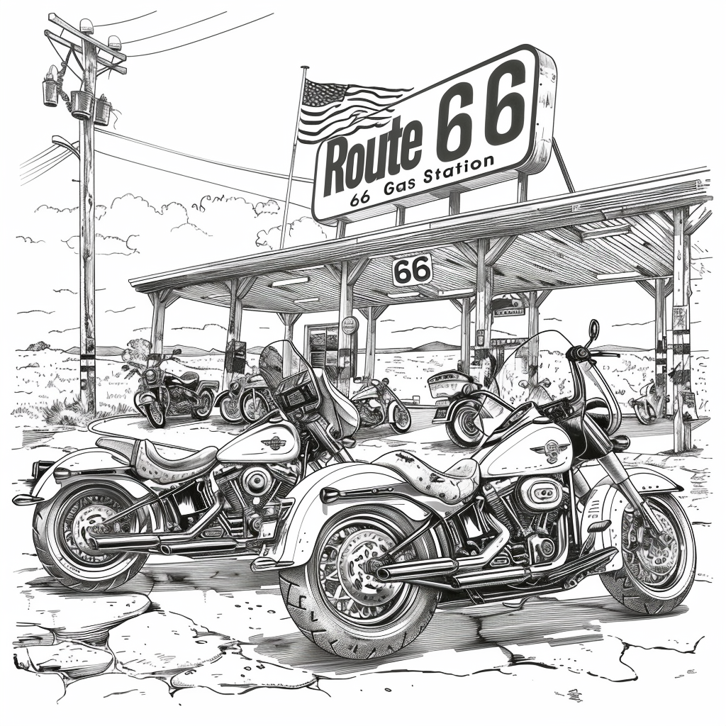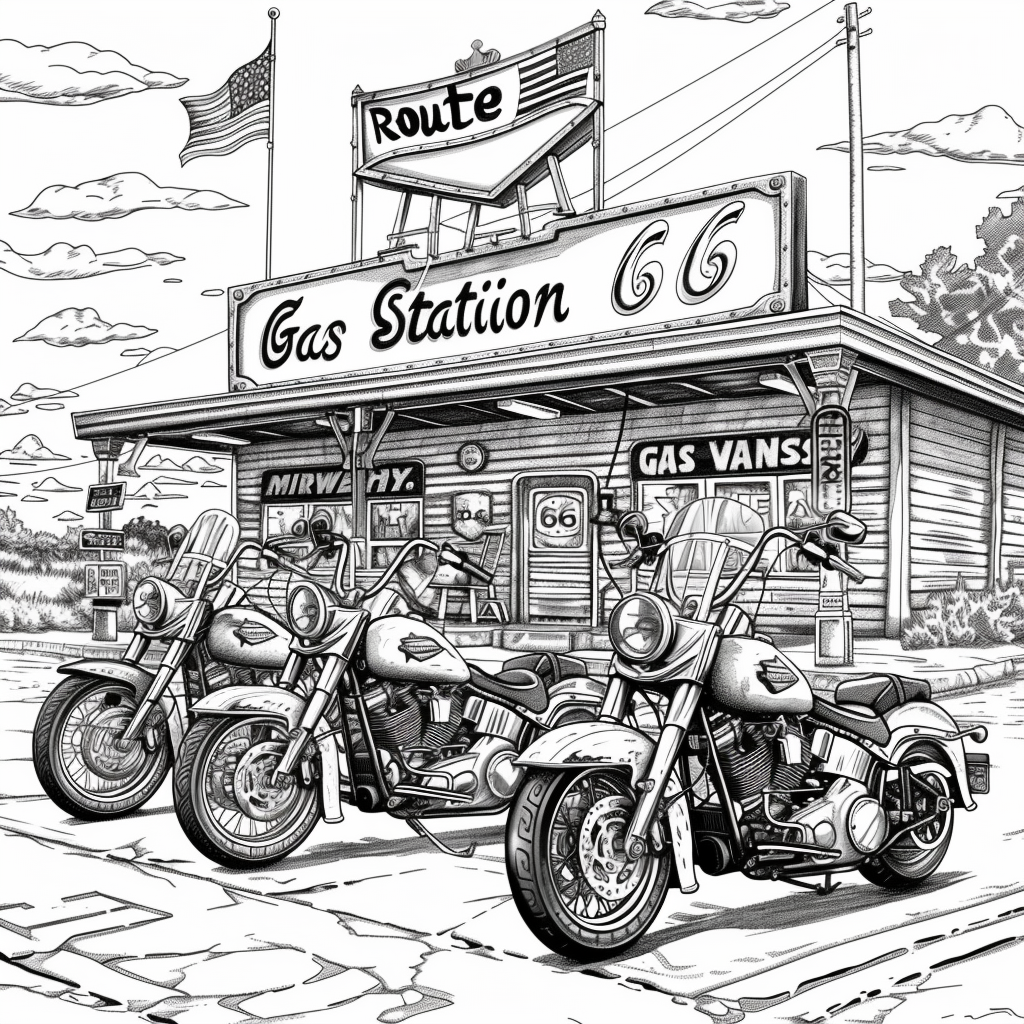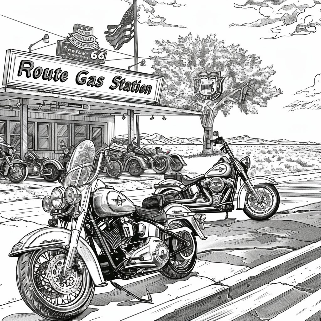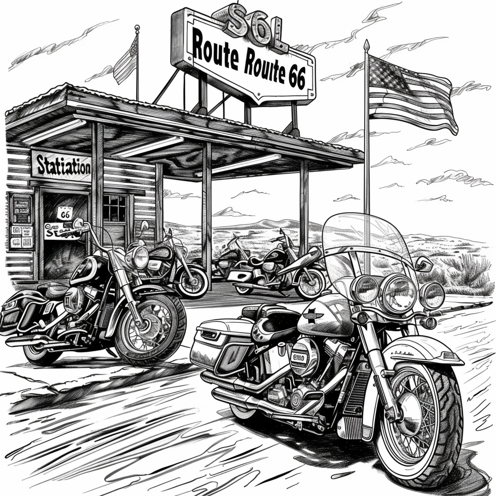 A nostalgic tribute to the golden age of American road travel, this artwork captures a classic gas station along historic Route 66, where chrome gleams under desert skies and the Stars and Stripes flutter proudly in the wind. Vintage Harley-Davidsons line the cracked pavement, their red-and-black paint jobs echoing the bold signage and retro charm of the station behind them. With dramatic skies, weathered wood, and timeless Americana vibes, this piece is perfect for lovers of the open road, motorcycle culture, and vintage travel posters.