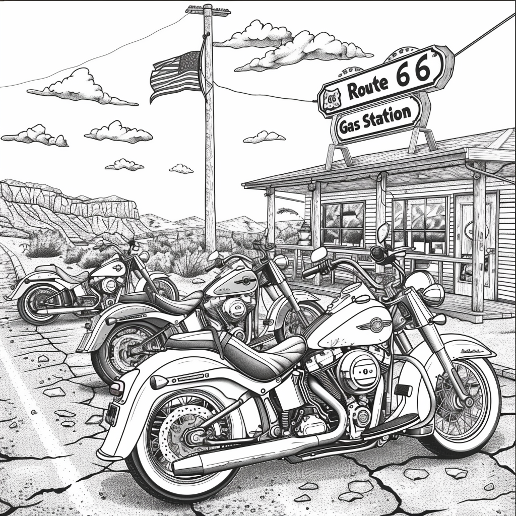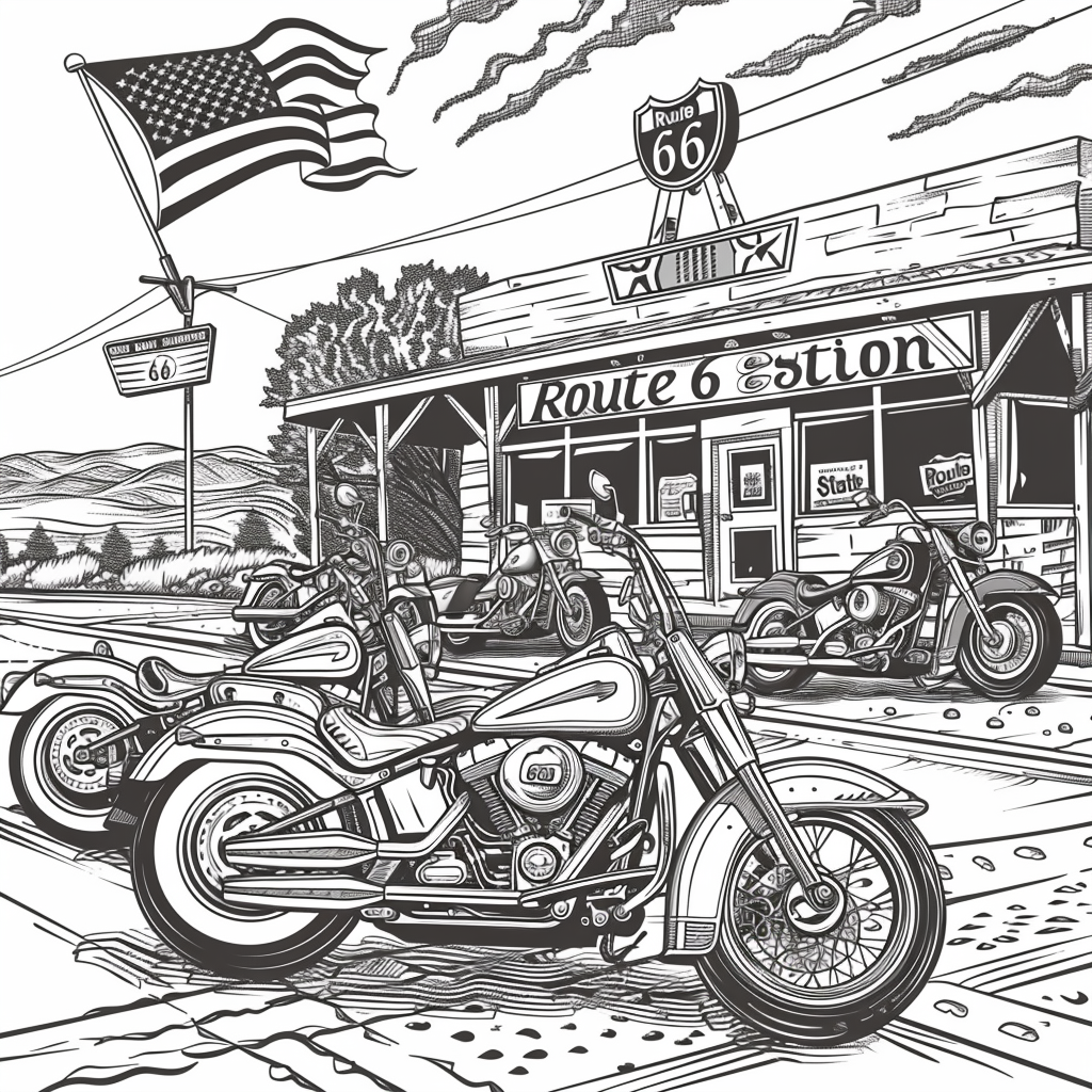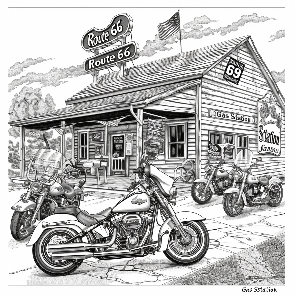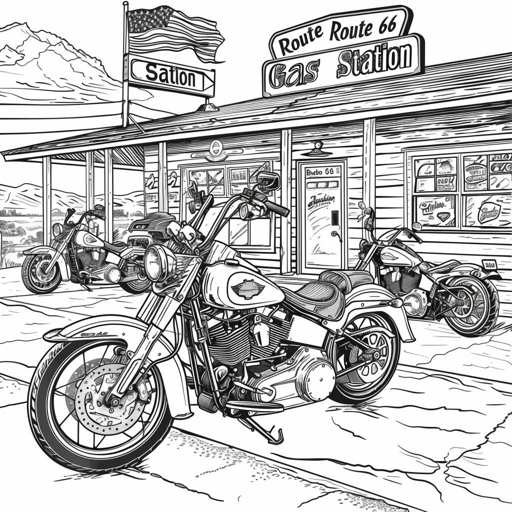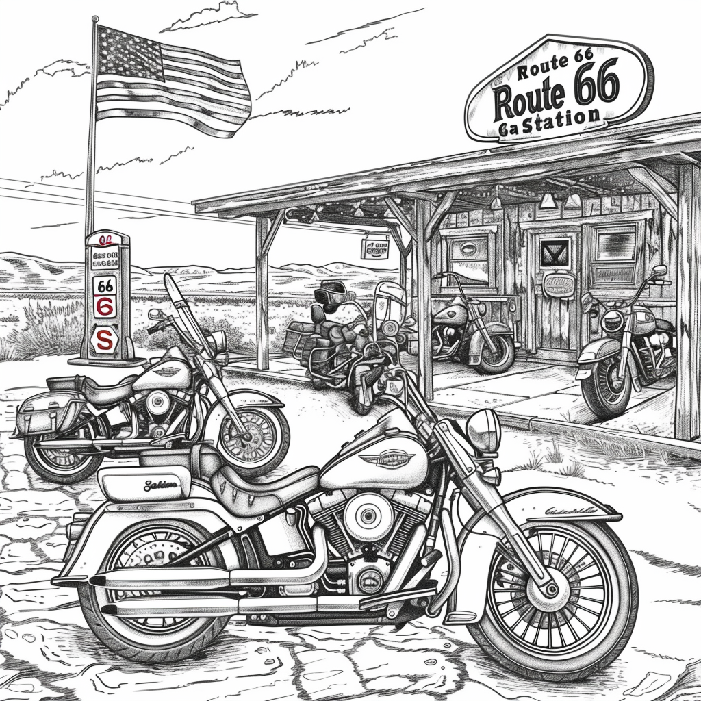 A nostalgic tribute to the golden age of American road travel, this artwork captures a classic gas station along historic Route 66, where chrome gleams under desert skies and the Stars and Stripes flutter proudly in the wind. Vintage Harley-Davidsons line the cracked pavement, their red-and-black paint jobs echoing the bold signage and retro charm of the station behind them. With dramatic skies, weathered wood, and timeless Americana vibes, this piece is perfect for lovers of the open road, motorcycle culture, and vintage travel posters.