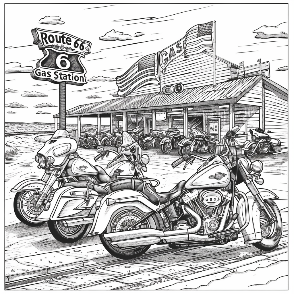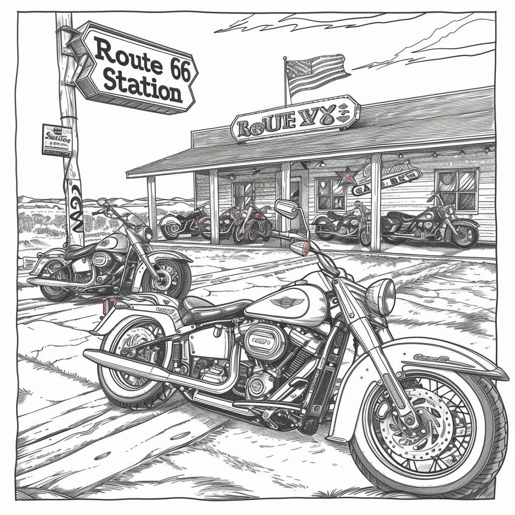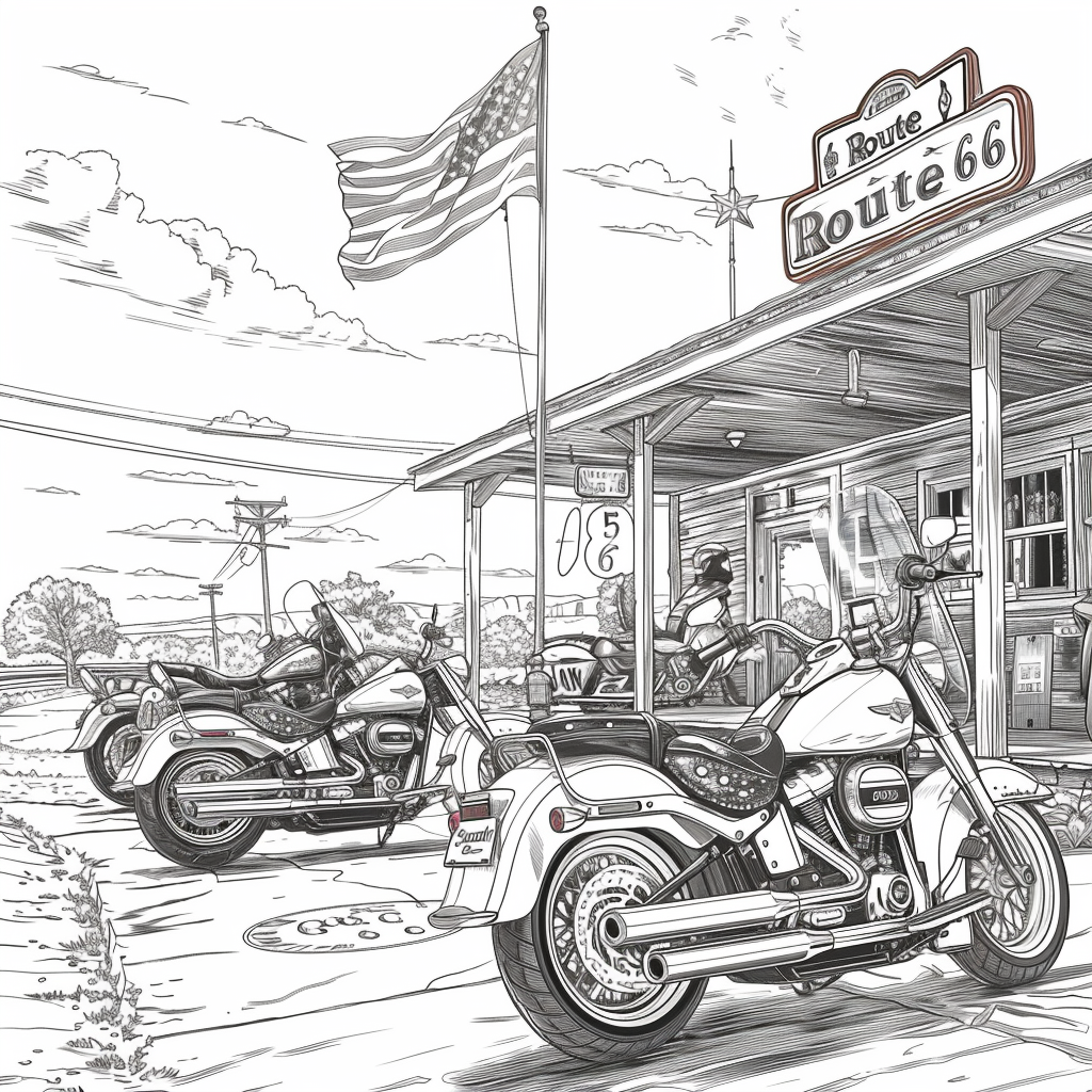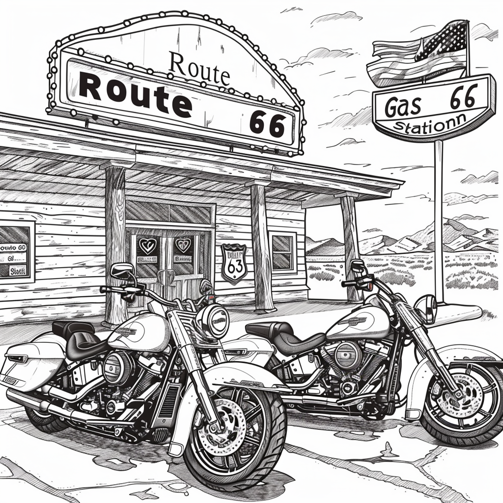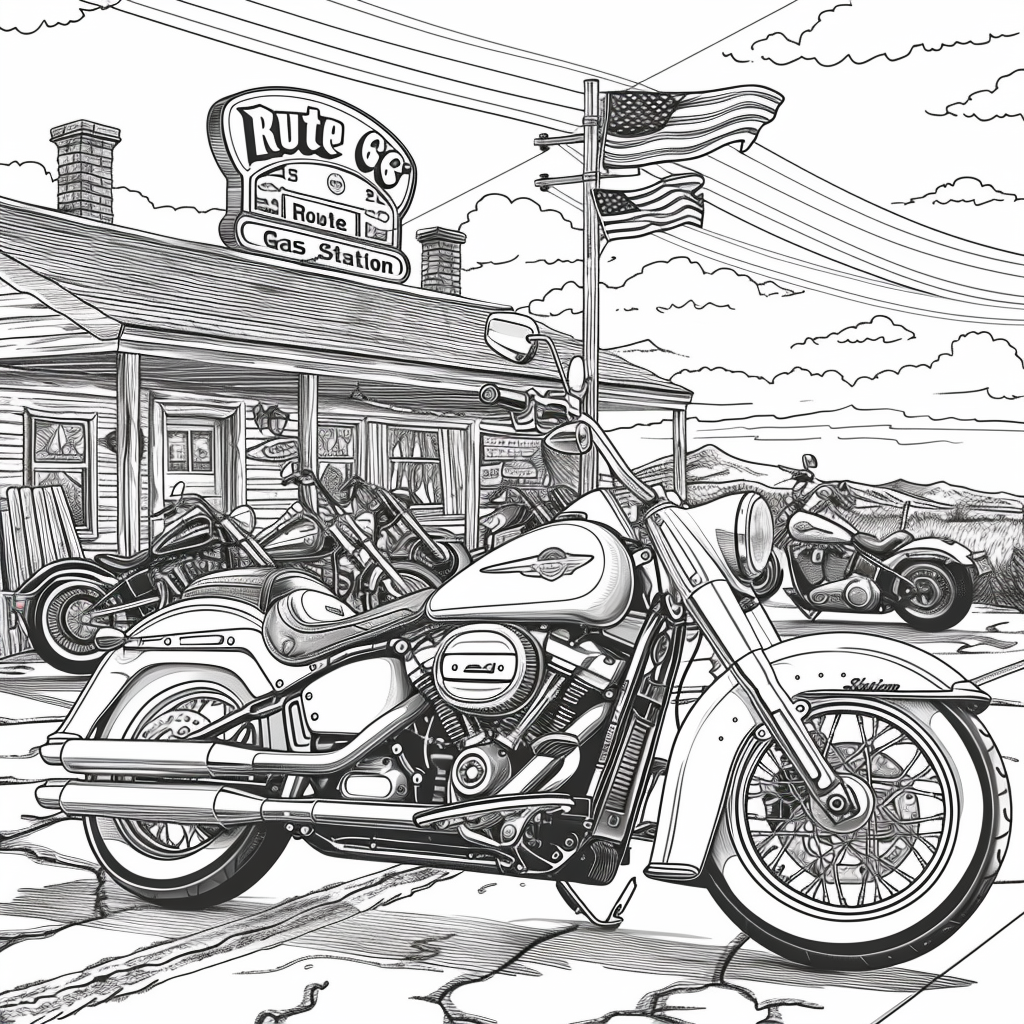 A nostalgic tribute to the golden age of American road travel, this artwork captures a classic gas station along historic Route 66, where chrome gleams under desert skies and the Stars and Stripes flutter proudly in the wind. Vintage Harley-Davidsons line the cracked pavement, their red-and-black paint jobs echoing the bold signage and retro charm of the station behind them. With dramatic skies, weathered wood, and timeless Americana vibes, this piece is perfect for lovers of the open road, motorcycle culture, and vintage travel posters.