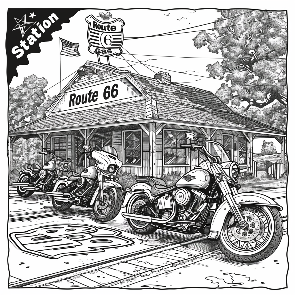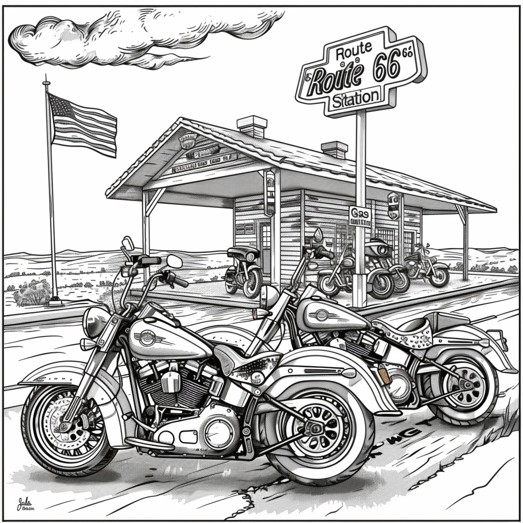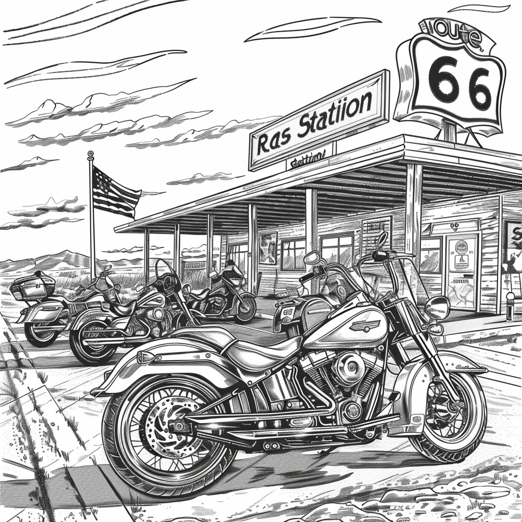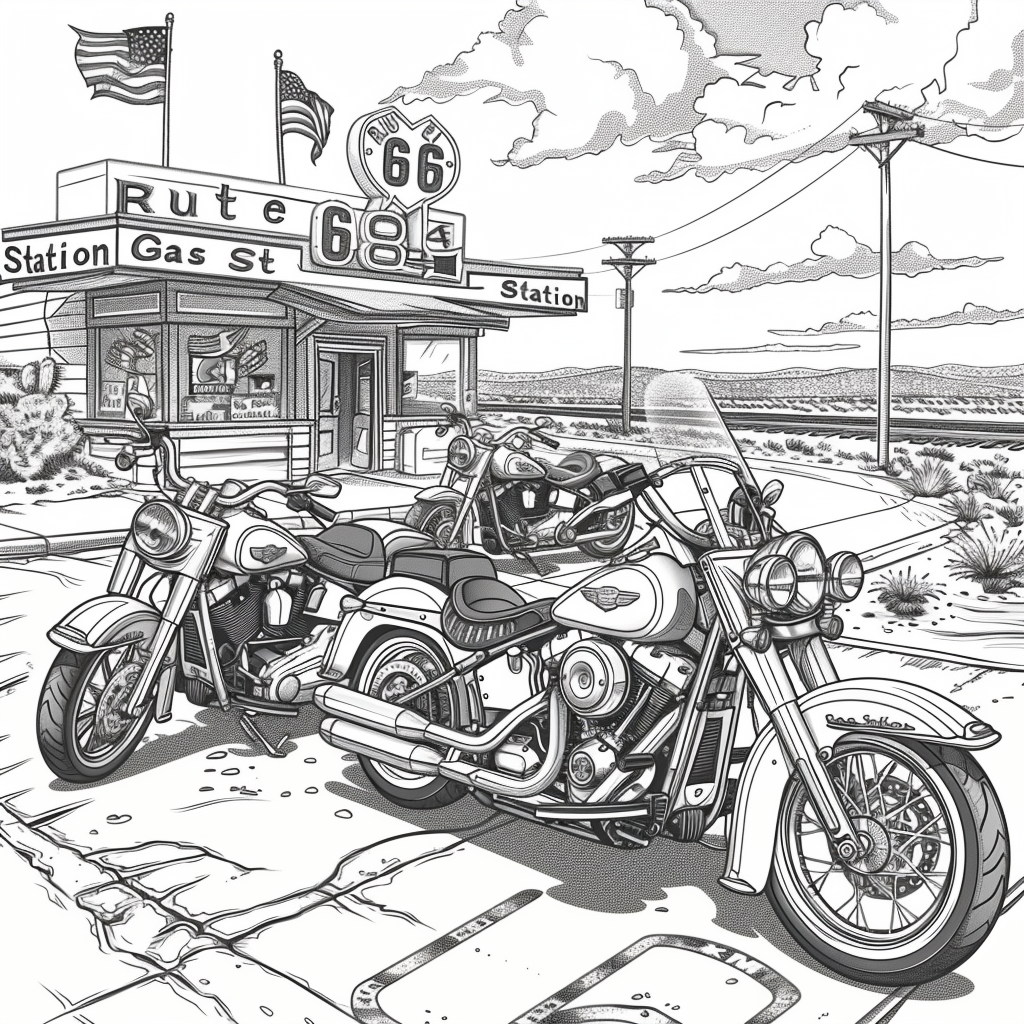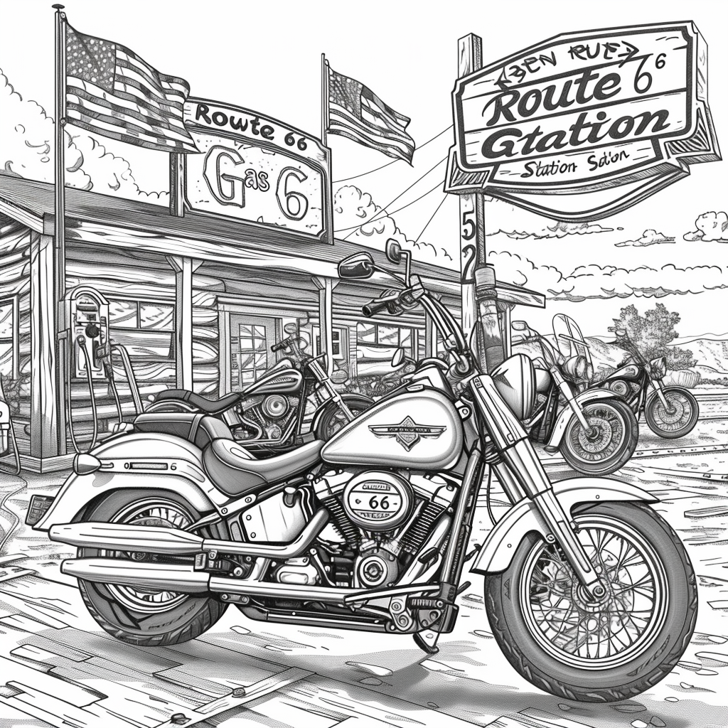 A nostalgic tribute to the golden age of American road travel, this artwork captures a classic gas station along historic Route 66, where chrome gleams under desert skies and the Stars and Stripes flutter proudly in the wind. Vintage Harley-Davidsons line the cracked pavement, their red-and-black paint jobs echoing the bold signage and retro charm of the station behind them. With dramatic skies, weathered wood, and timeless Americana vibes, this piece is perfect for lovers of the open road, motorcycle culture, and vintage travel posters.