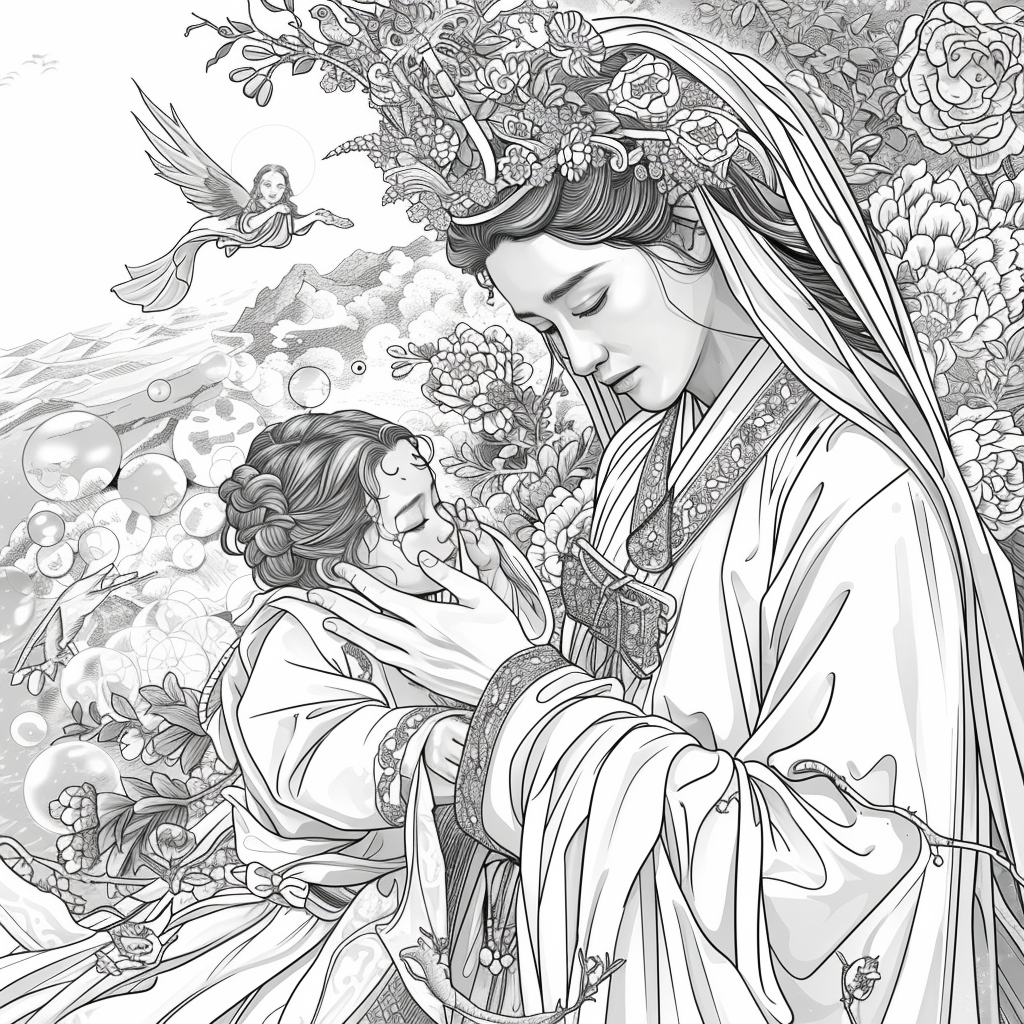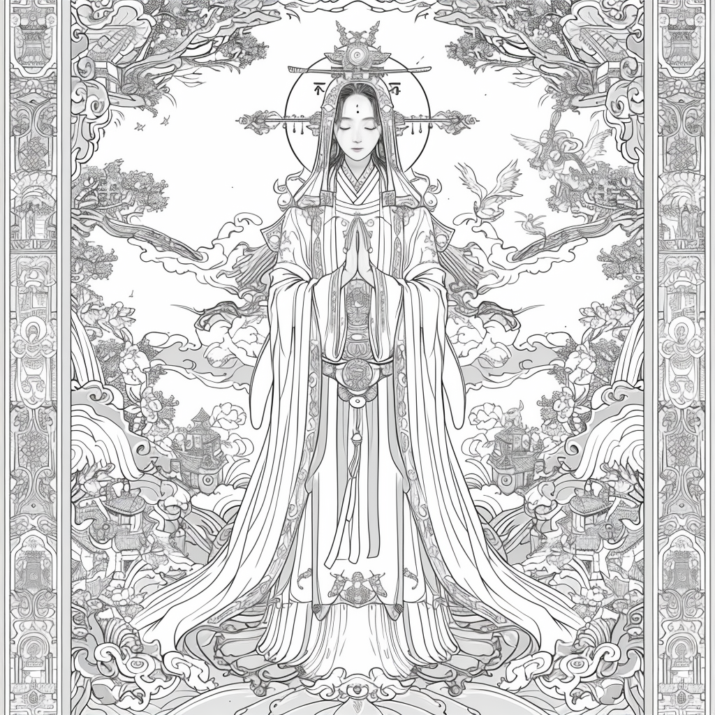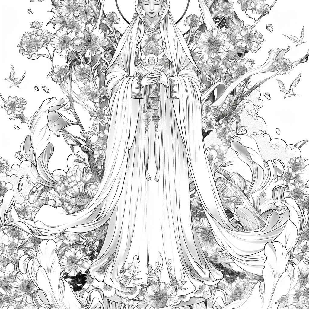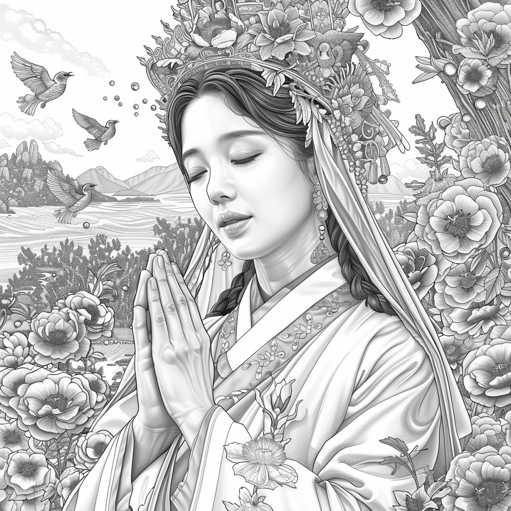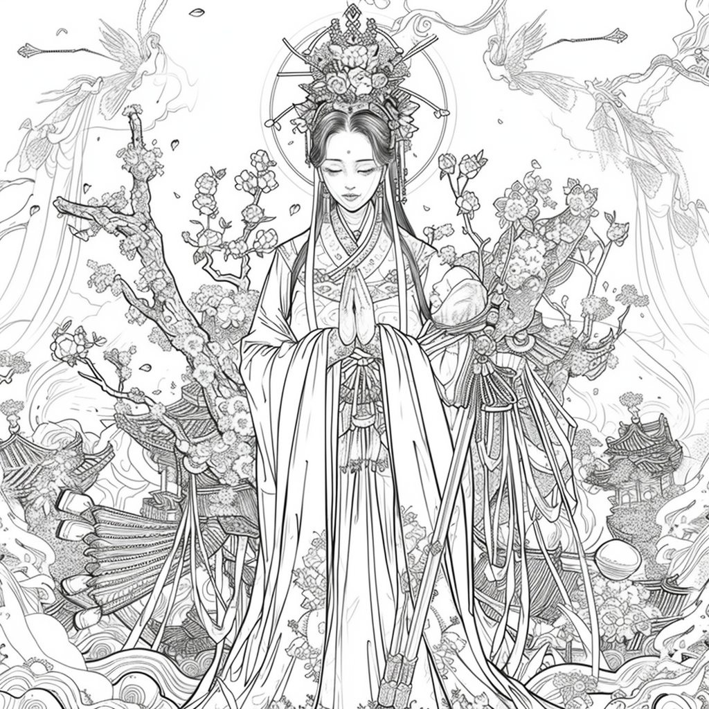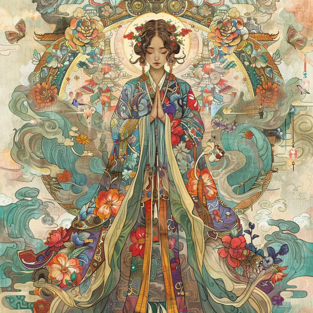 Wrapped in a tapestry of blooming splendor, the Floral Oracle stands in serene prayer, surrounded by swirls of mist and celestial ornamentation. Her robes flow like petals in the wind—each layer embroidered with vibrant flowers, flowing waves, and sacred motifs. A glowing halo frames her gentle face, while butterflies and lanterns dance in the air, hinting at divine presence and spiritual awakening. With elegance rooted in tradition and nature, she represents the harmonious balance between inner peace and outer beauty—a guardian of wisdom, prayer, and renewal.