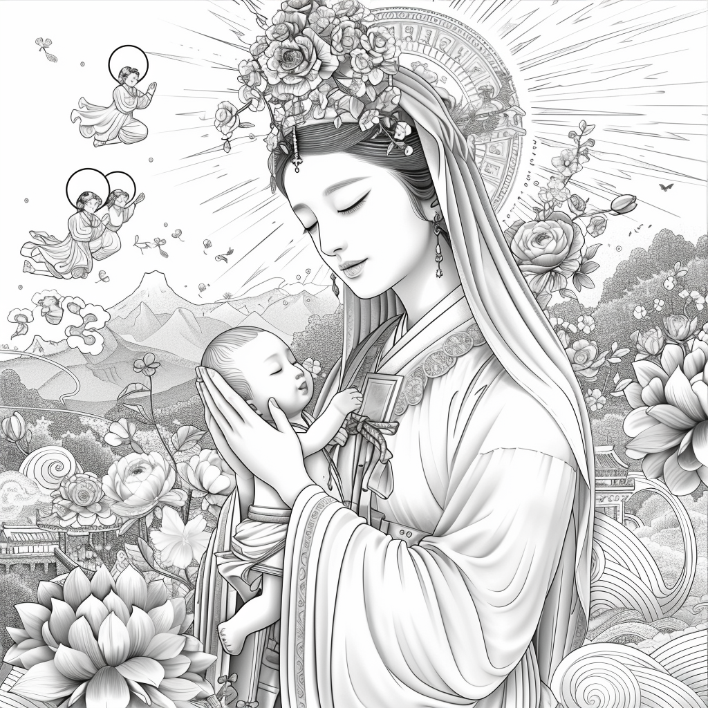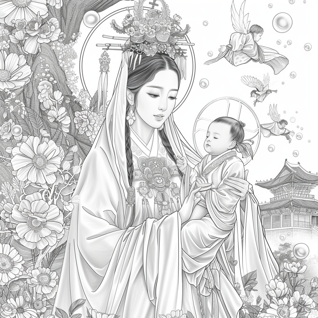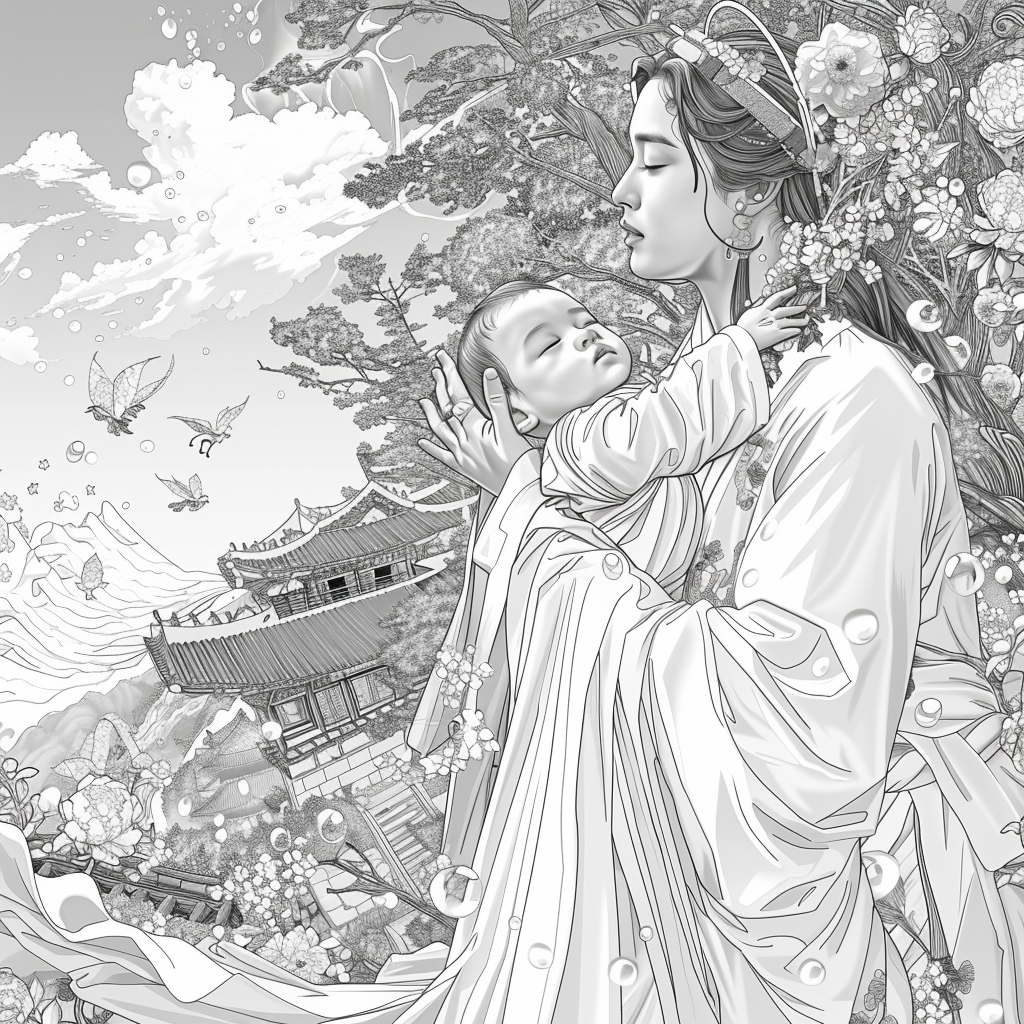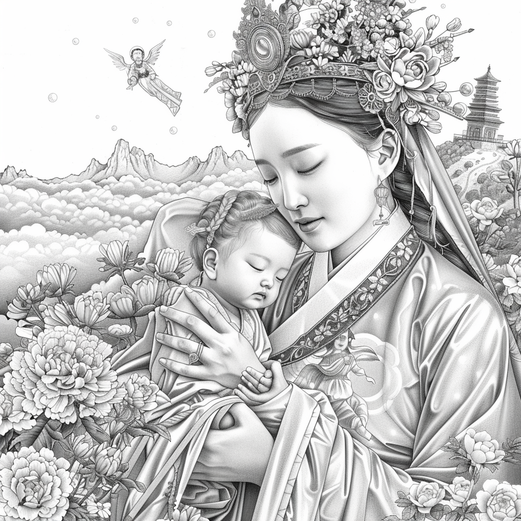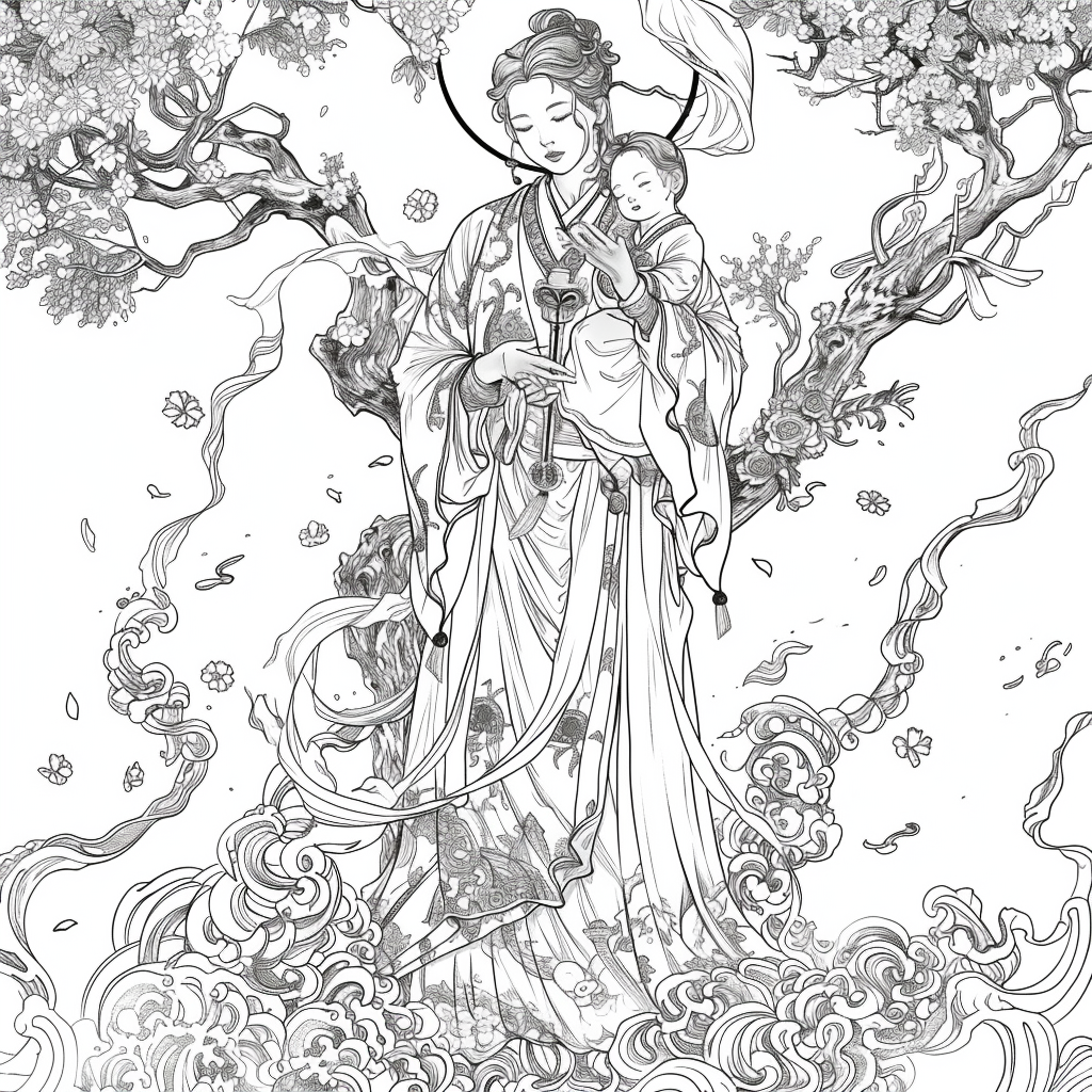 Wrapped in a tapestry of blooming splendor, the Floral Oracle stands in serene prayer, surrounded by swirls of mist and celestial ornamentation. Her robes flow like petals in the wind—each layer embroidered with vibrant flowers, flowing waves, and sacred motifs. A glowing halo frames her gentle face, while butterflies and lanterns dance in the air, hinting at divine presence and spiritual awakening. With elegance rooted in tradition and nature, she represents the harmonious balance between inner peace and outer beauty—a guardian of wisdom, prayer, and renewal.