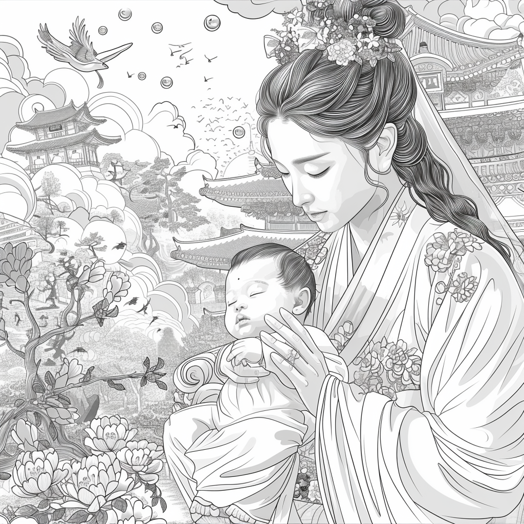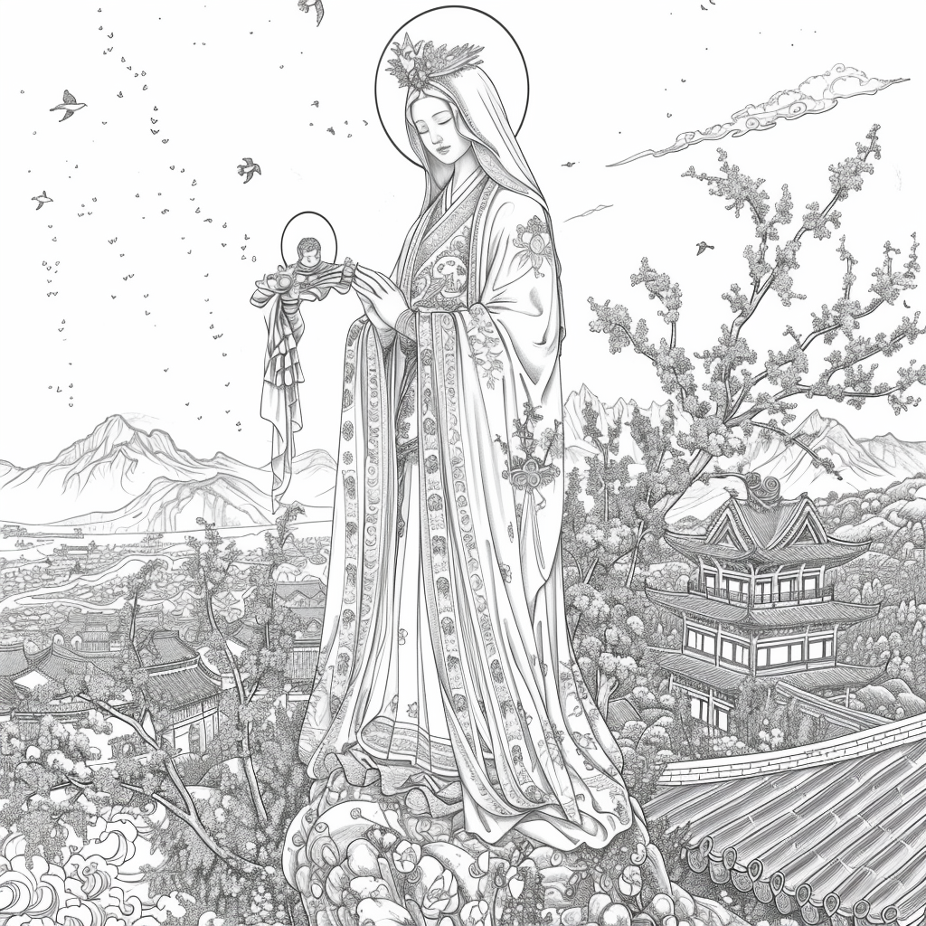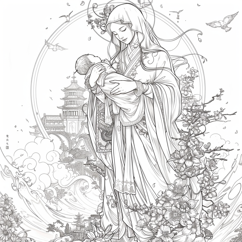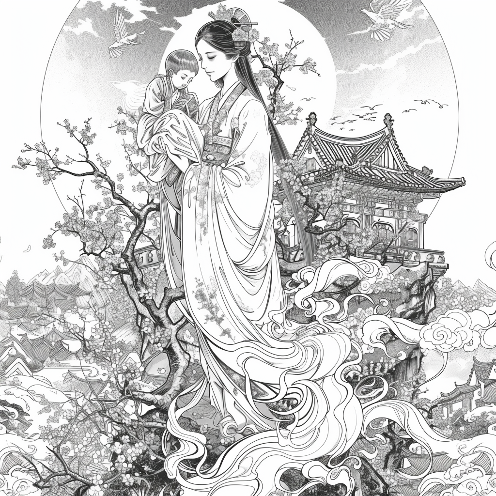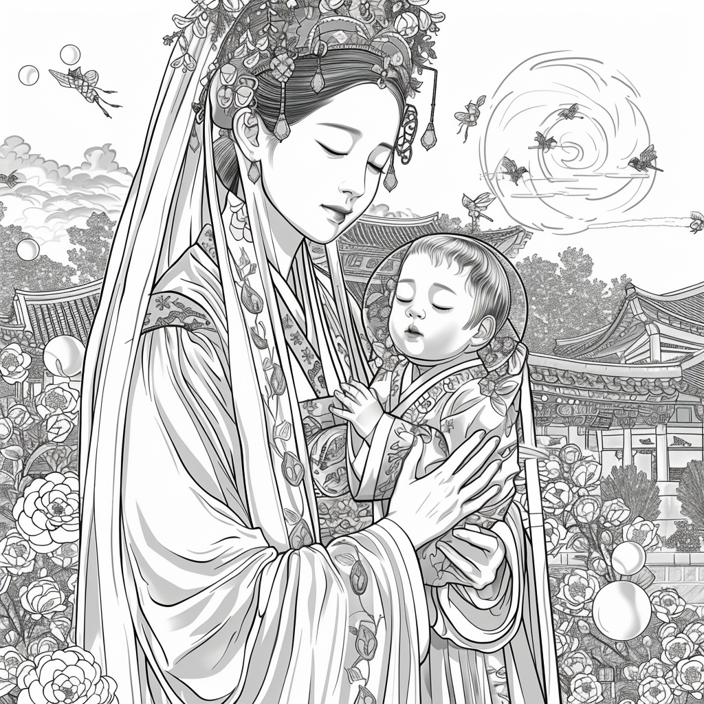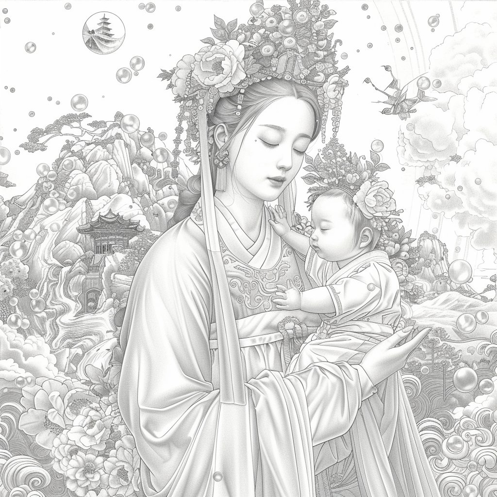 Wrapped in a tapestry of blooming splendor, the Floral Oracle stands in serene prayer, surrounded by swirls of mist and celestial ornamentation. Her robes flow like petals in the wind—each layer embroidered with vibrant flowers, flowing waves, and sacred motifs. A glowing halo frames her gentle face, while butterflies and lanterns dance in the air, hinting at divine presence and spiritual awakening. With elegance rooted in tradition and nature, she represents the harmonious balance between inner peace and outer beauty—a guardian of wisdom, prayer, and renewal.