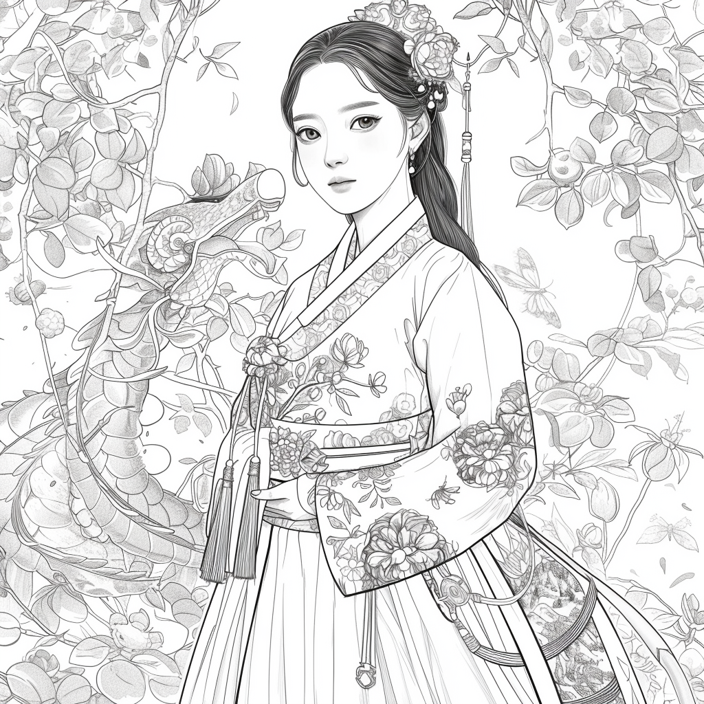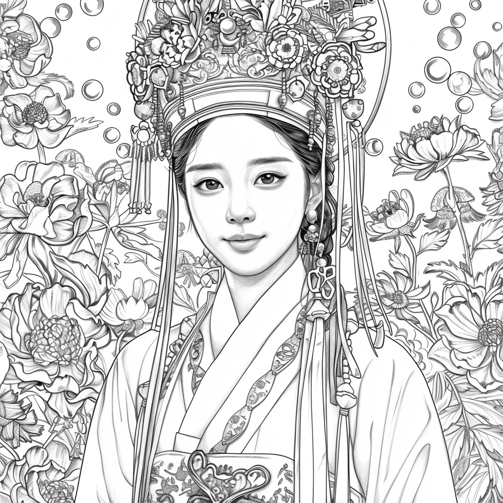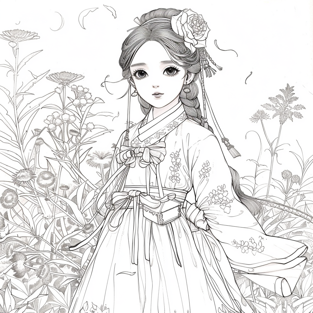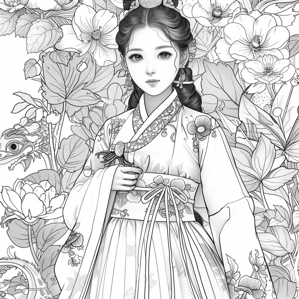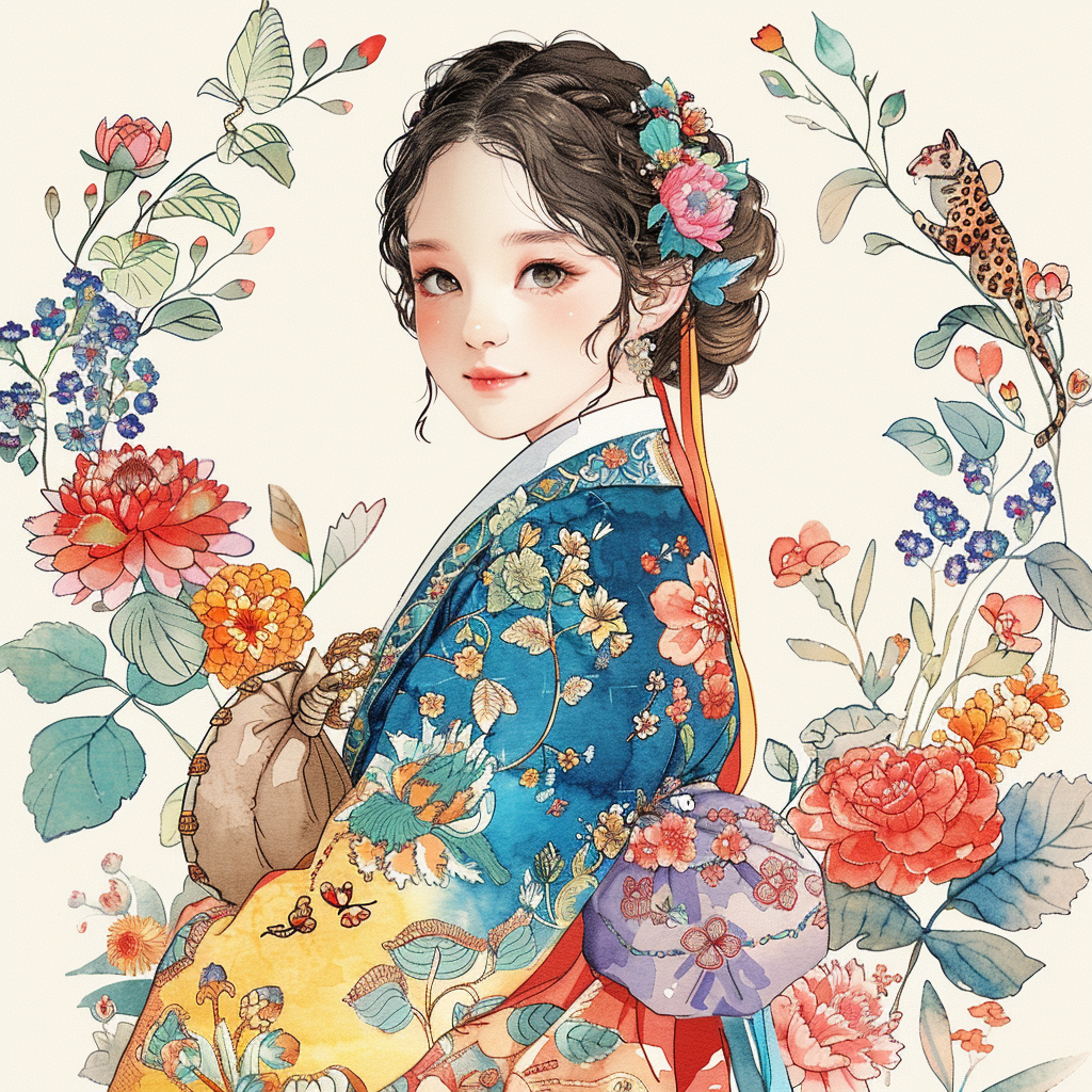 A charming young maiden dressed in a richly embroidered hanbok of deep blue and golden yellow stands amidst a cascade of vibrant flowers. Her hair, adorned with delicate blossoms, frames her gentle smile. A small leopard spirit peers from the floral branches, symbolizing courage and grace. The intricate floral motifs on her attire blend seamlessly with the surrounding blooms, creating a harmonious vision of beauty, nature, and quiet strength.
