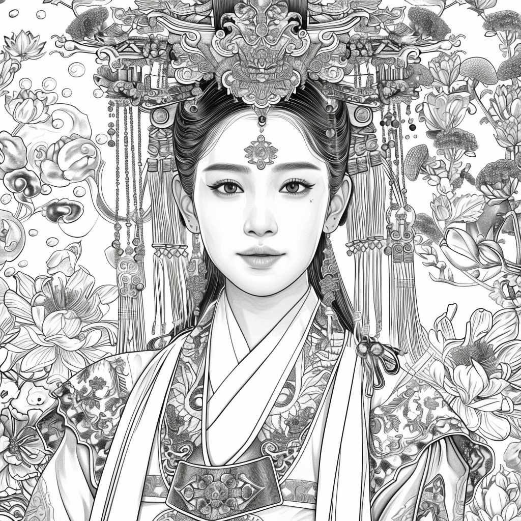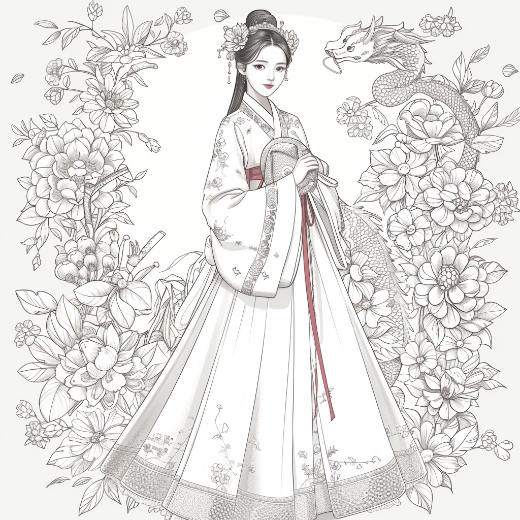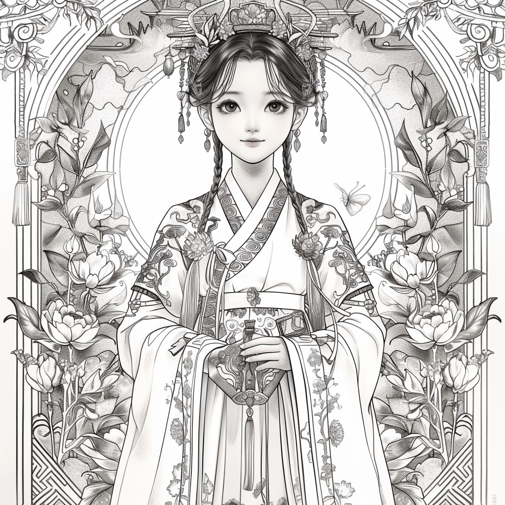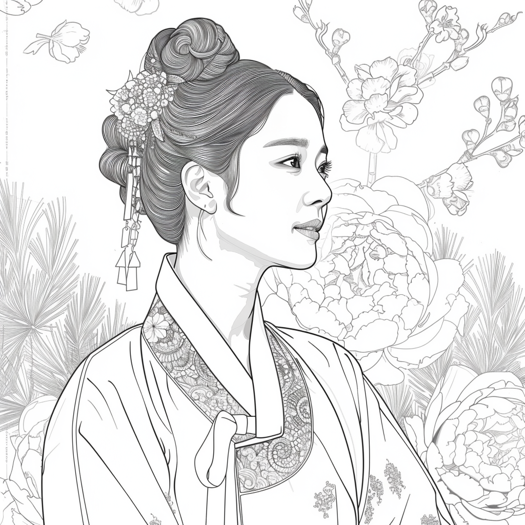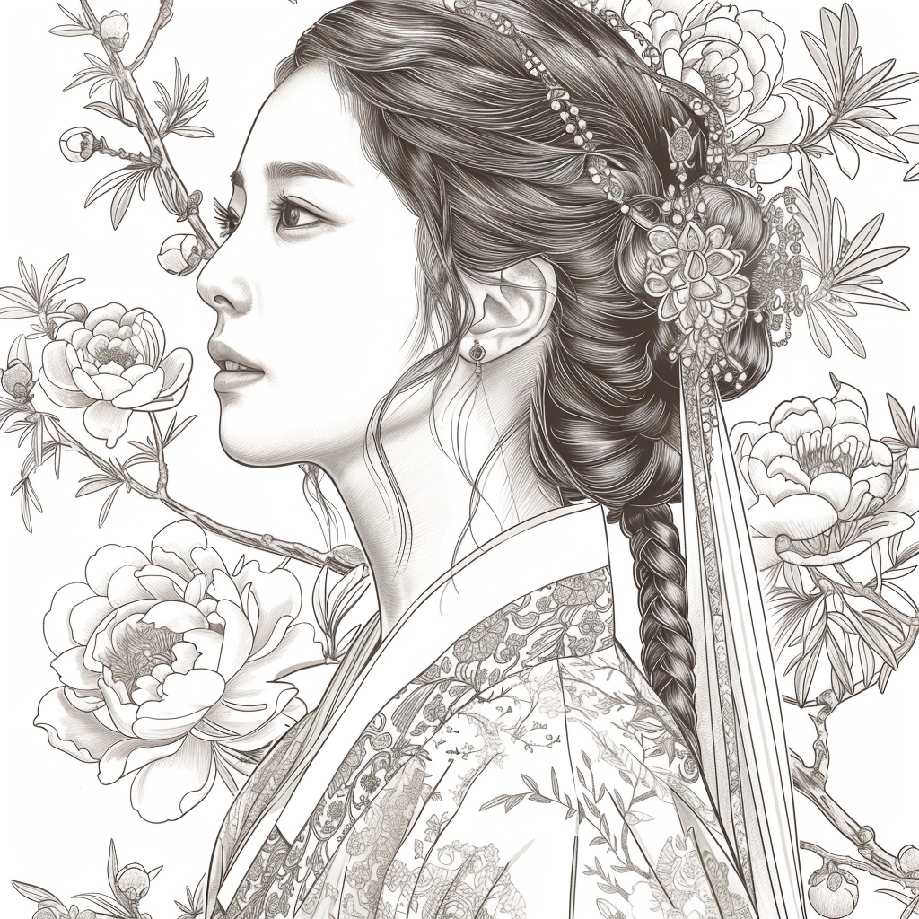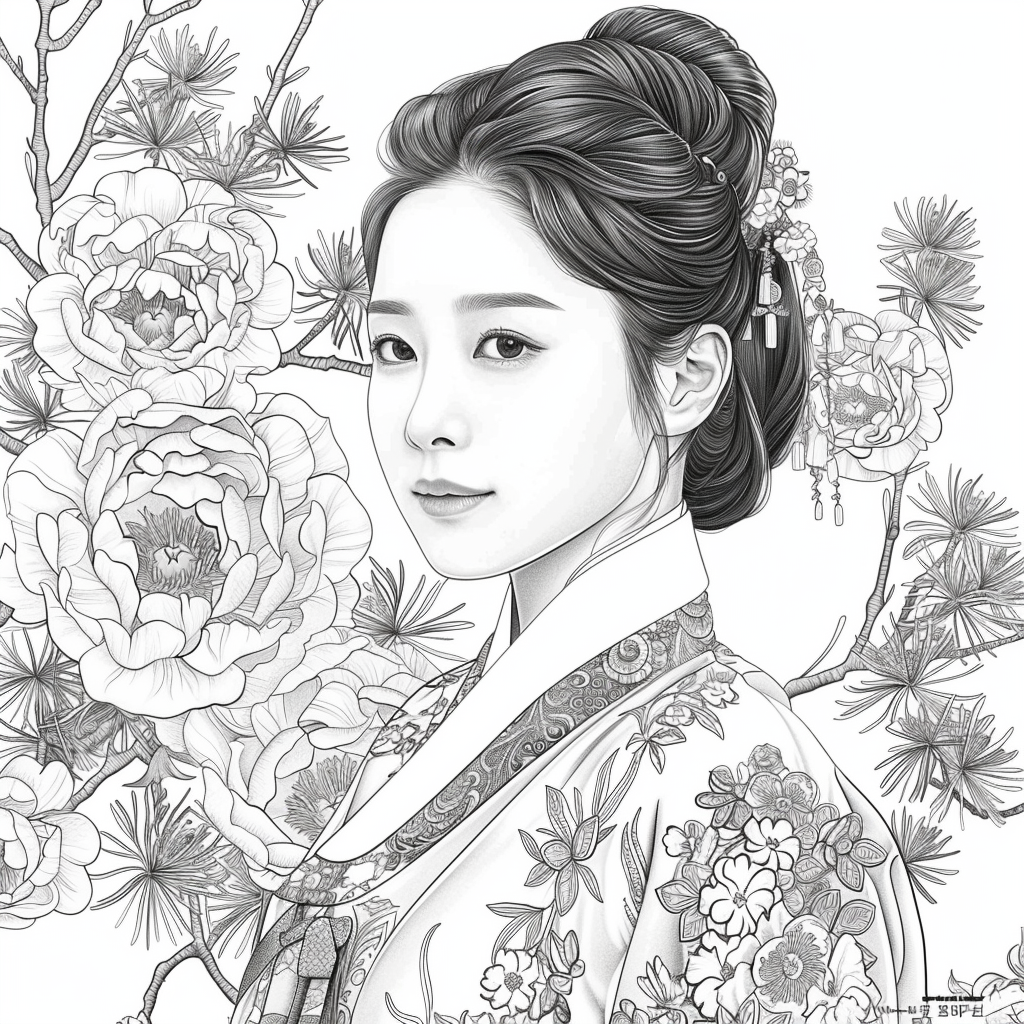 A charming young maiden dressed in a richly embroidered hanbok of deep blue and golden yellow stands amidst a cascade of vibrant flowers. Her hair, adorned with delicate blossoms, frames her gentle smile. A small leopard spirit peers from the floral branches, symbolizing courage and grace. The intricate floral motifs on her attire blend seamlessly with the surrounding blooms, creating a harmonious vision of beauty, nature, and quiet strength.