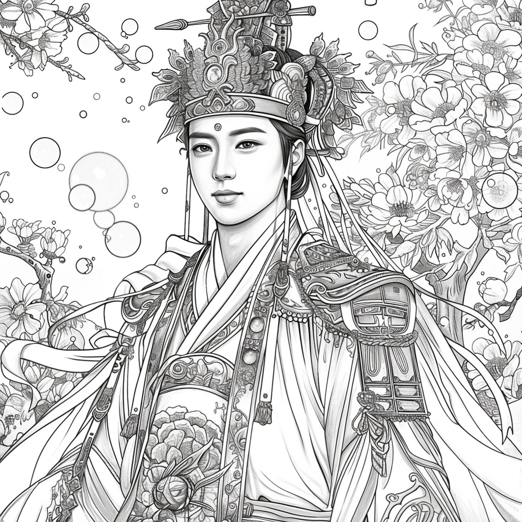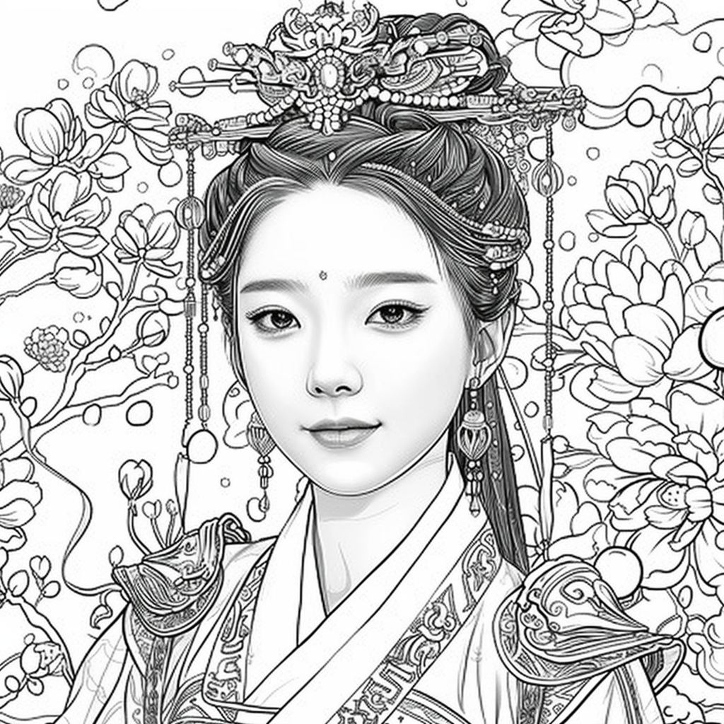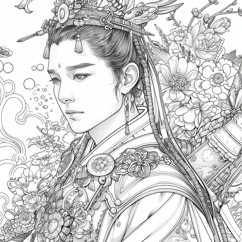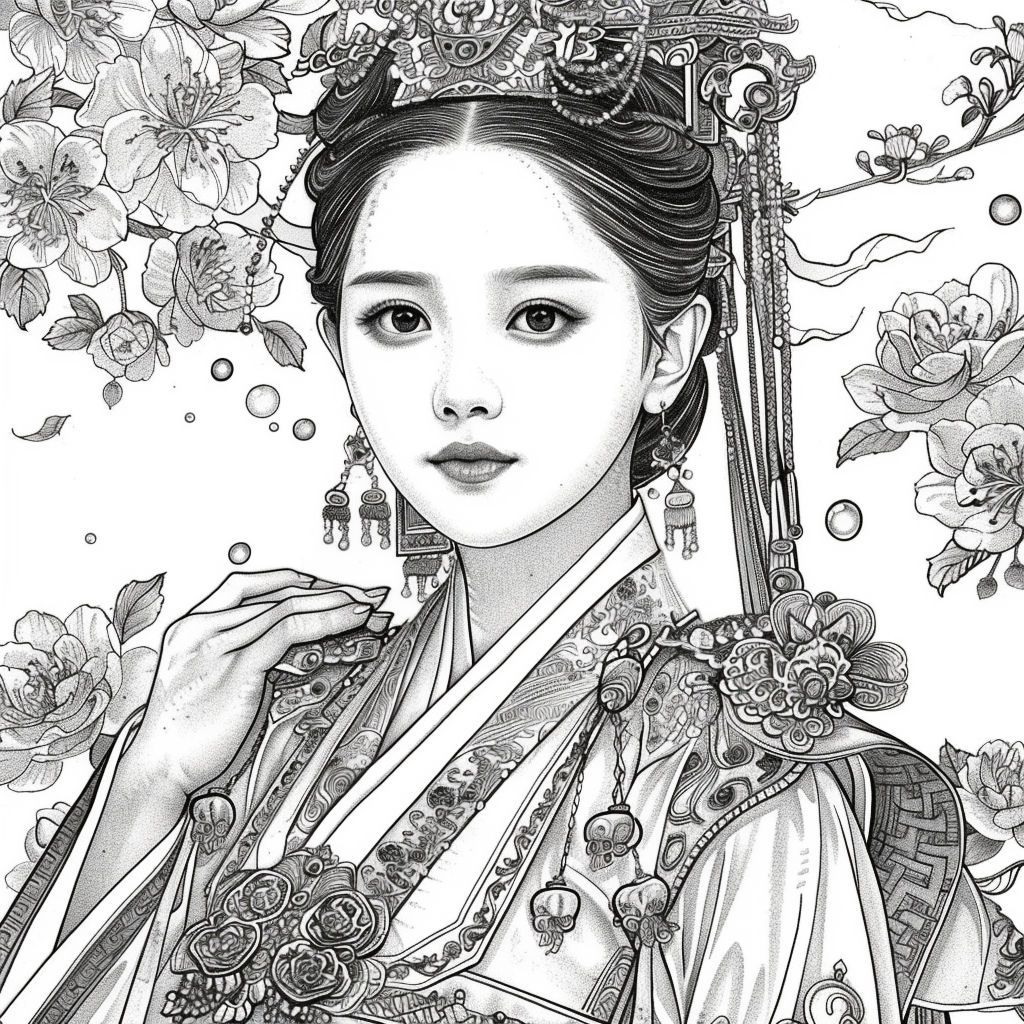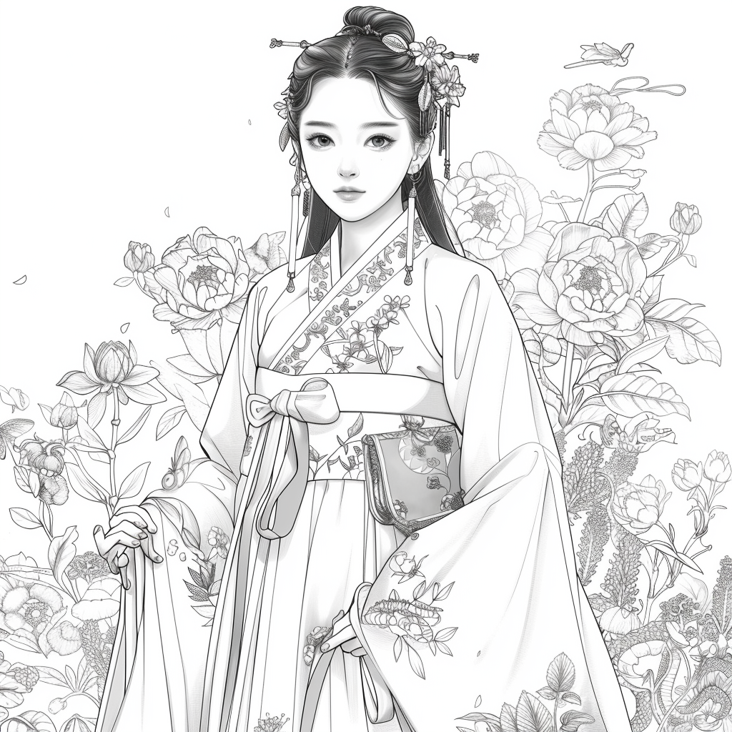A charming young maiden dressed in a richly embroidered hanbok of deep blue and golden yellow stands amidst a cascade of vibrant flowers. Her hair, adorned with delicate blossoms, frames her gentle smile. A small leopard spirit peers from the floral branches, symbolizing courage and grace. The intricate floral motifs on her attire blend seamlessly with the surrounding blooms, creating a harmonious vision of beauty, nature, and quiet strength.