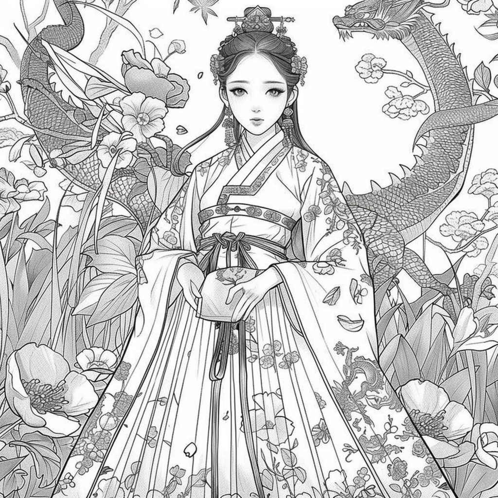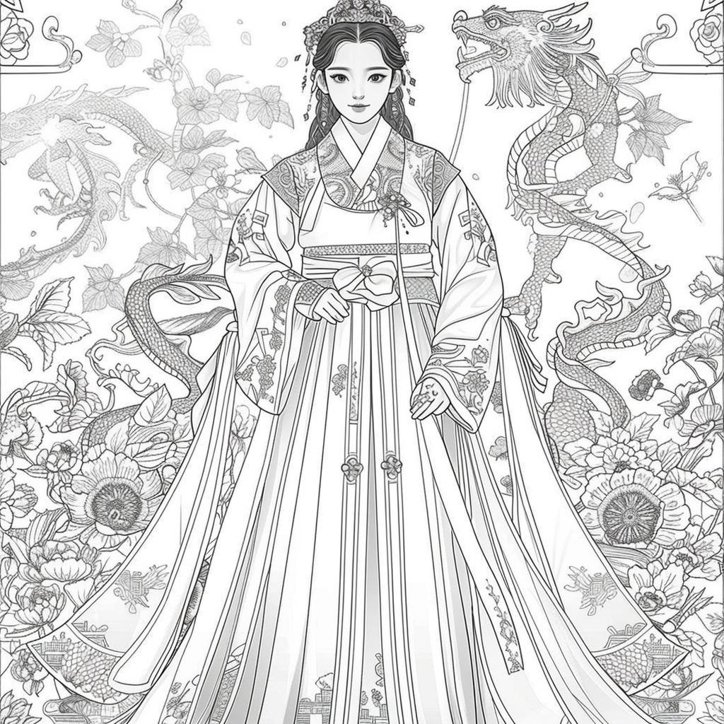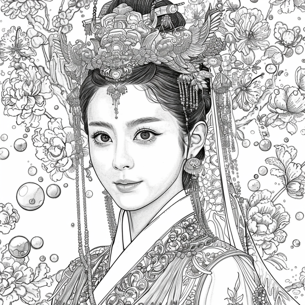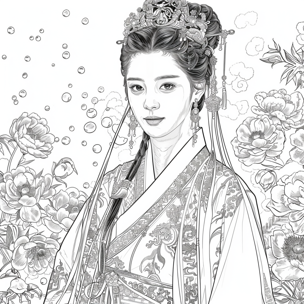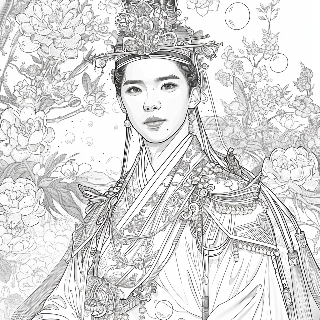 A charming young maiden dressed in a richly embroidered hanbok of deep blue and golden yellow stands amidst a cascade of vibrant flowers. Her hair, adorned with delicate blossoms, frames her gentle smile. A small leopard spirit peers from the floral branches, symbolizing courage and grace. The intricate floral motifs on her attire blend seamlessly with the surrounding blooms, creating a harmonious vision of beauty, nature, and quiet strength.