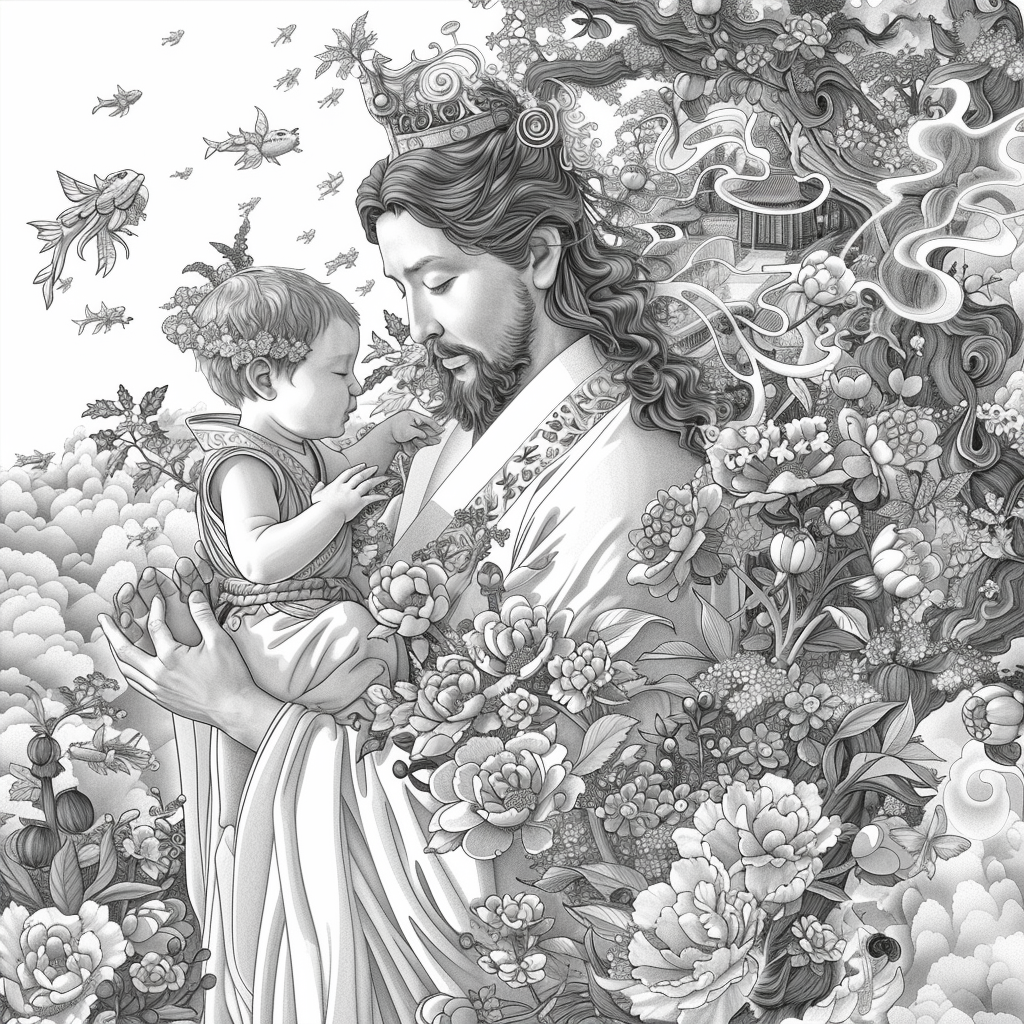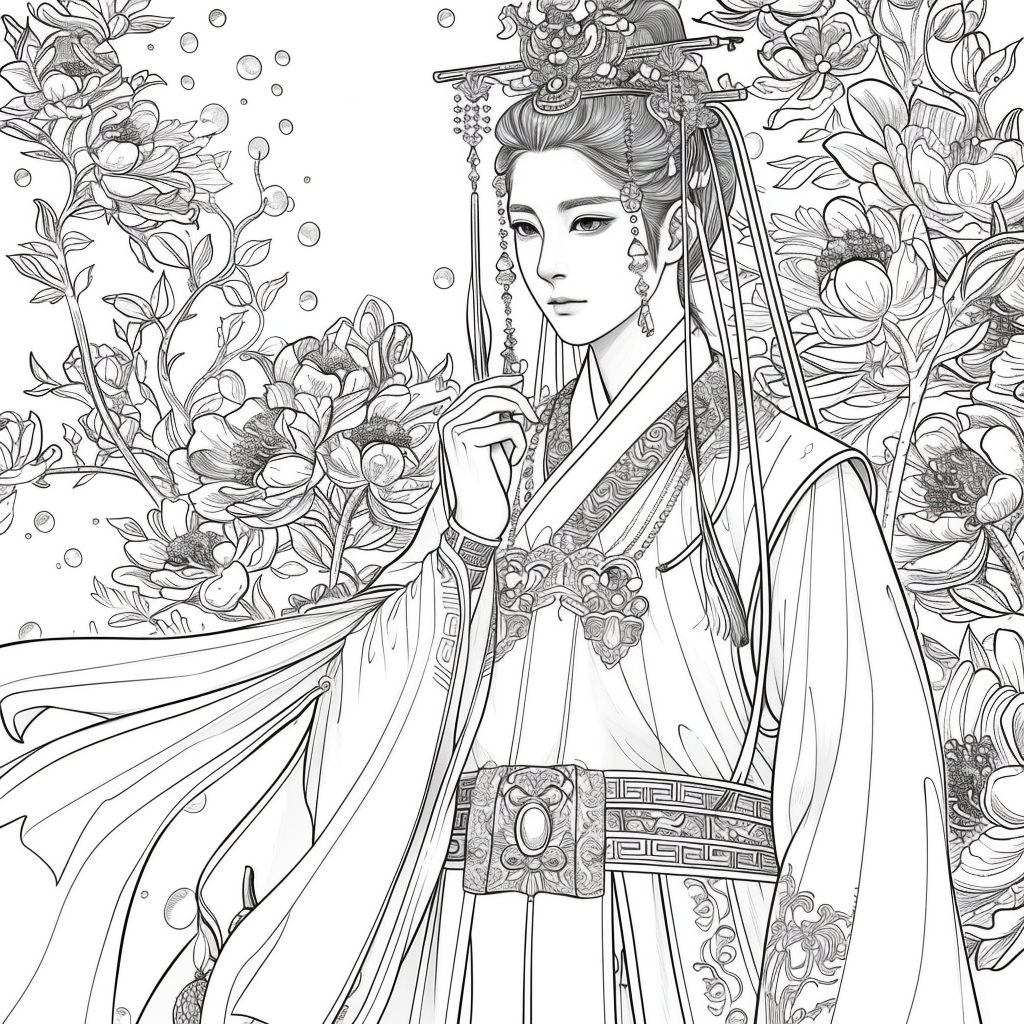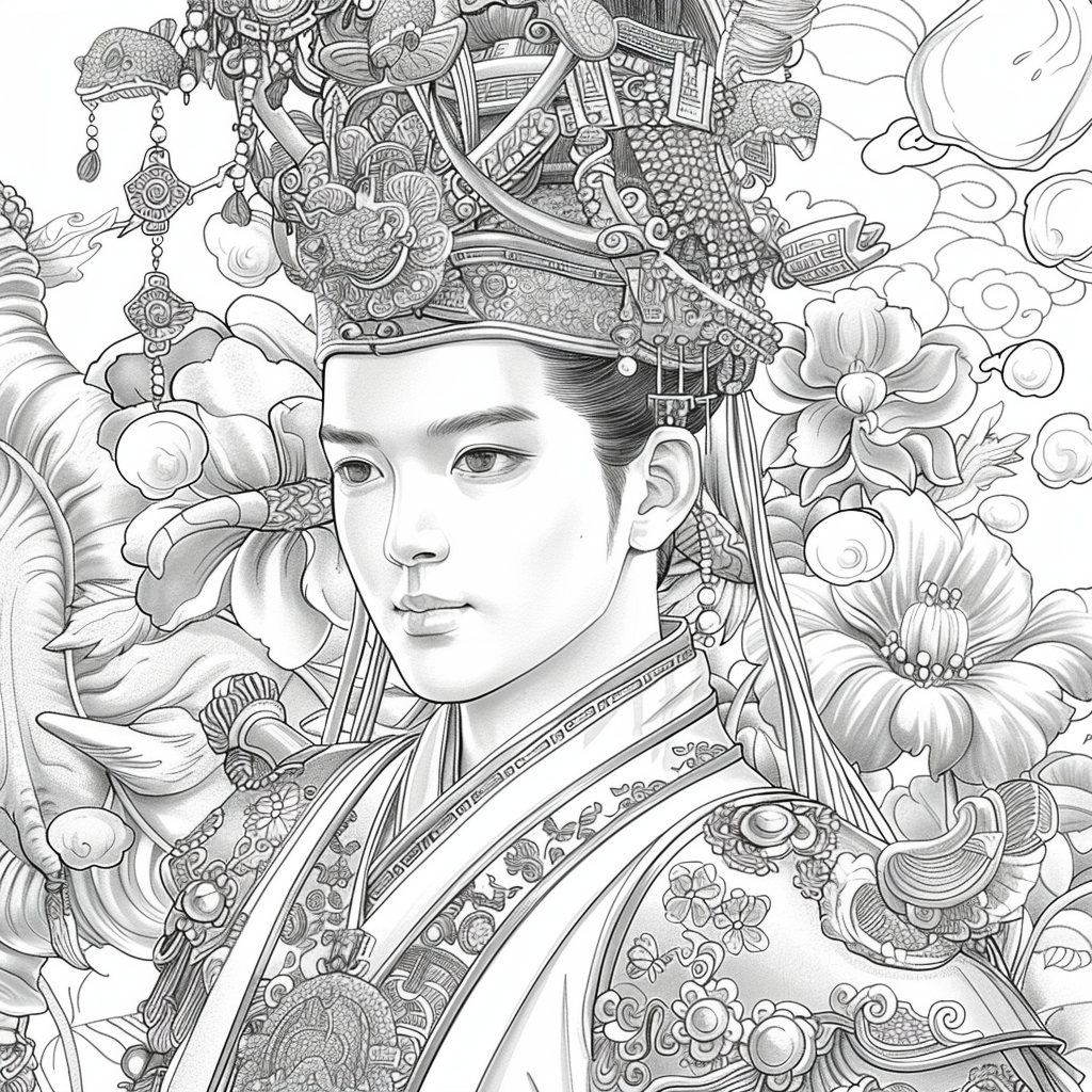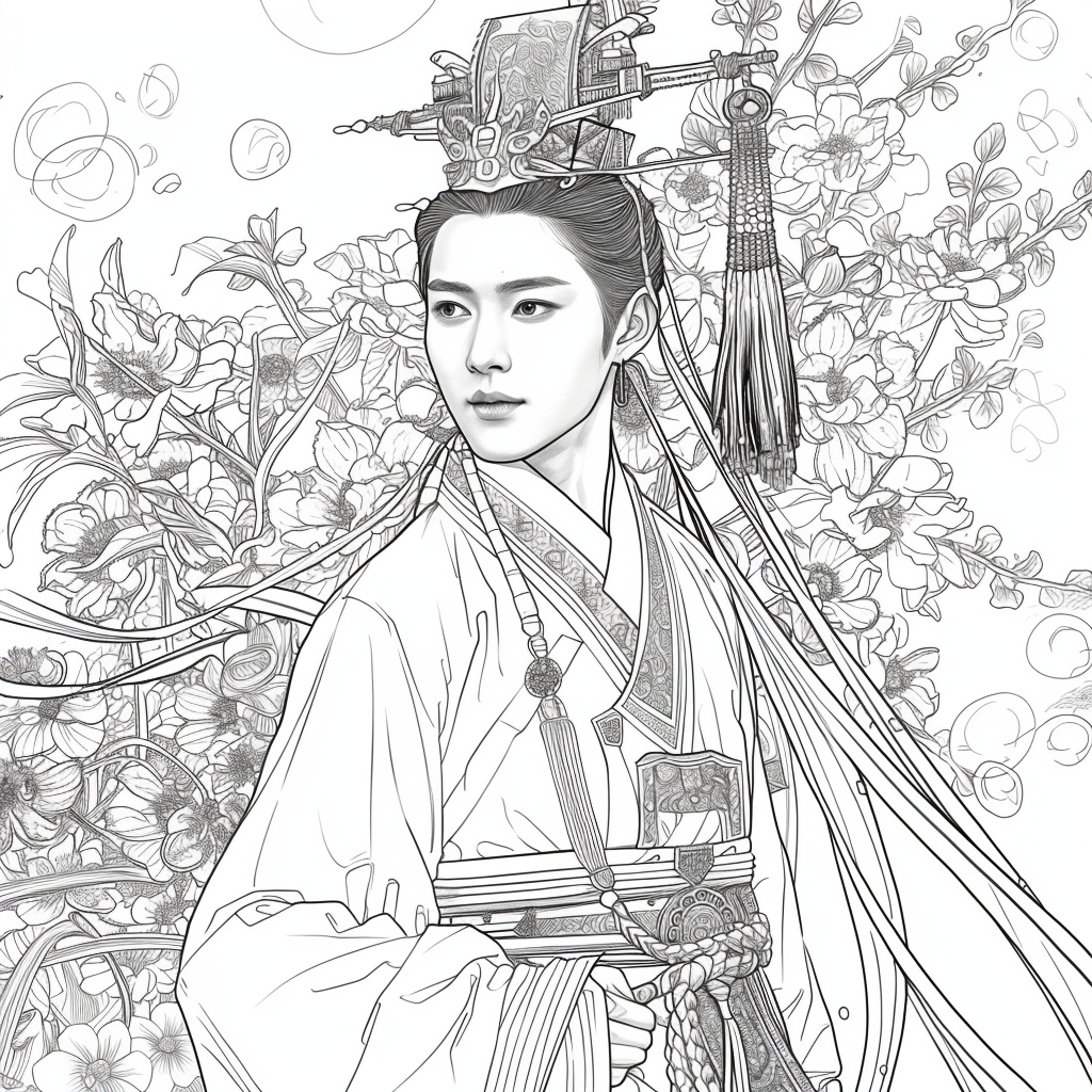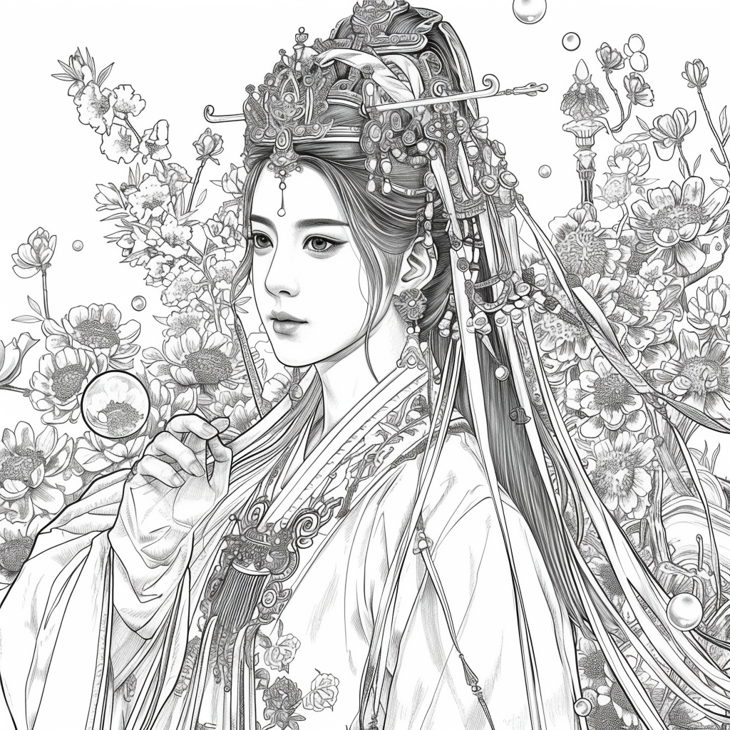 A charming young maiden dressed in a richly embroidered hanbok of deep blue and golden yellow stands amidst a cascade of vibrant flowers. Her hair, adorned with delicate blossoms, frames her gentle smile. A small leopard spirit peers from the floral branches, symbolizing courage and grace. The intricate floral motifs on her attire blend seamlessly with the surrounding blooms, creating a harmonious vision of beauty, nature, and quiet strength.