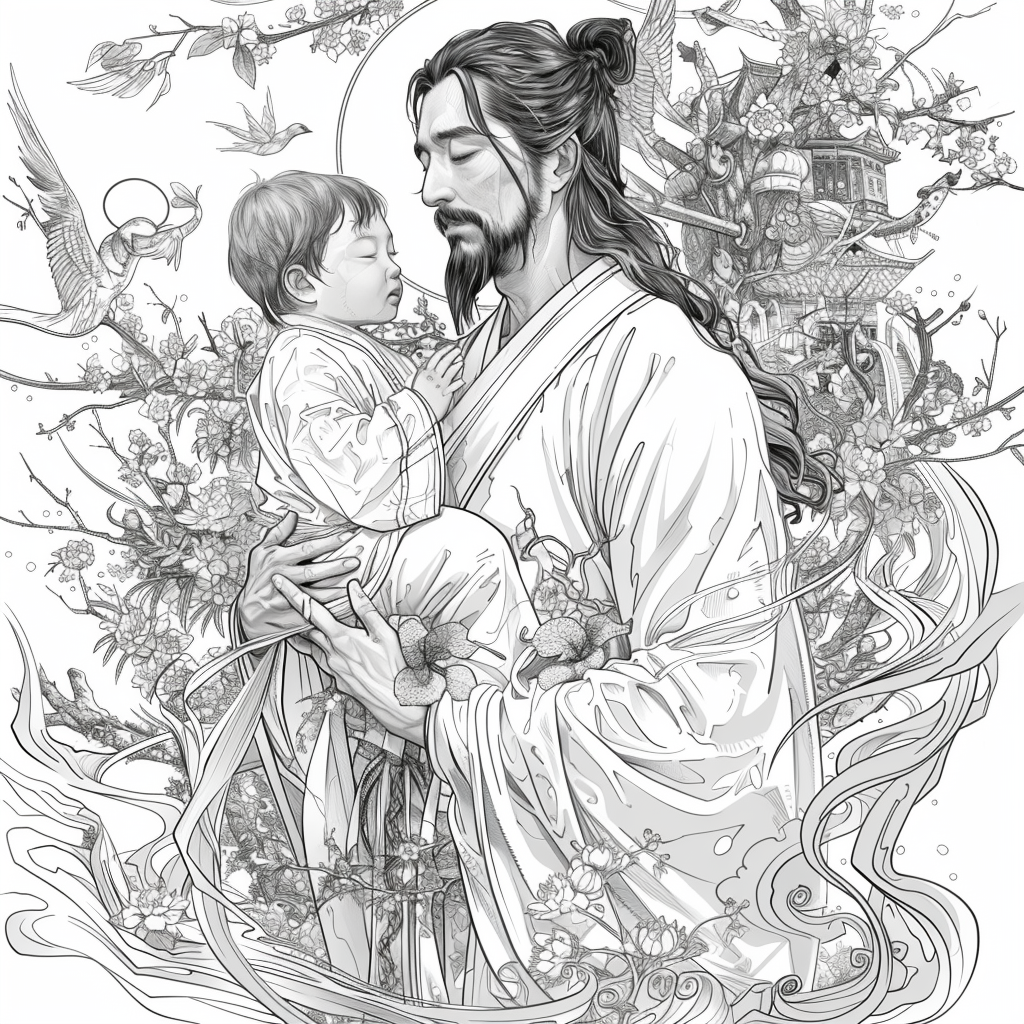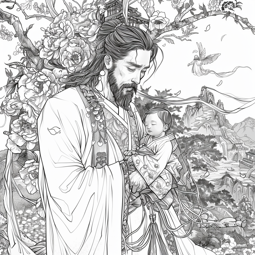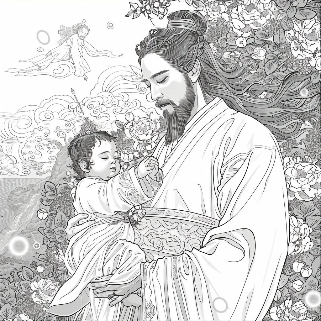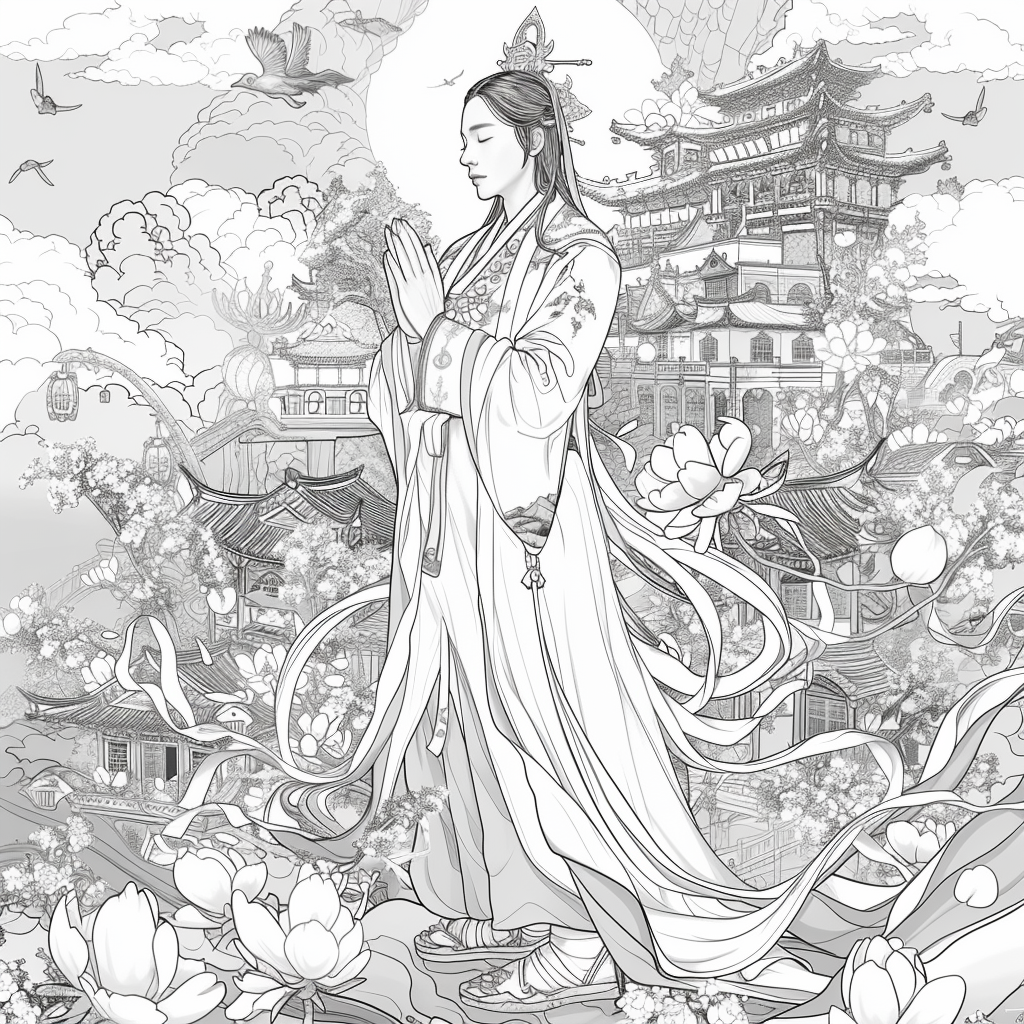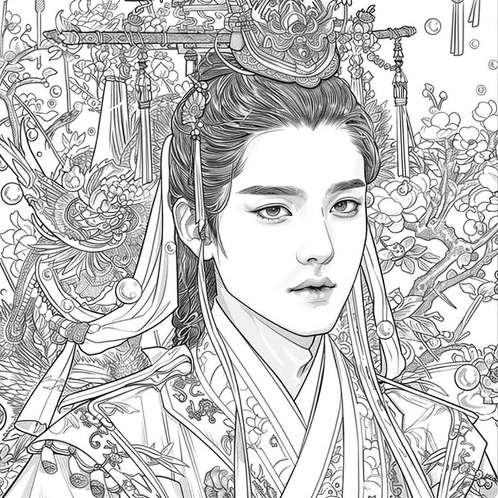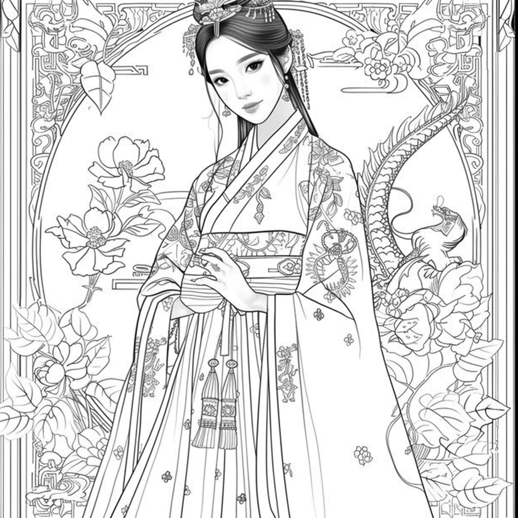 A charming young maiden dressed in a richly embroidered hanbok of deep blue and golden yellow stands amidst a cascade of vibrant flowers. Her hair, adorned with delicate blossoms, frames her gentle smile. A small leopard spirit peers from the floral branches, symbolizing courage and grace. The intricate floral motifs on her attire blend seamlessly with the surrounding blooms, creating a harmonious vision of beauty, nature, and quiet strength.