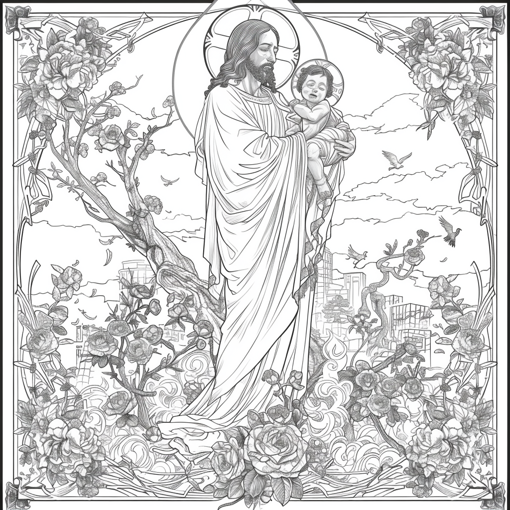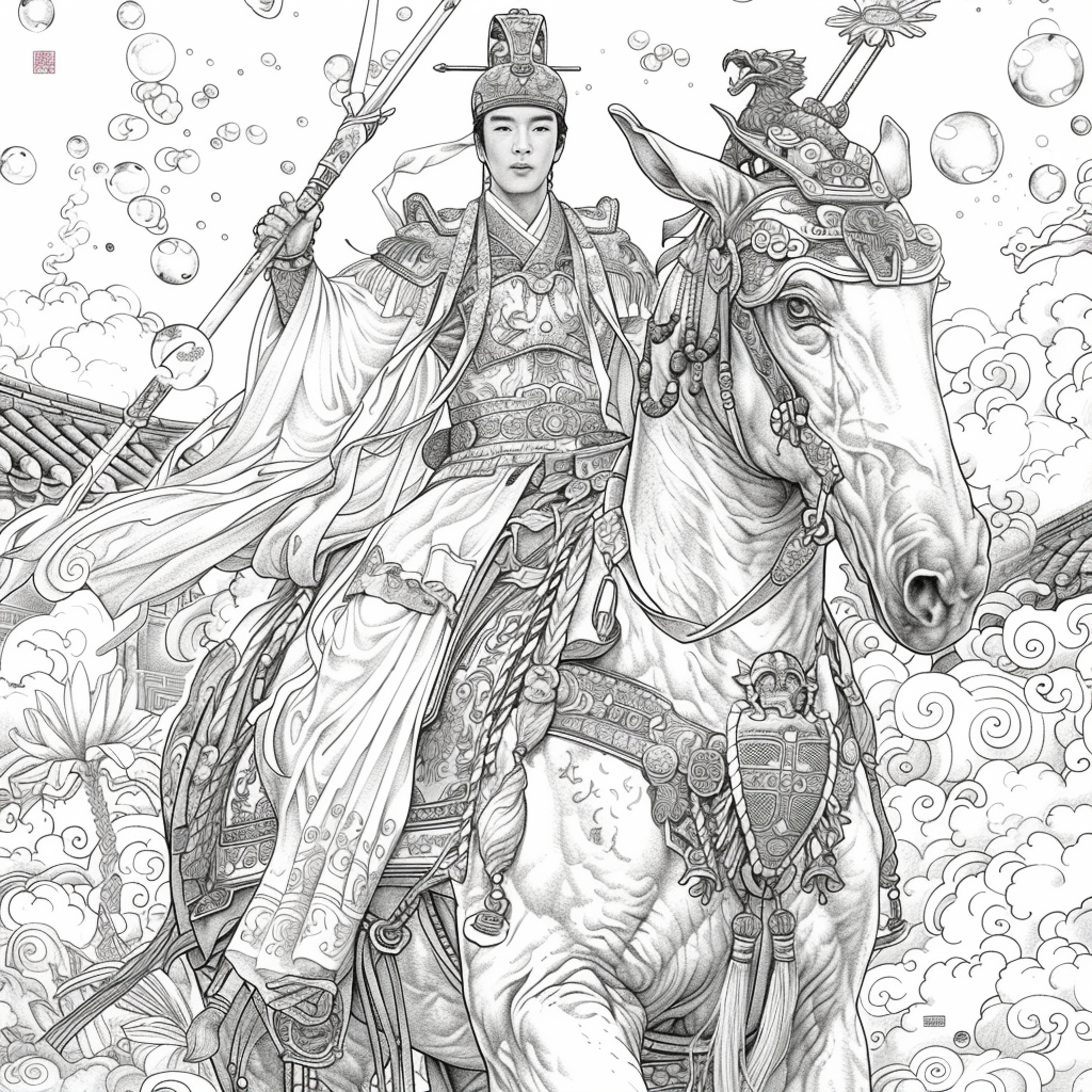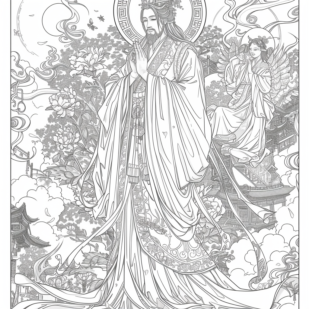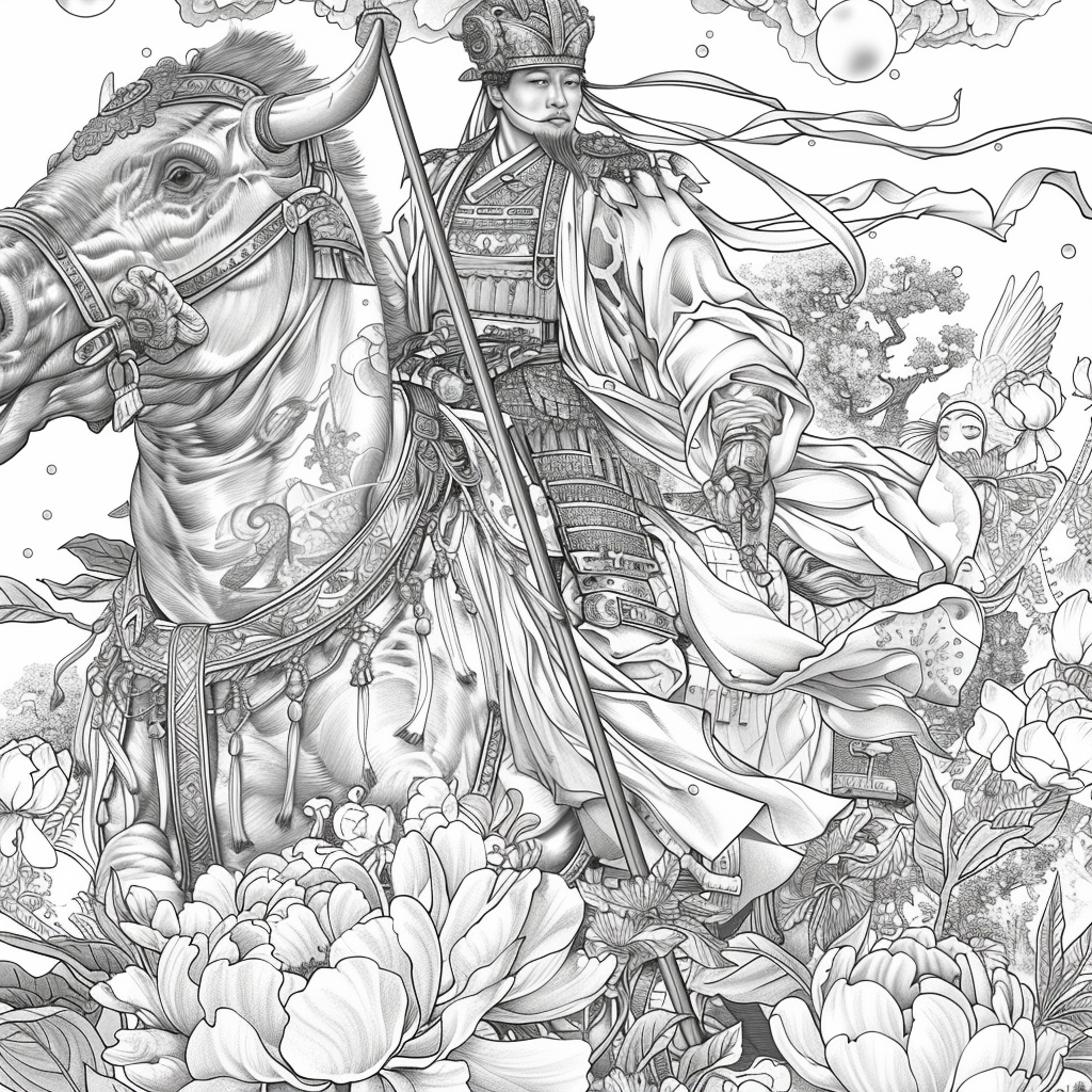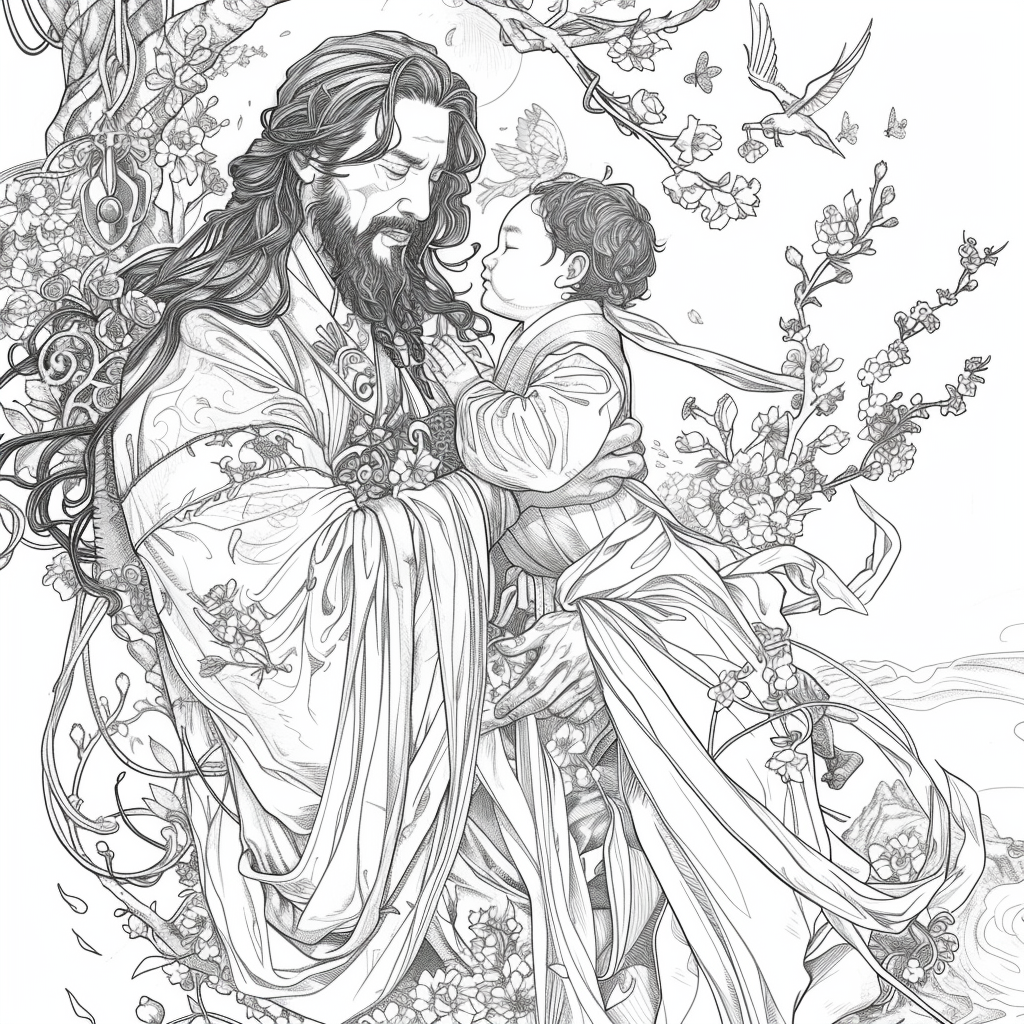 A charming young maiden dressed in a richly embroidered hanbok of deep blue and golden yellow stands amidst a cascade of vibrant flowers. Her hair, adorned with delicate blossoms, frames her gentle smile. A small leopard spirit peers from the floral branches, symbolizing courage and grace. The intricate floral motifs on her attire blend seamlessly with the surrounding blooms, creating a harmonious vision of beauty, nature, and quiet strength.