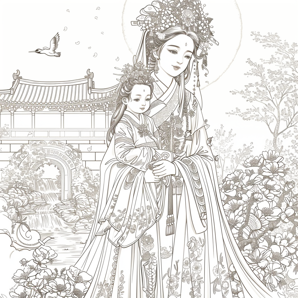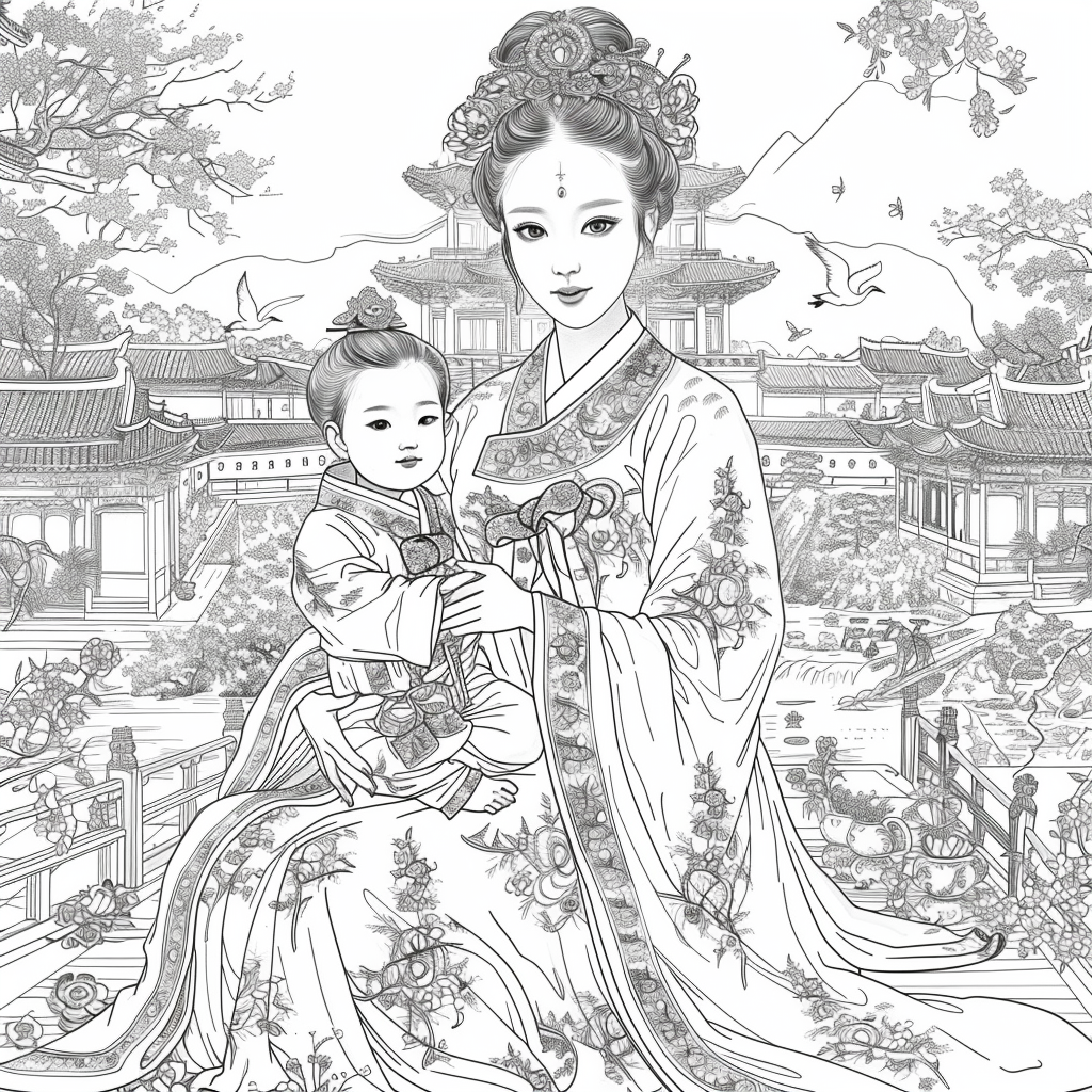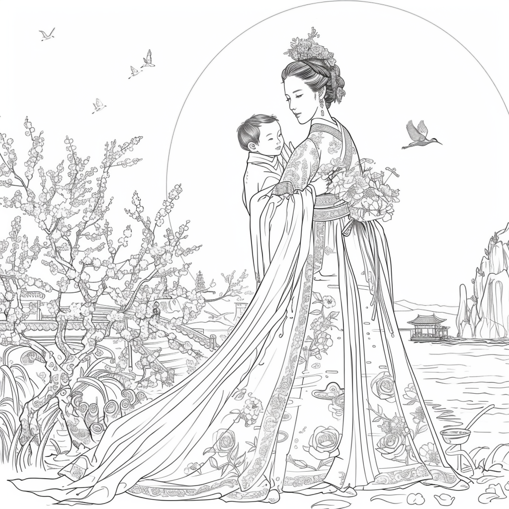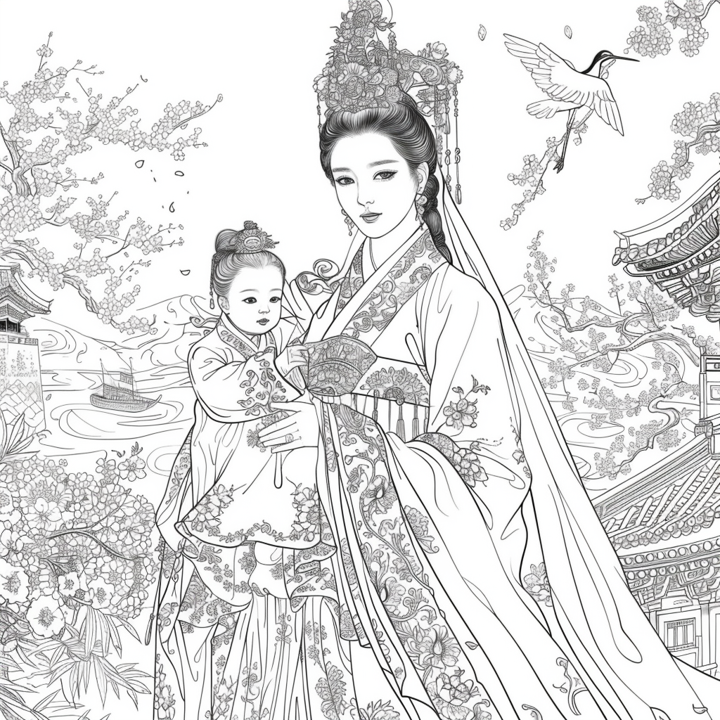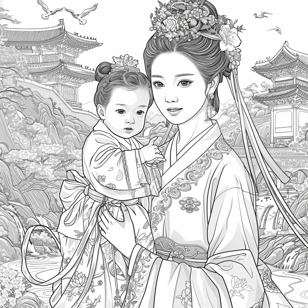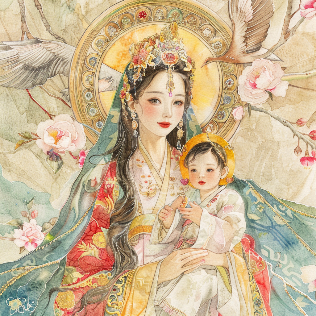 A serene mother dressed in a richly adorned royal hanbok cradles her child with tender grace. A golden halo frames her face, symbolizing divine love and protection, while delicate blossoms and soaring birds surround the pair, evoking purity and renewal. Her intricate jeweled crown and embroidered robes reflect dignity and timeless elegance, while the child’s gentle expression embodies innocence and hope. This watercolor masterpiece beautifully unites themes of motherhood, heritage, and sacred devotion, radiating warmth and the eternal bond between mother and child.