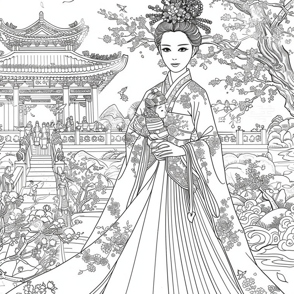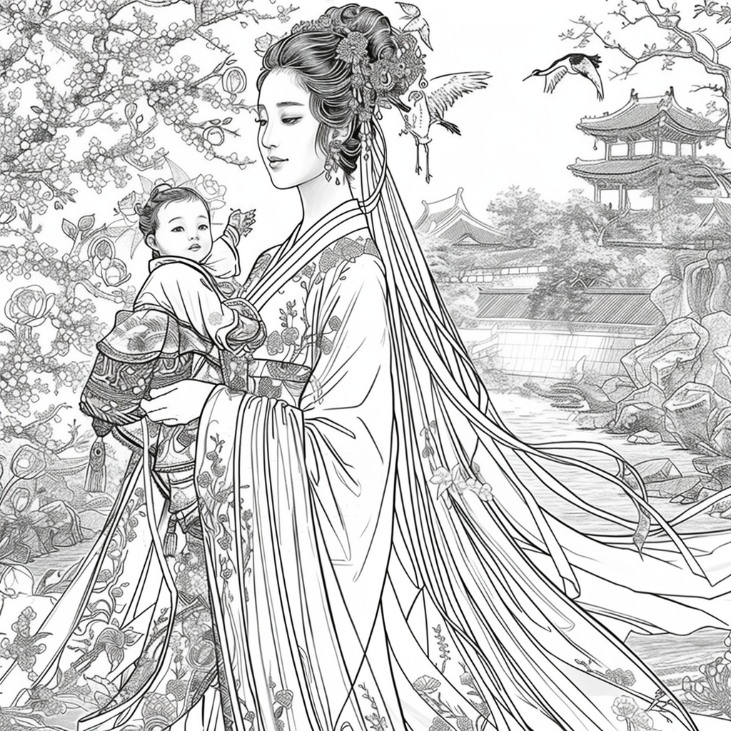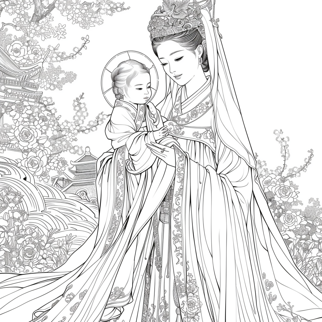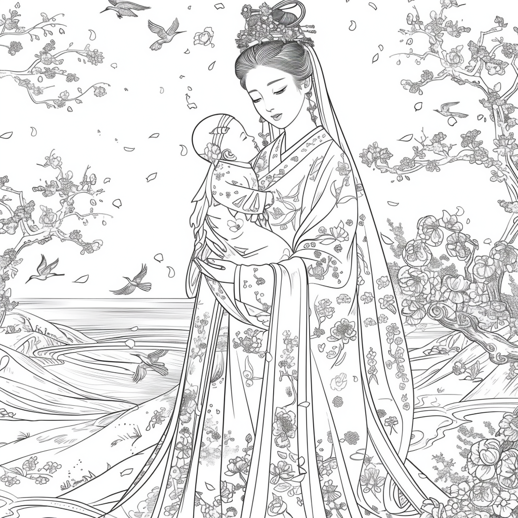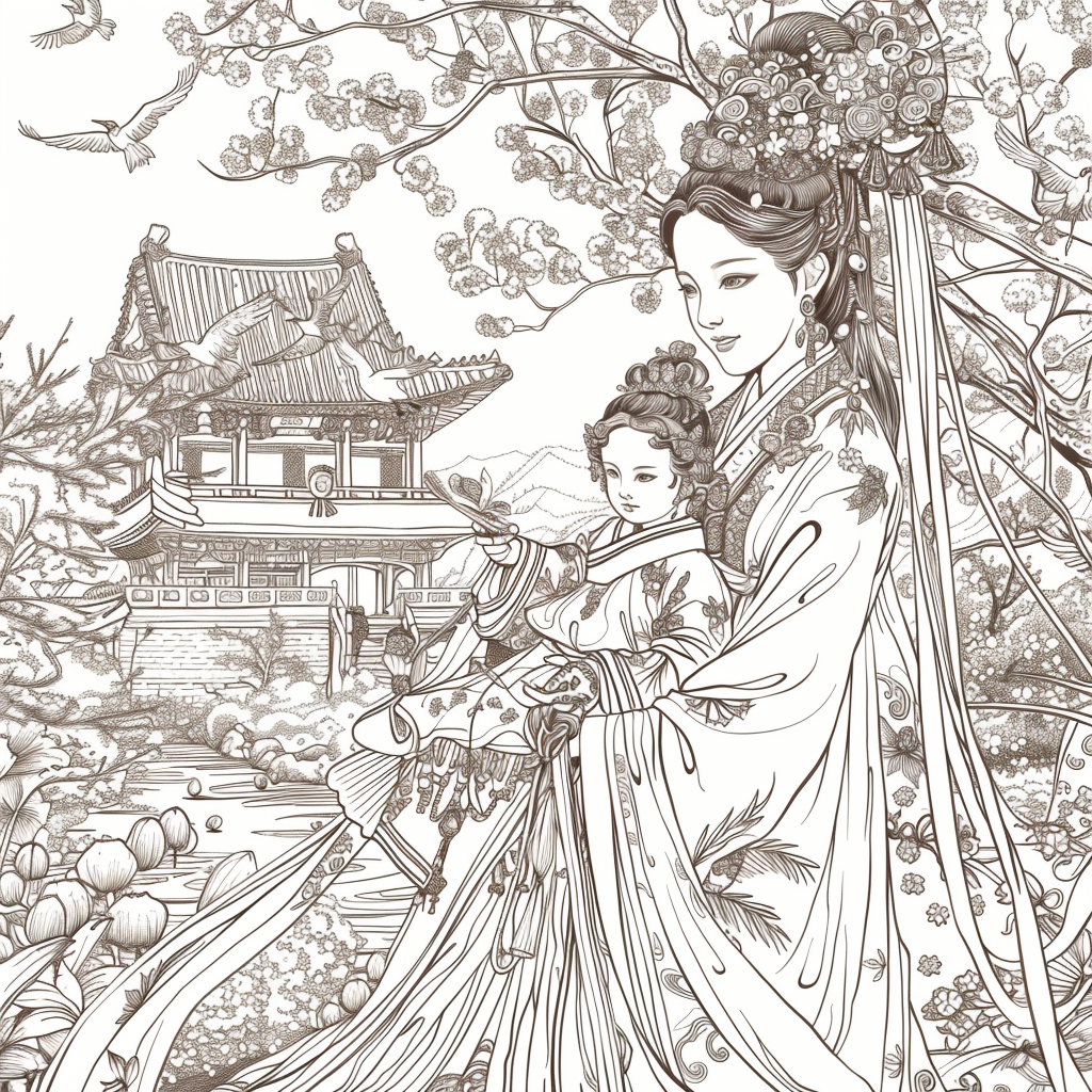 A serene mother dressed in a richly adorned royal hanbok cradles her child with tender grace. A golden halo frames her face, symbolizing divine love and protection, while delicate blossoms and soaring birds surround the pair, evoking purity and renewal. Her intricate jeweled crown and embroidered robes reflect dignity and timeless elegance, while the child’s gentle expression embodies innocence and hope. This watercolor masterpiece beautifully unites themes of motherhood, heritage, and sacred devotion, radiating warmth and the eternal bond between mother and child.