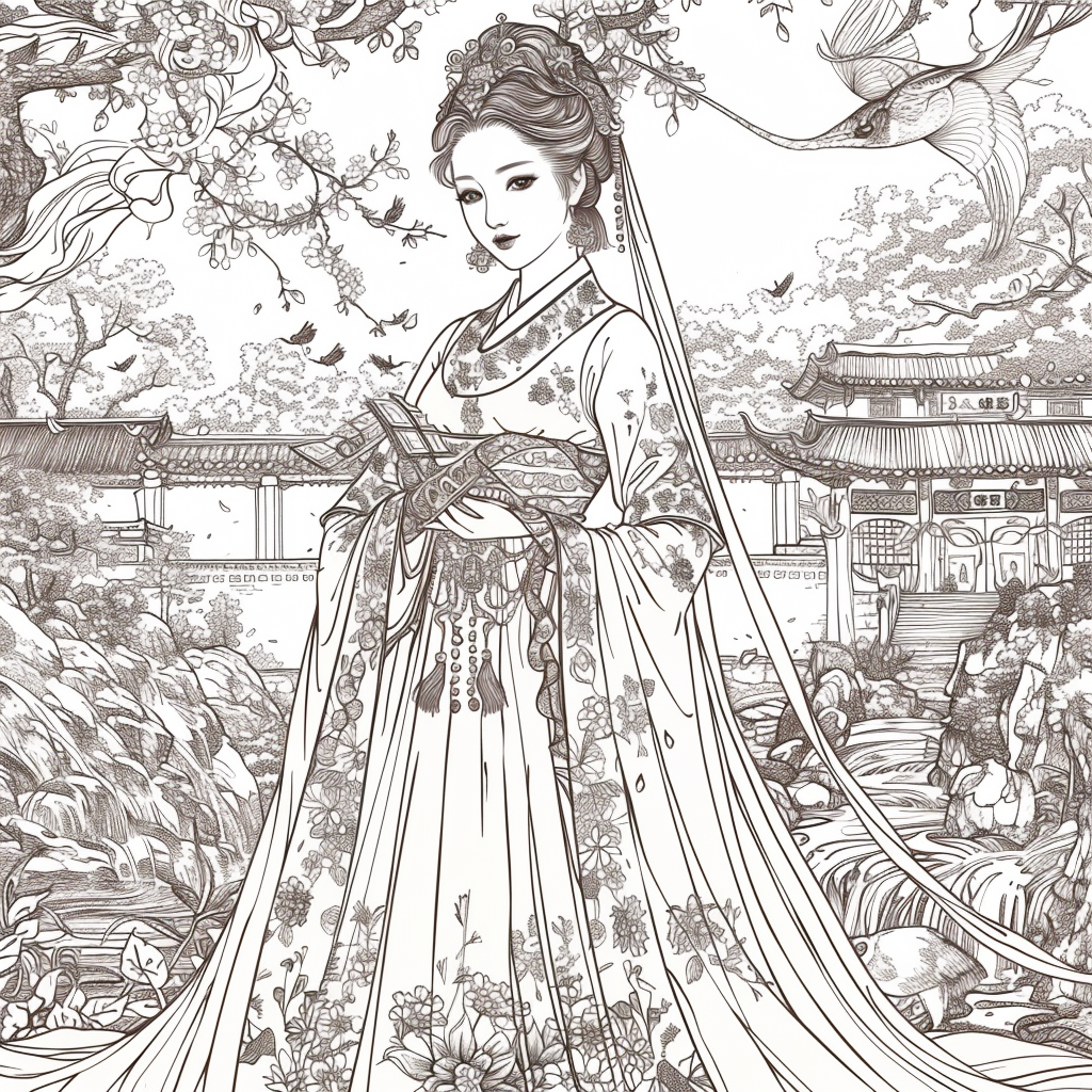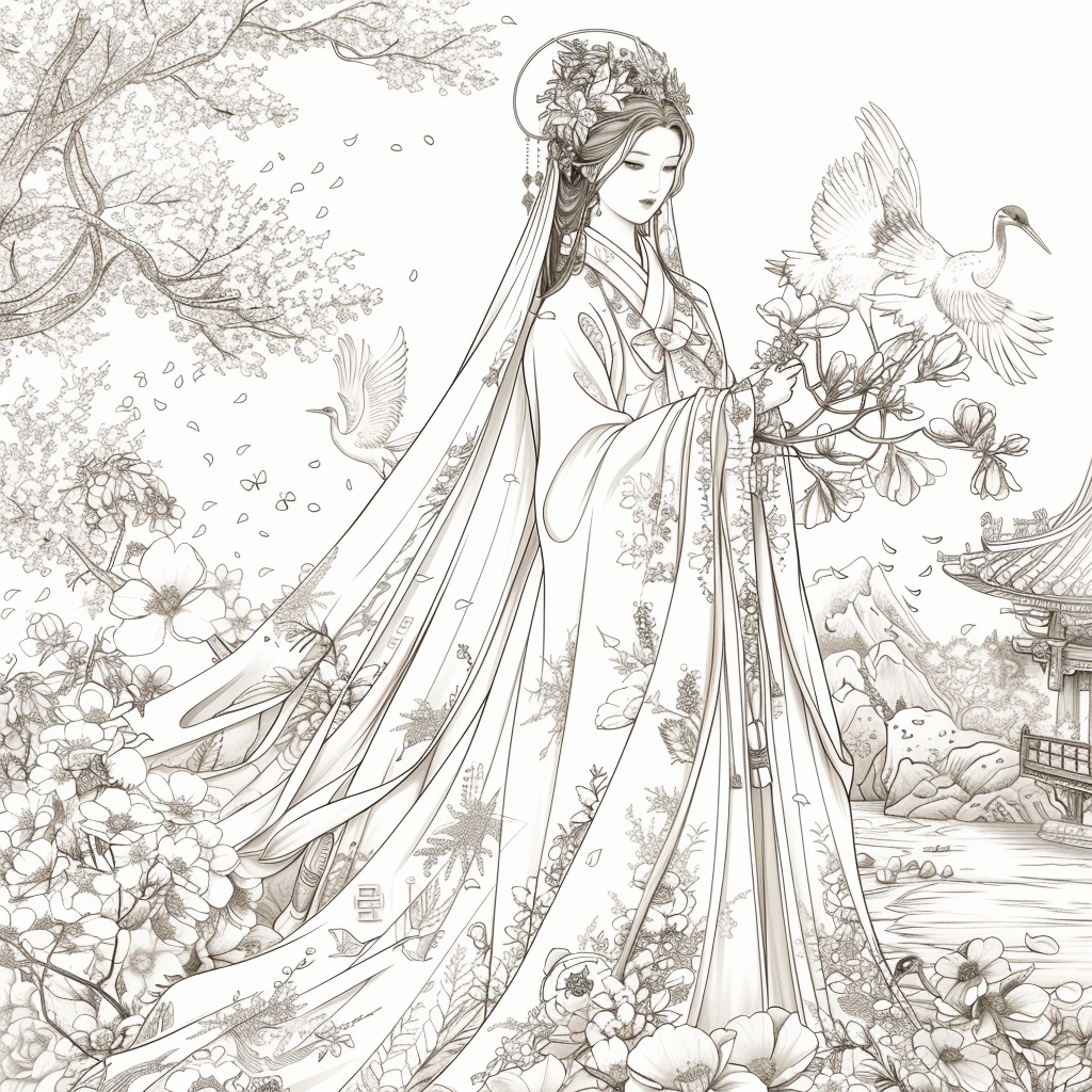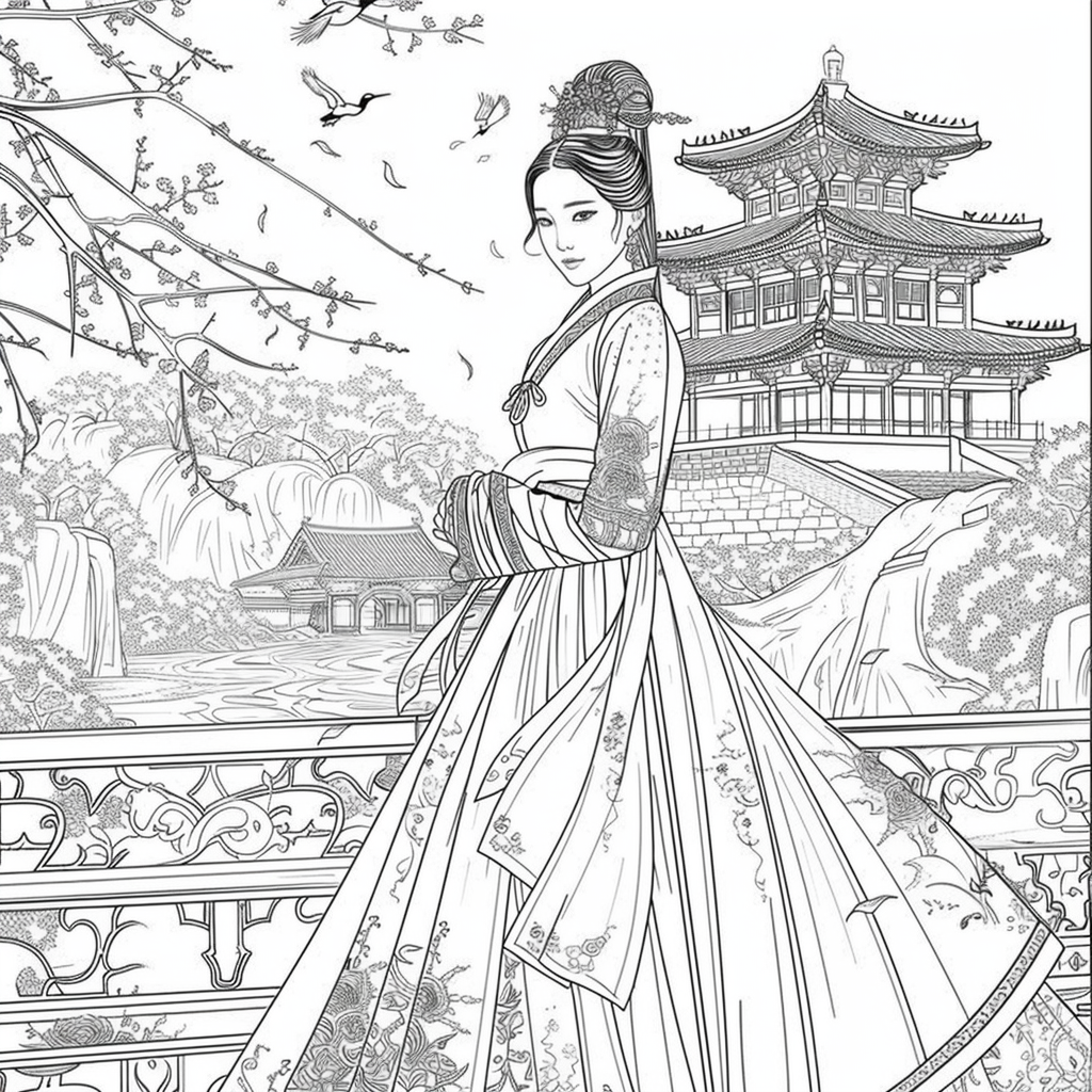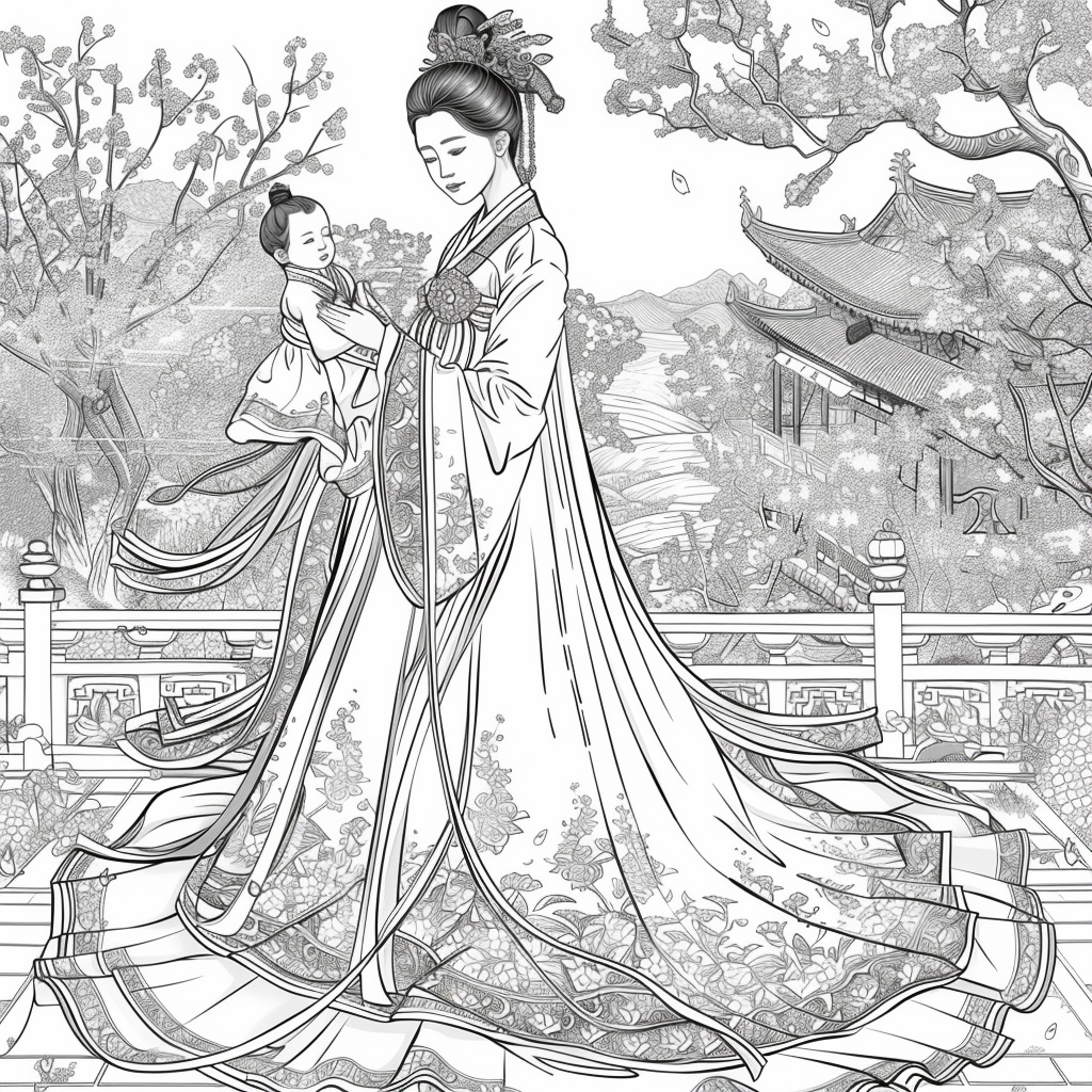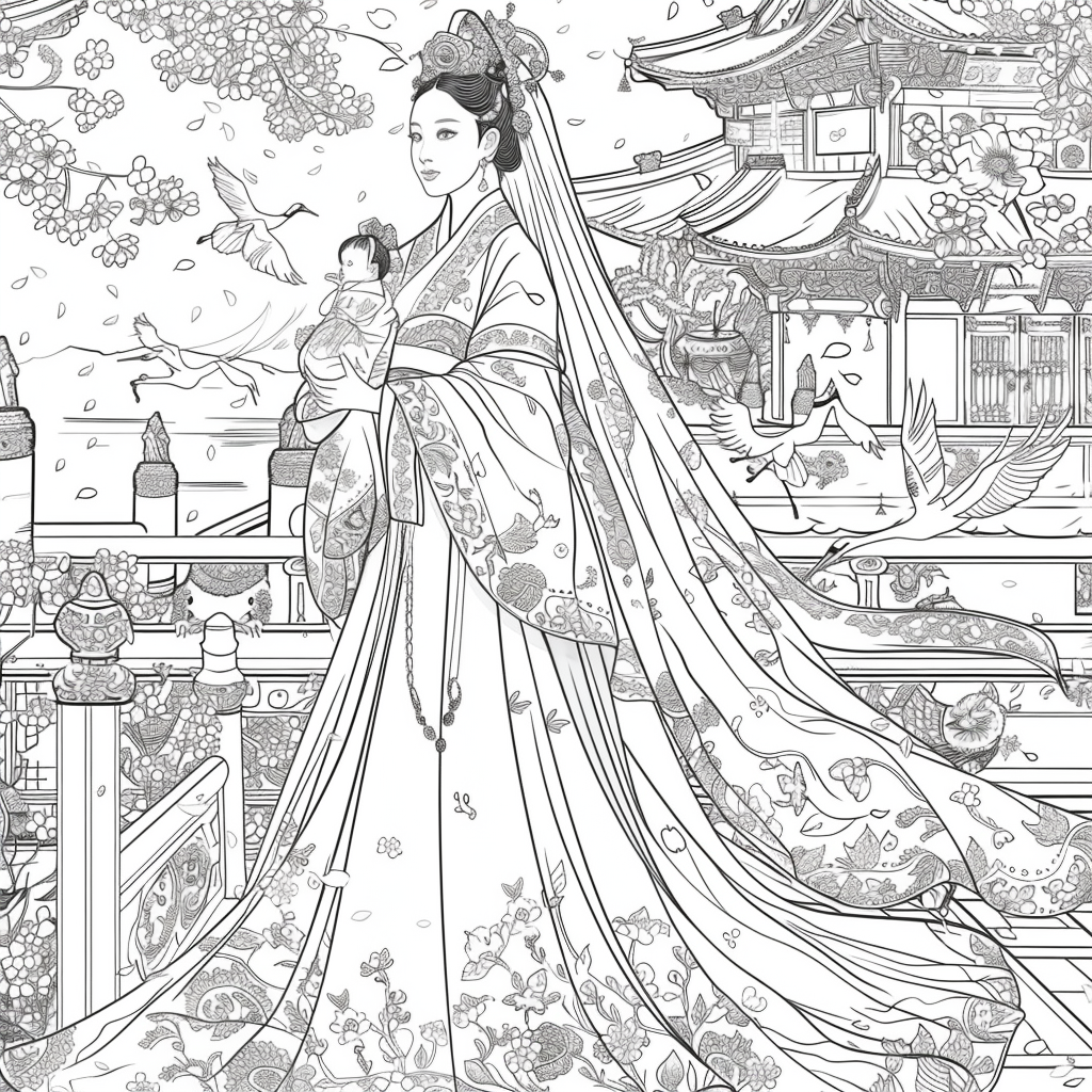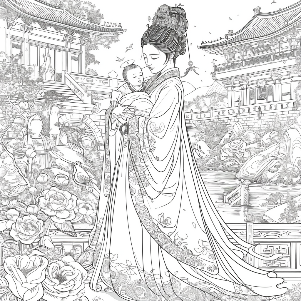 A serene mother dressed in a richly adorned royal hanbok cradles her child with tender grace. A golden halo frames her face, symbolizing divine love and protection, while delicate blossoms and soaring birds surround the pair, evoking purity and renewal. Her intricate jeweled crown and embroidered robes reflect dignity and timeless elegance, while the child’s gentle expression embodies innocence and hope. This watercolor masterpiece beautifully unites themes of motherhood, heritage, and sacred devotion, radiating warmth and the eternal bond between mother and child.