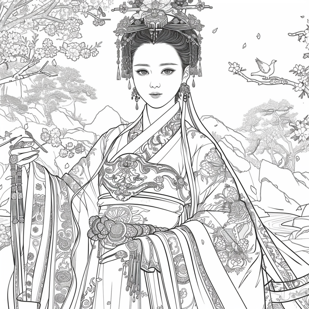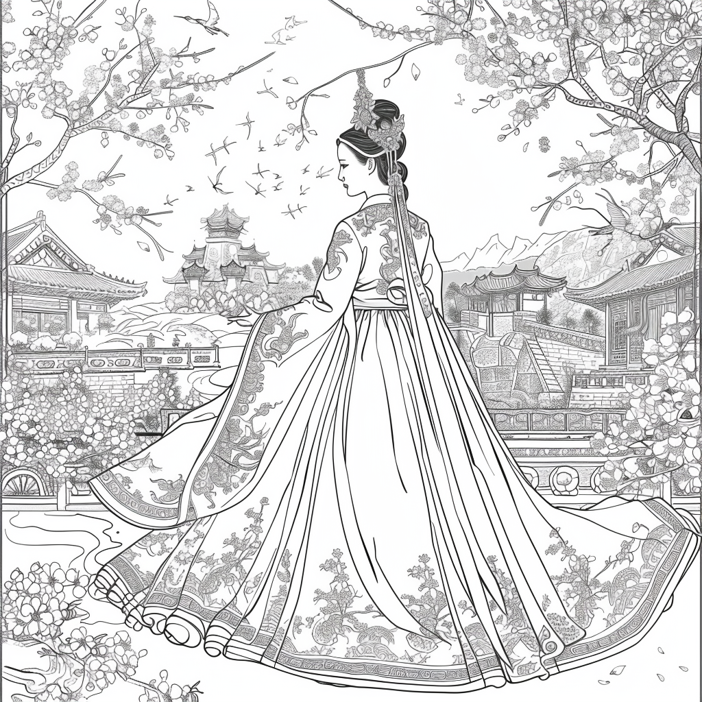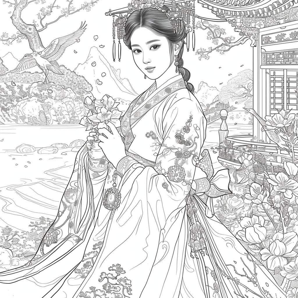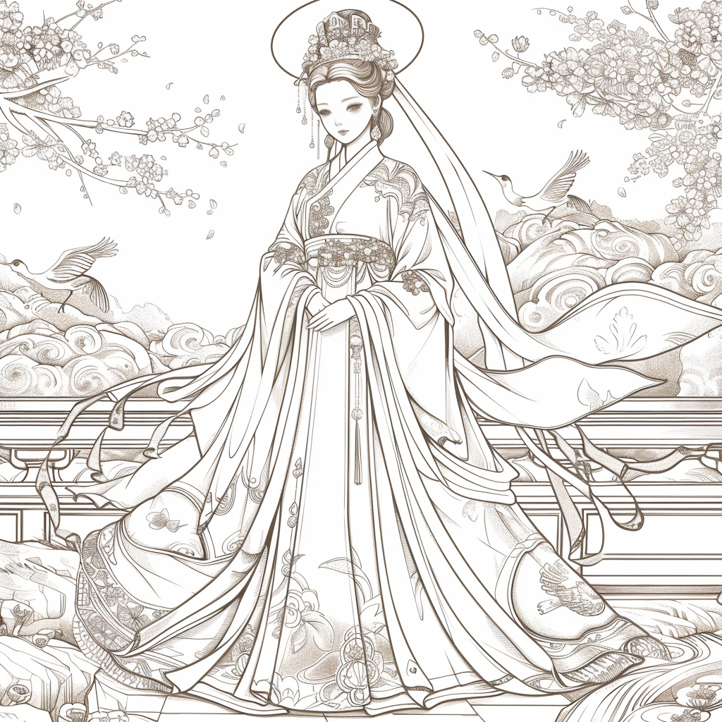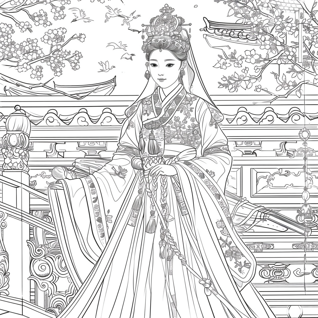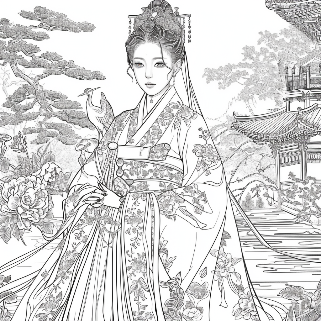 A serene mother dressed in a richly adorned royal hanbok cradles her child with tender grace. A golden halo frames her face, symbolizing divine love and protection, while delicate blossoms and soaring birds surround the pair, evoking purity and renewal. Her intricate jeweled crown and embroidered robes reflect dignity and timeless elegance, while the child’s gentle expression embodies innocence and hope. This watercolor masterpiece beautifully unites themes of motherhood, heritage, and sacred devotion, radiating warmth and the eternal bond between mother and child.