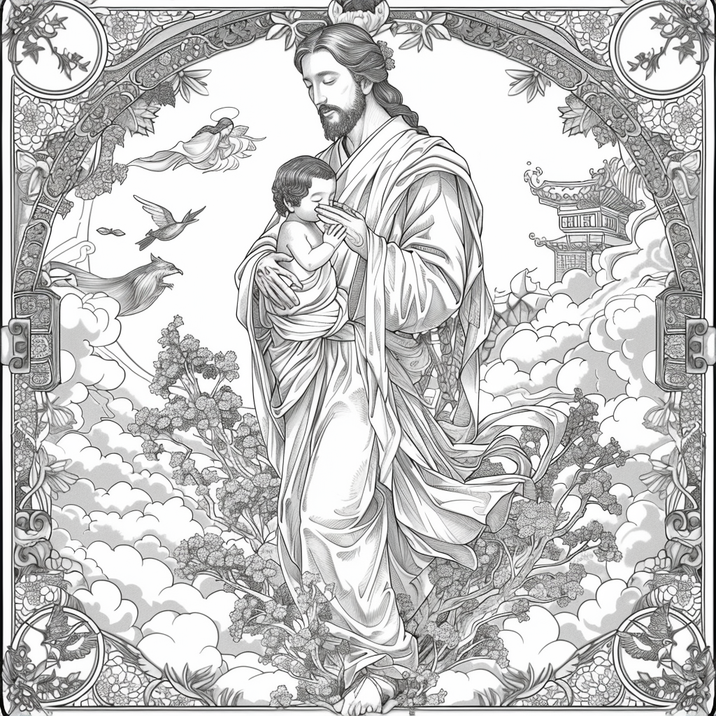 An awe-inspiring oriental fantasy illustration depicting a radiant goddess standing gracefully amidst a cosmic garden of blossoms. She is dressed in a resplendent hanbok-inspired gown, flowing with golden, teal, and crimson hues, intricately embroidered with floral patterns. Behind her glows a brilliant sun halo, illuminating the scene with divine energy. Surrounding her are blooming trees, swirling waves, temple rooftops, and attendants, creating a harmonious blend of heaven and earth. The artwork is infused with intricate details, soft textures, and vibrant colors, embodying themes of rebirth, balance, and eternal beauty.