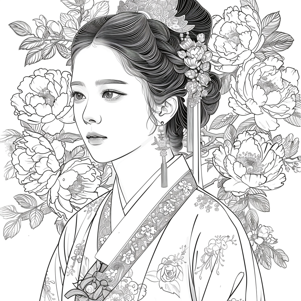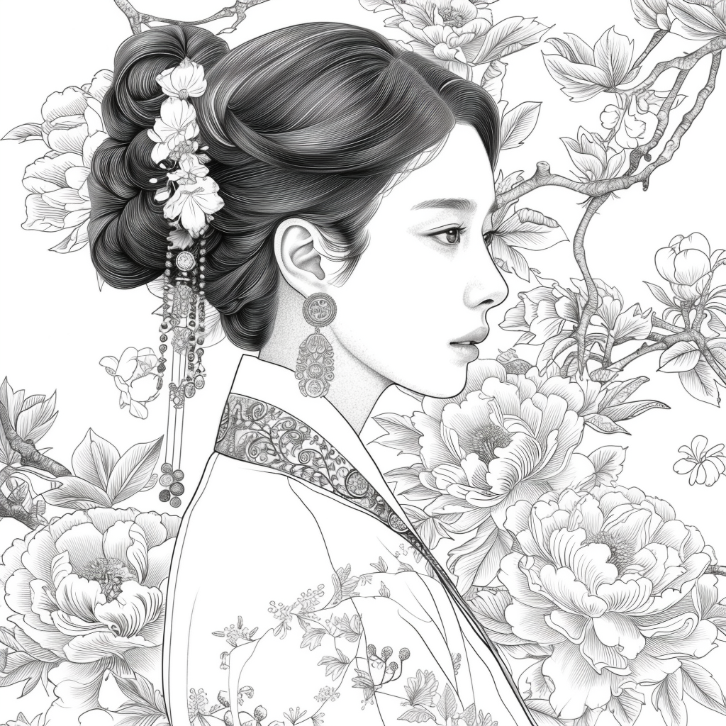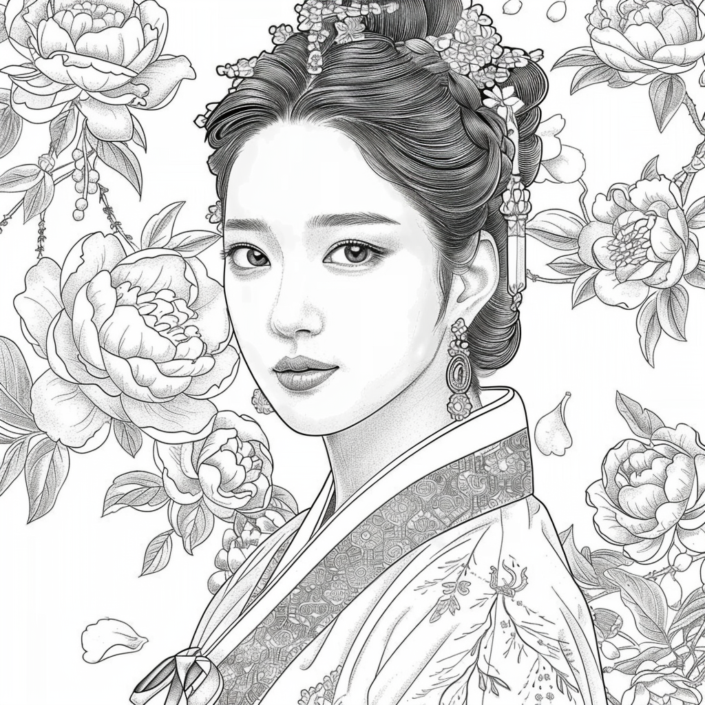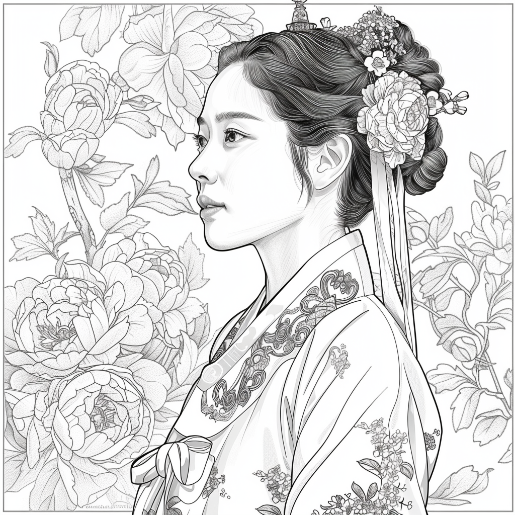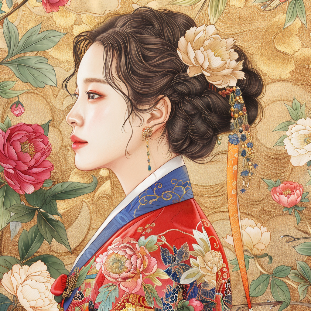 A regal Korean woman is depicted in side profile, her gaze calm and composed against a richly textured gold background. Wearing a brilliant red hanbok embroidered with lush peony blossoms, she radiates nobility and feminine strength. Her hair is arranged in an elegant chignon adorned with an ivory peony and intricate traditional ornaments. Every detail—from her ornate earring to the golden patterns in her attire—speaks of prestige, grace, and the timeless beauty of Joseon-era royalty.
