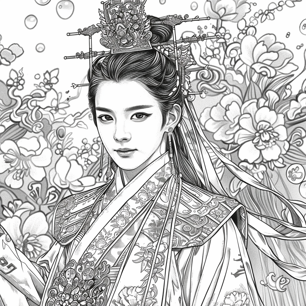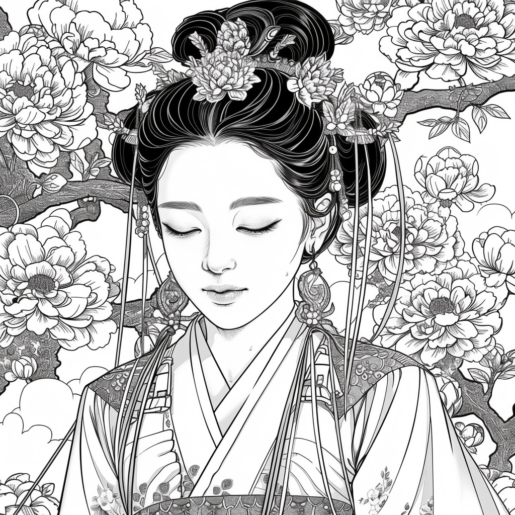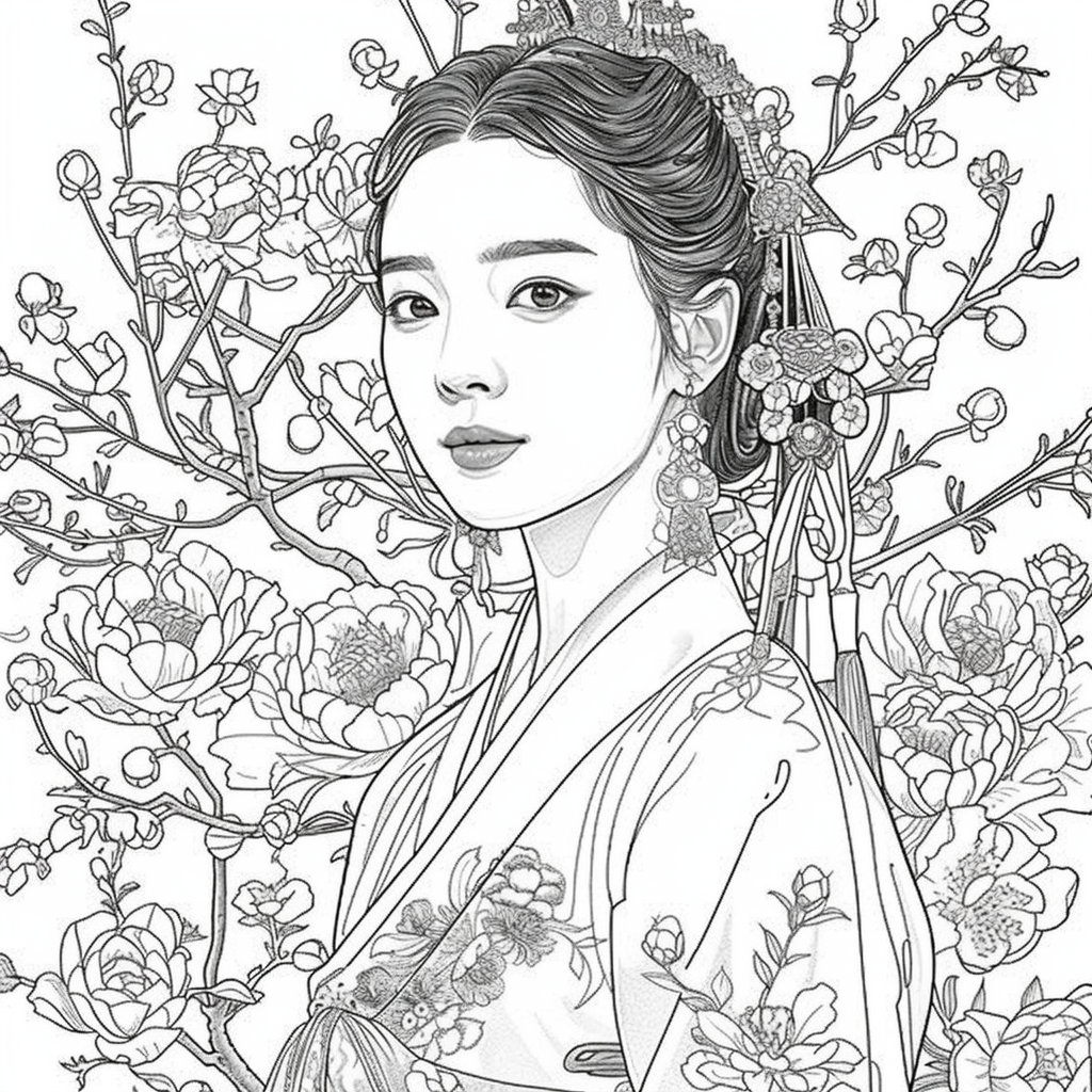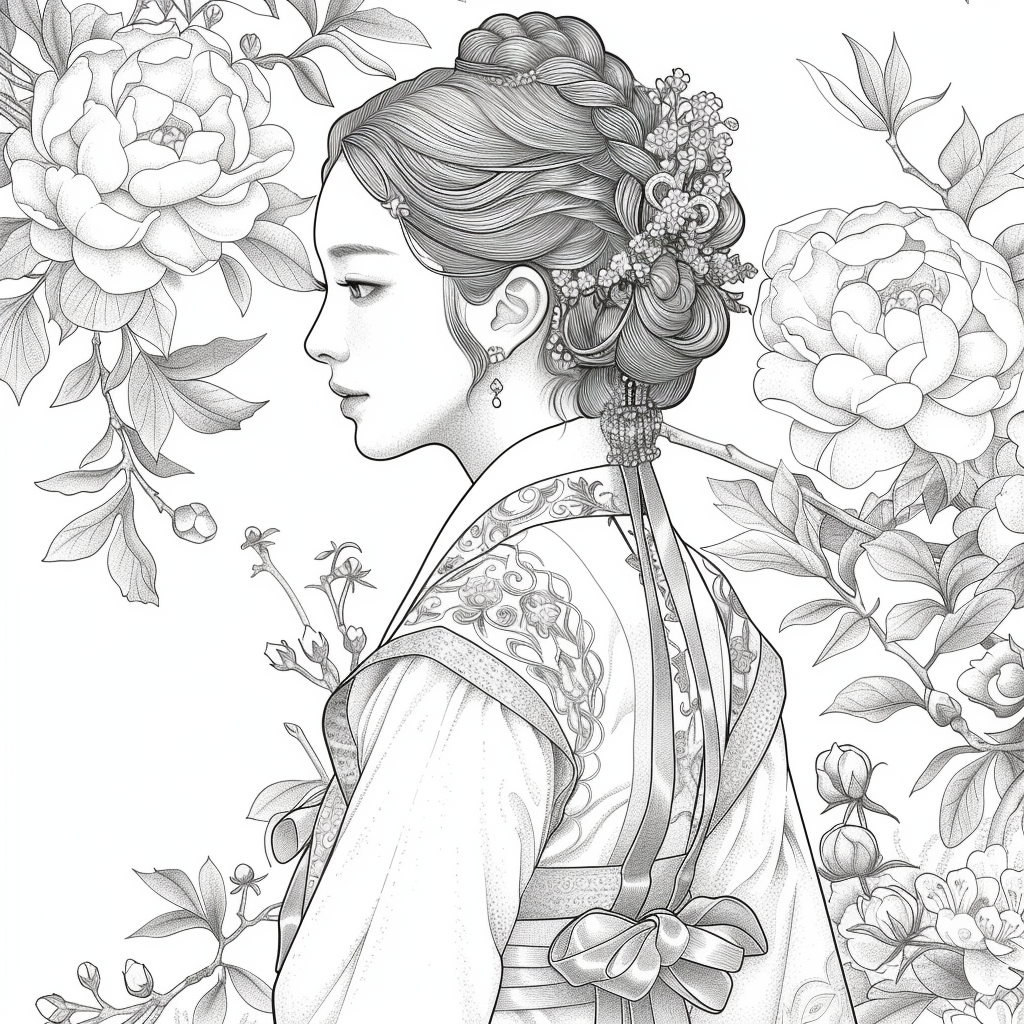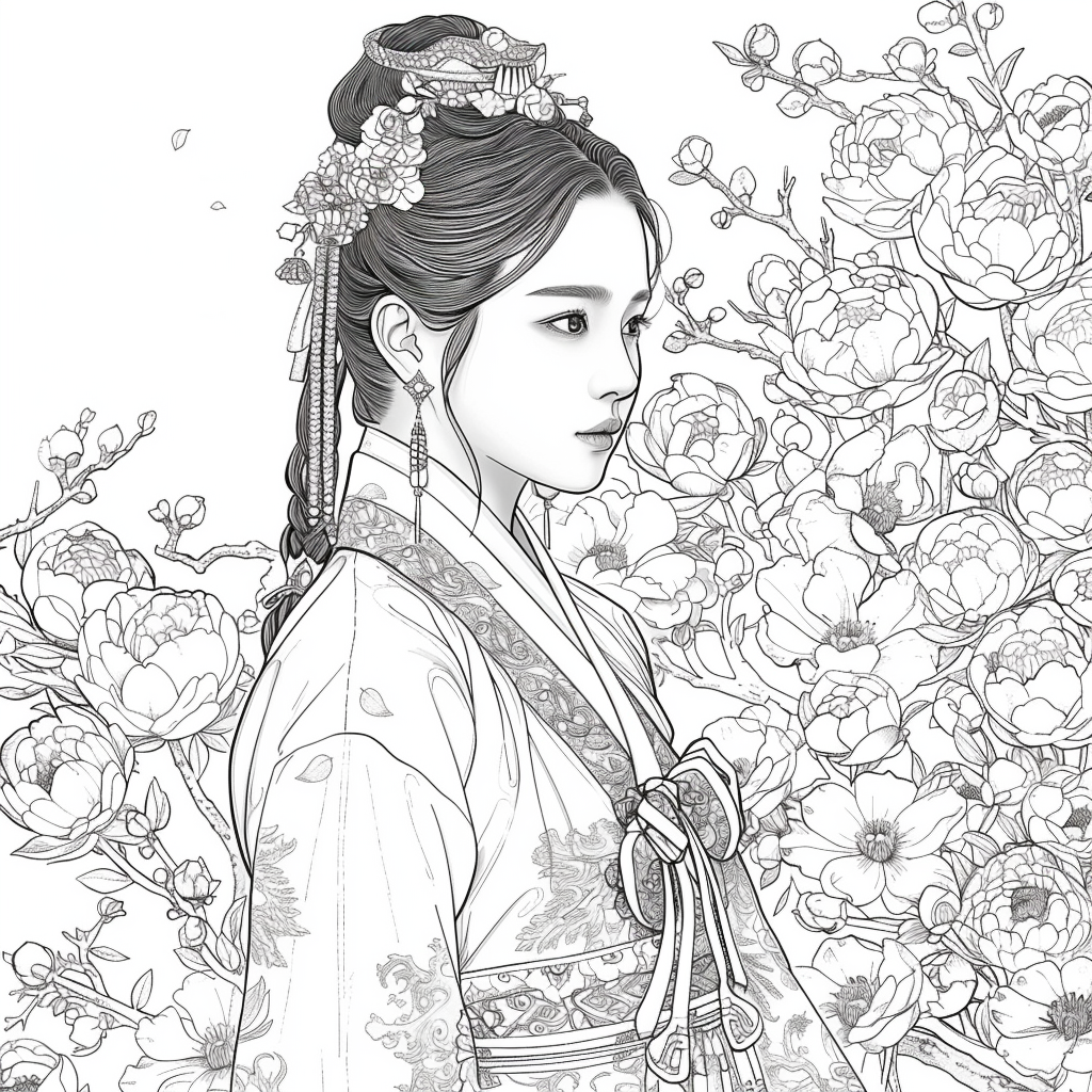 A regal Korean woman is depicted in side profile, her gaze calm and composed against a richly textured gold background. Wearing a brilliant red hanbok embroidered with lush peony blossoms, she radiates nobility and feminine strength. Her hair is arranged in an elegant chignon adorned with an ivory peony and intricate traditional ornaments. Every detail—from her ornate earring to the golden patterns in her attire—speaks of prestige, grace, and the timeless beauty of Joseon-era royalty.