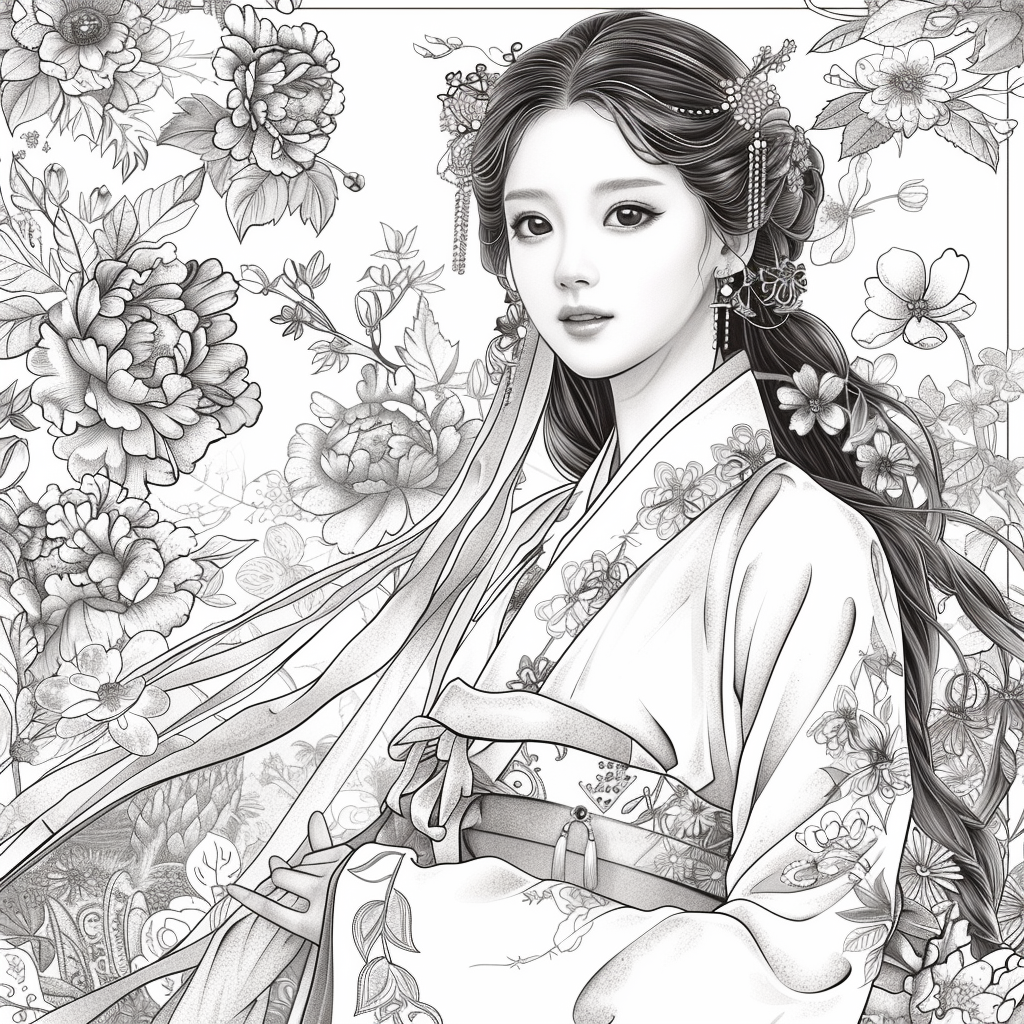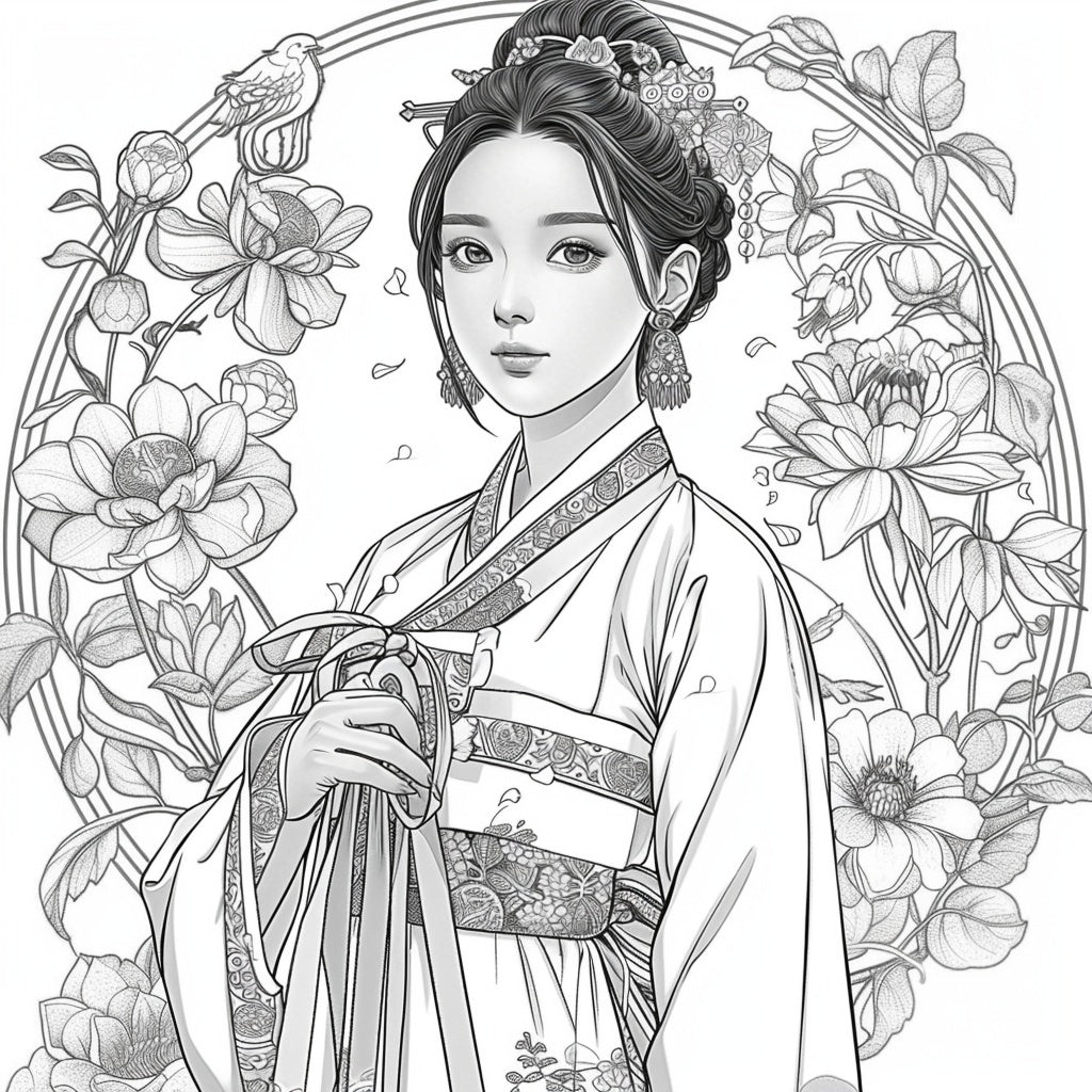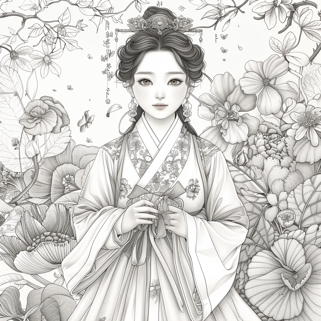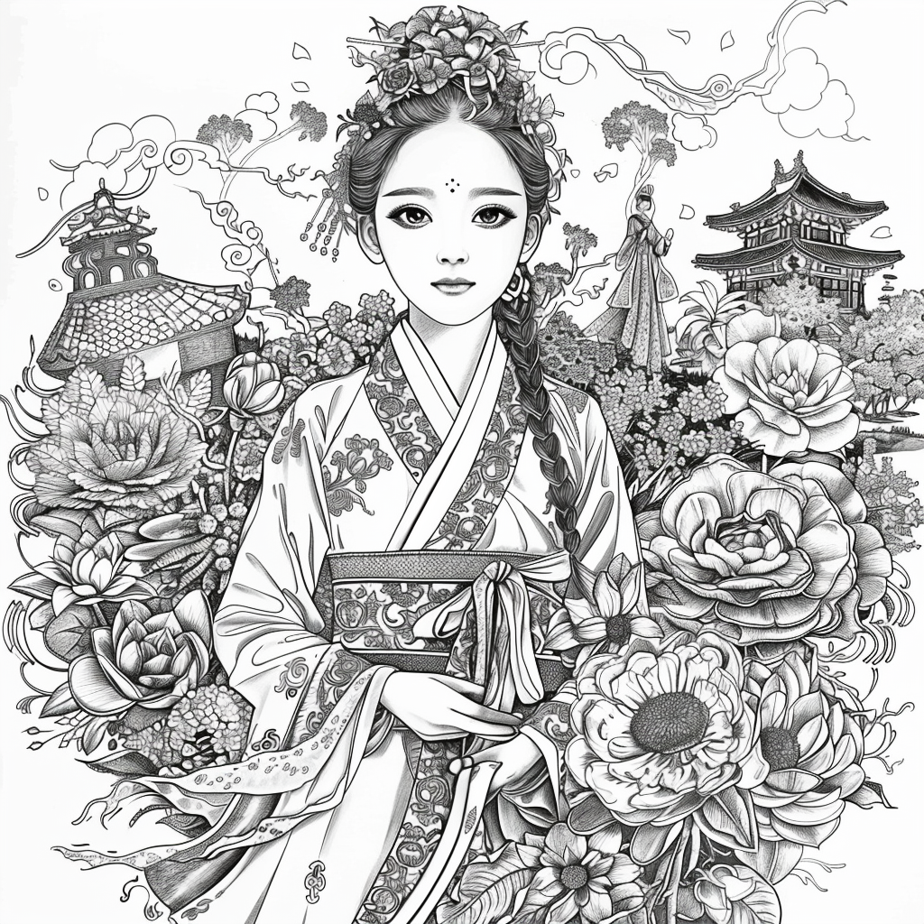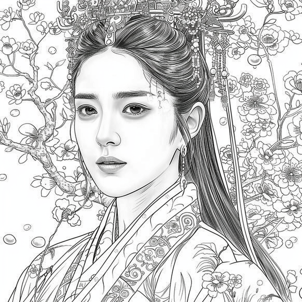 A regal Korean woman is depicted in side profile, her gaze calm and composed against a richly textured gold background. Wearing a brilliant red hanbok embroidered with lush peony blossoms, she radiates nobility and feminine strength. Her hair is arranged in an elegant chignon adorned with an ivory peony and intricate traditional ornaments. Every detail—from her ornate earring to the golden patterns in her attire—speaks of prestige, grace, and the timeless beauty of Joseon-era royalty.