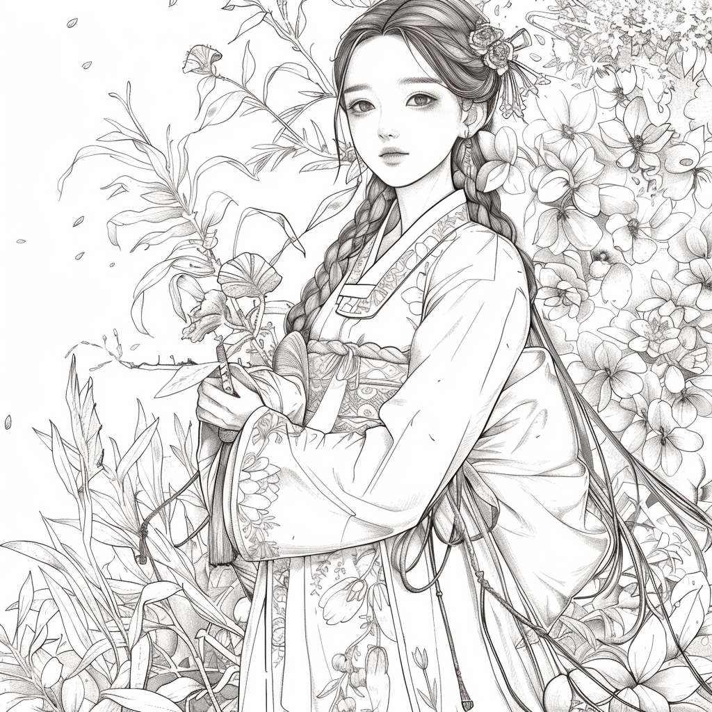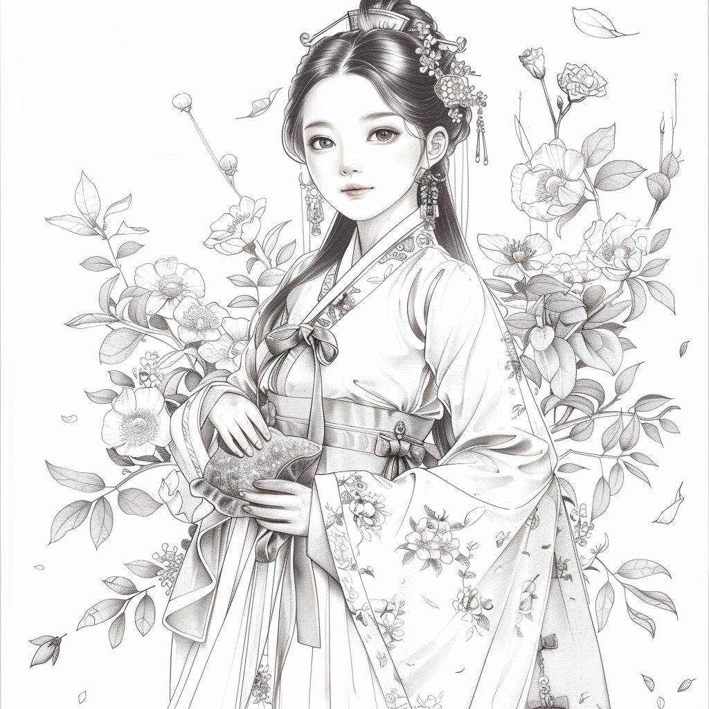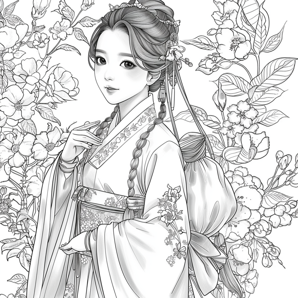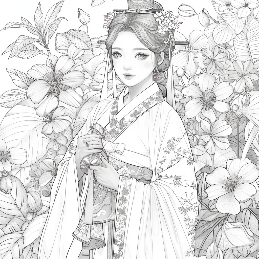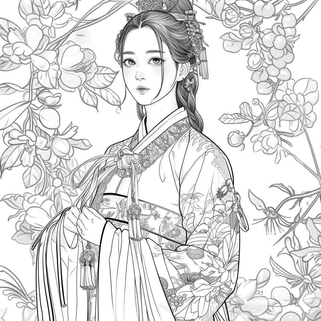A regal Korean woman is depicted in side profile, her gaze calm and composed against a richly textured gold background. Wearing a brilliant red hanbok embroidered with lush peony blossoms, she radiates nobility and feminine strength. Her hair is arranged in an elegant chignon adorned with an ivory peony and intricate traditional ornaments. Every detail—from her ornate earring to the golden patterns in her attire—speaks of prestige, grace, and the timeless beauty of Joseon-era royalty.