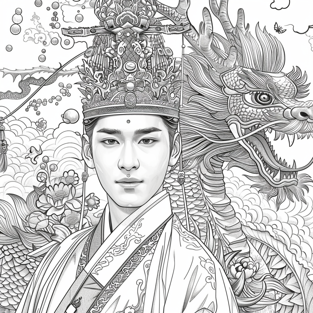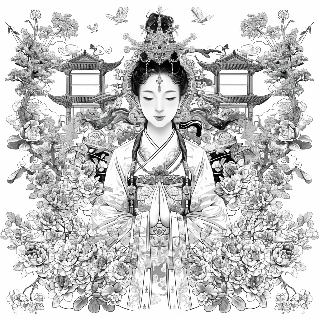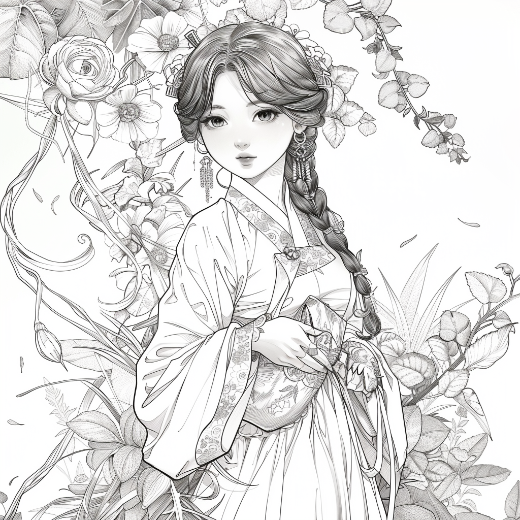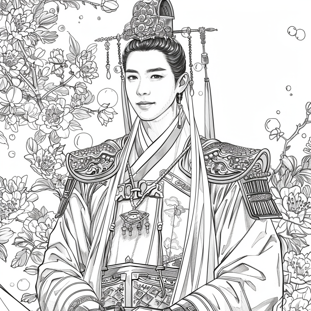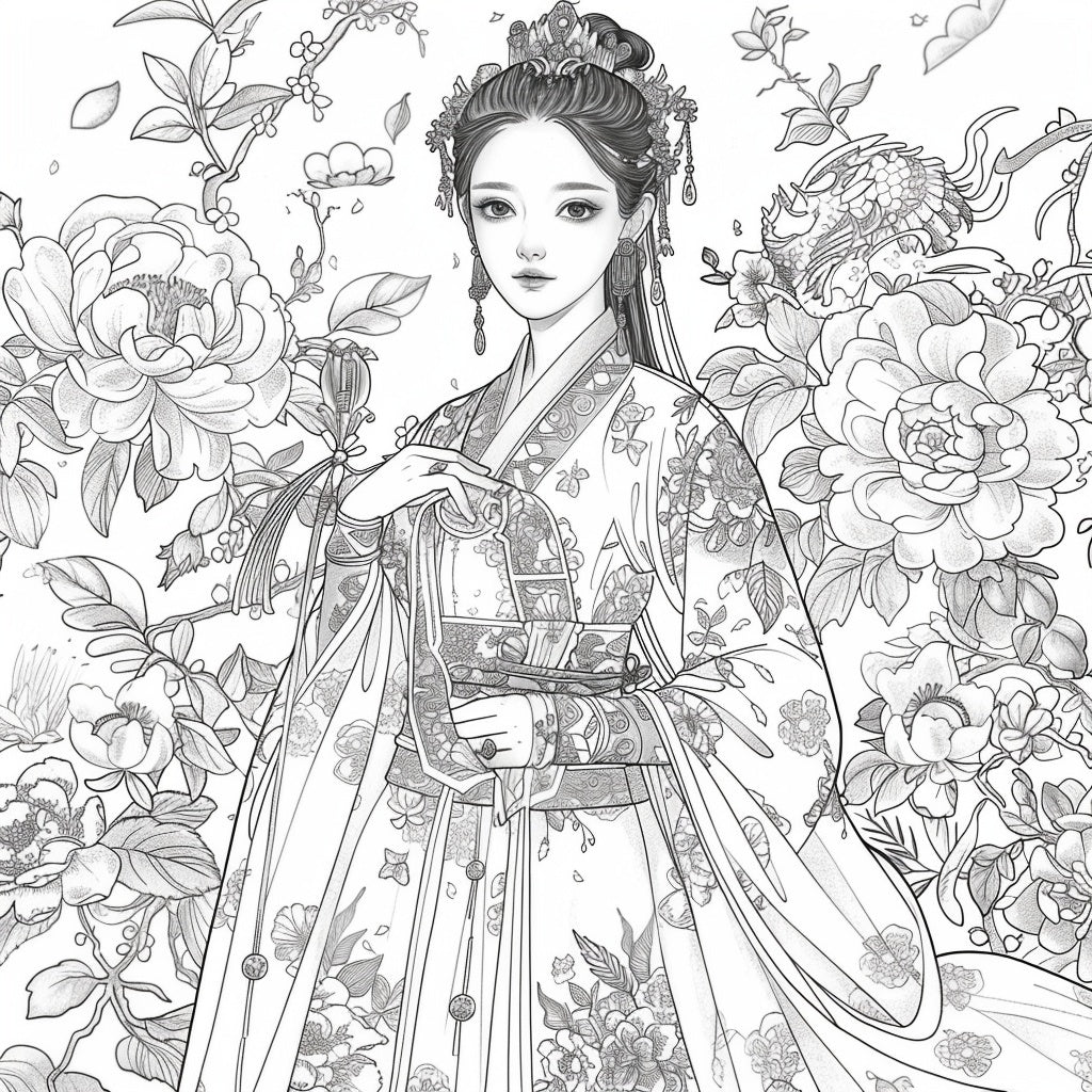 A regal Korean woman is depicted in side profile, her gaze calm and composed against a richly textured gold background. Wearing a brilliant red hanbok embroidered with lush peony blossoms, she radiates nobility and feminine strength. Her hair is arranged in an elegant chignon adorned with an ivory peony and intricate traditional ornaments. Every detail—from her ornate earring to the golden patterns in her attire—speaks of prestige, grace, and the timeless beauty of Joseon-era royalty.