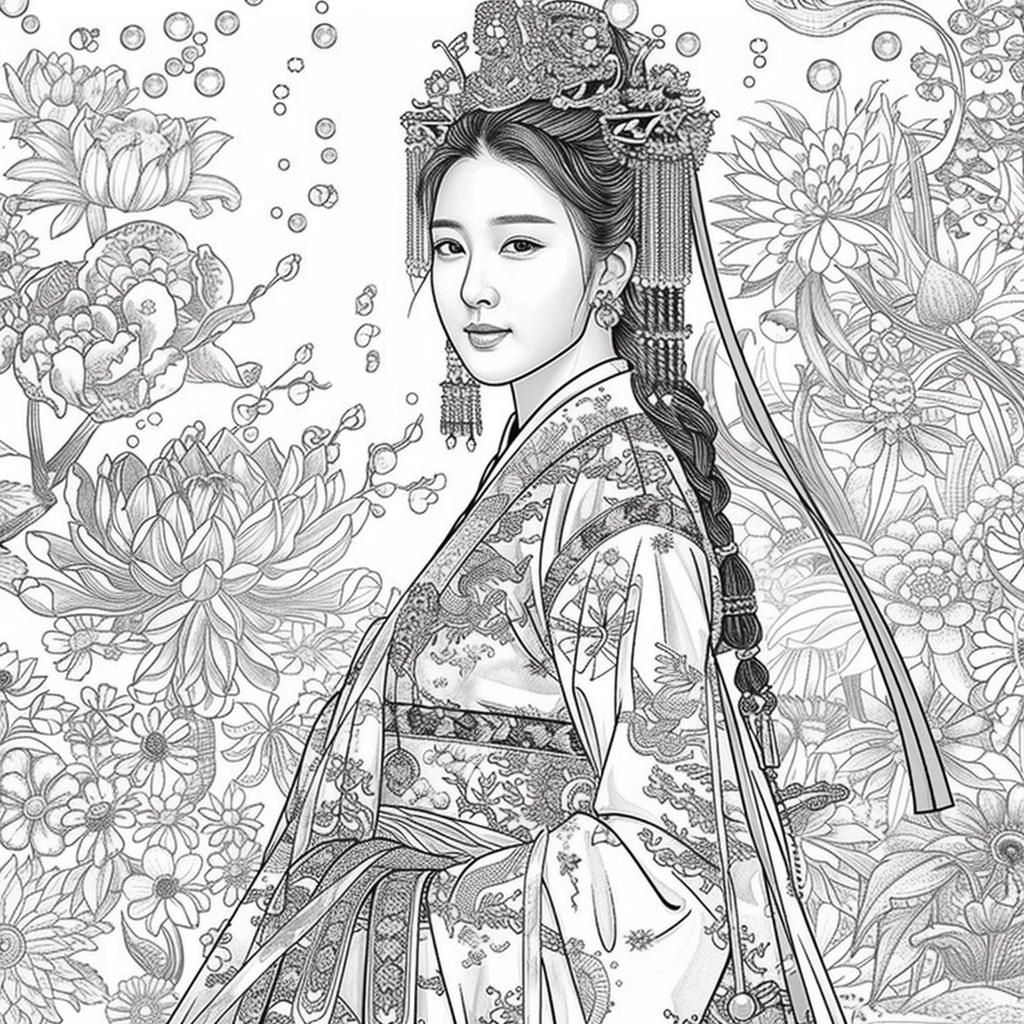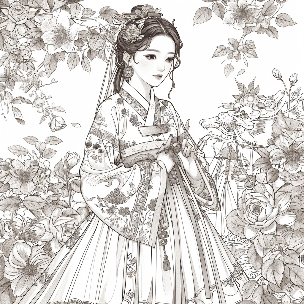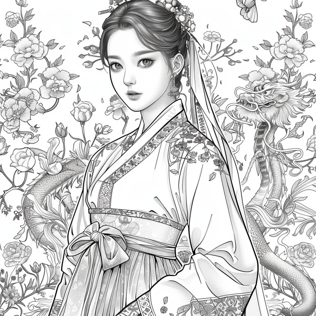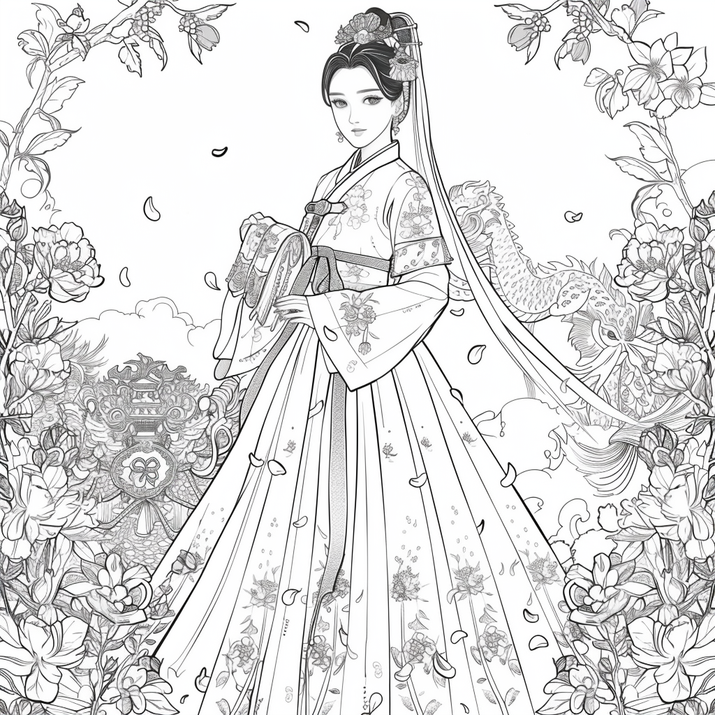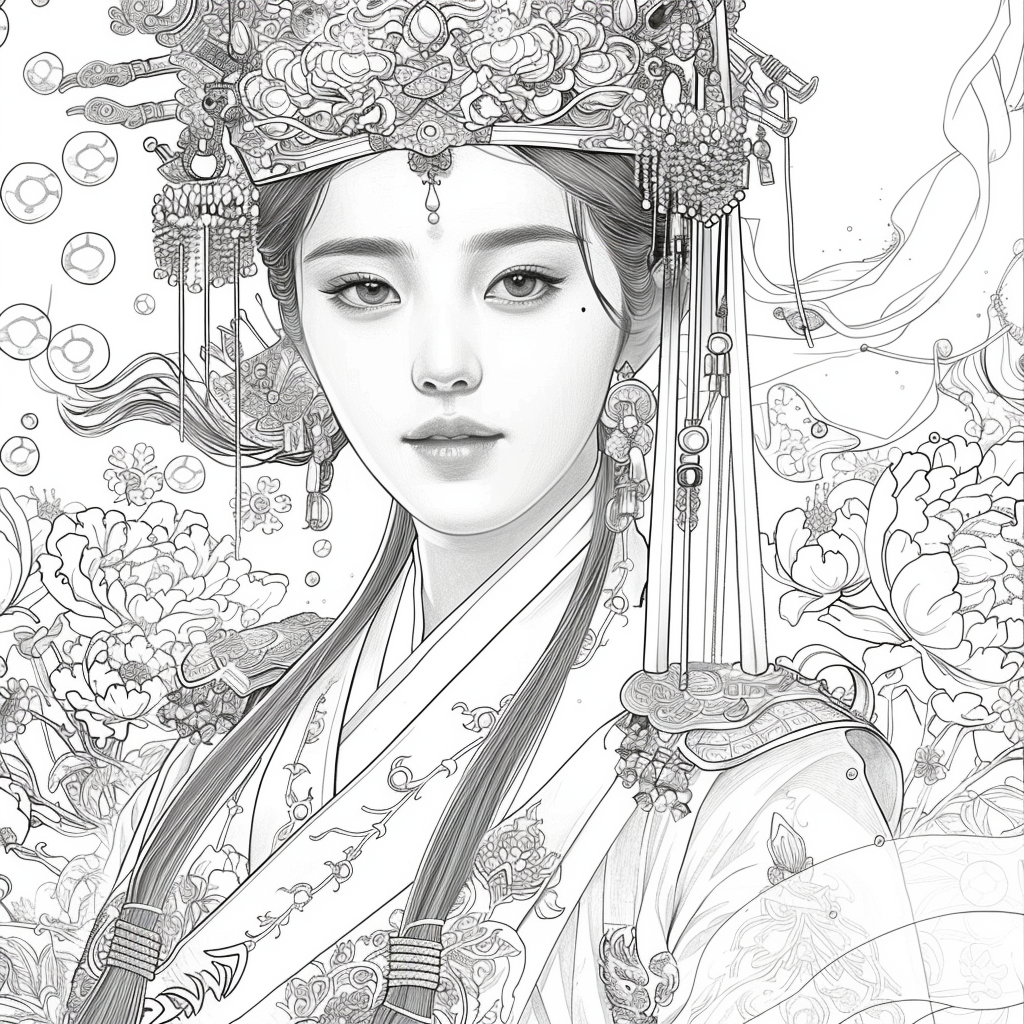 Clad in golden armor etched with imperial dragons and sacred motifs, the empress stands in resolute silence beside a majestic white elephant—her loyal companion and symbol of divine authority. Her richly adorned hanbok flows with a regal blend of cobalt blue, crimson, and saffron, while her ornate crown rises like a temple of wisdom, shimmering with celestial patterns. Behind her, clouds swirl in intricate line art, mingling with floating pearls, sacred birds, and ceremonial relics, evoking a timeless realm of sacred vows, power, and grace.