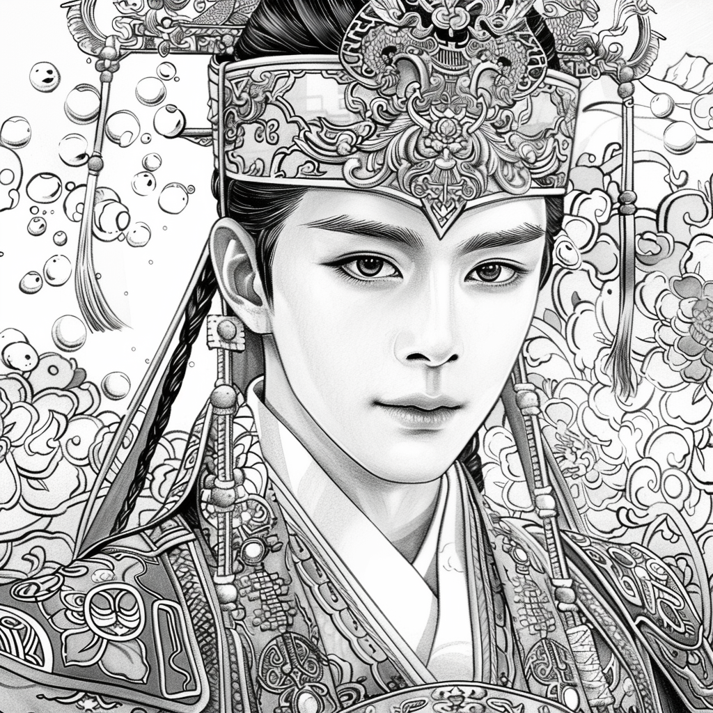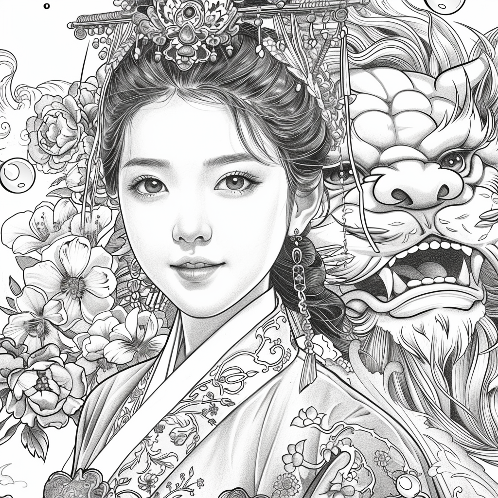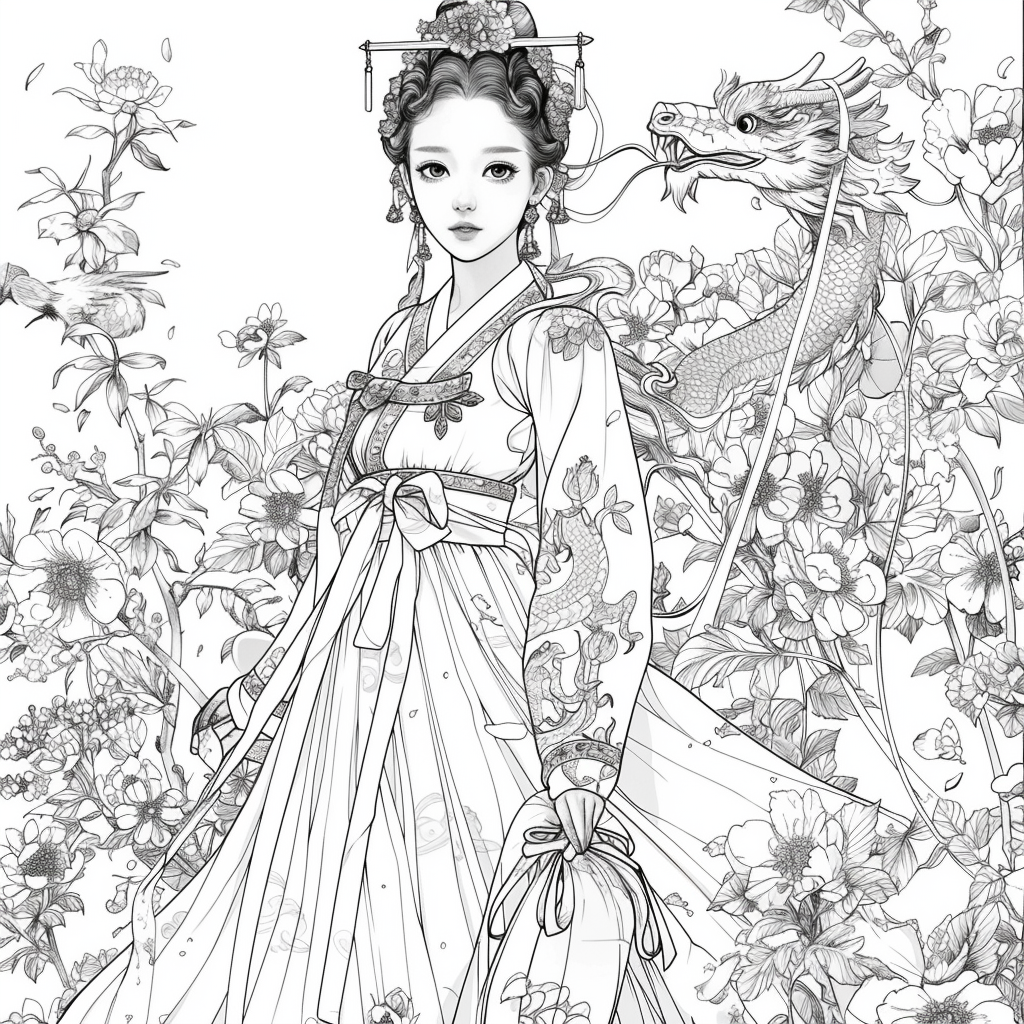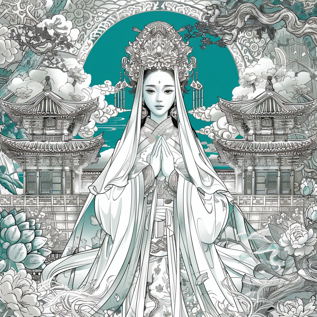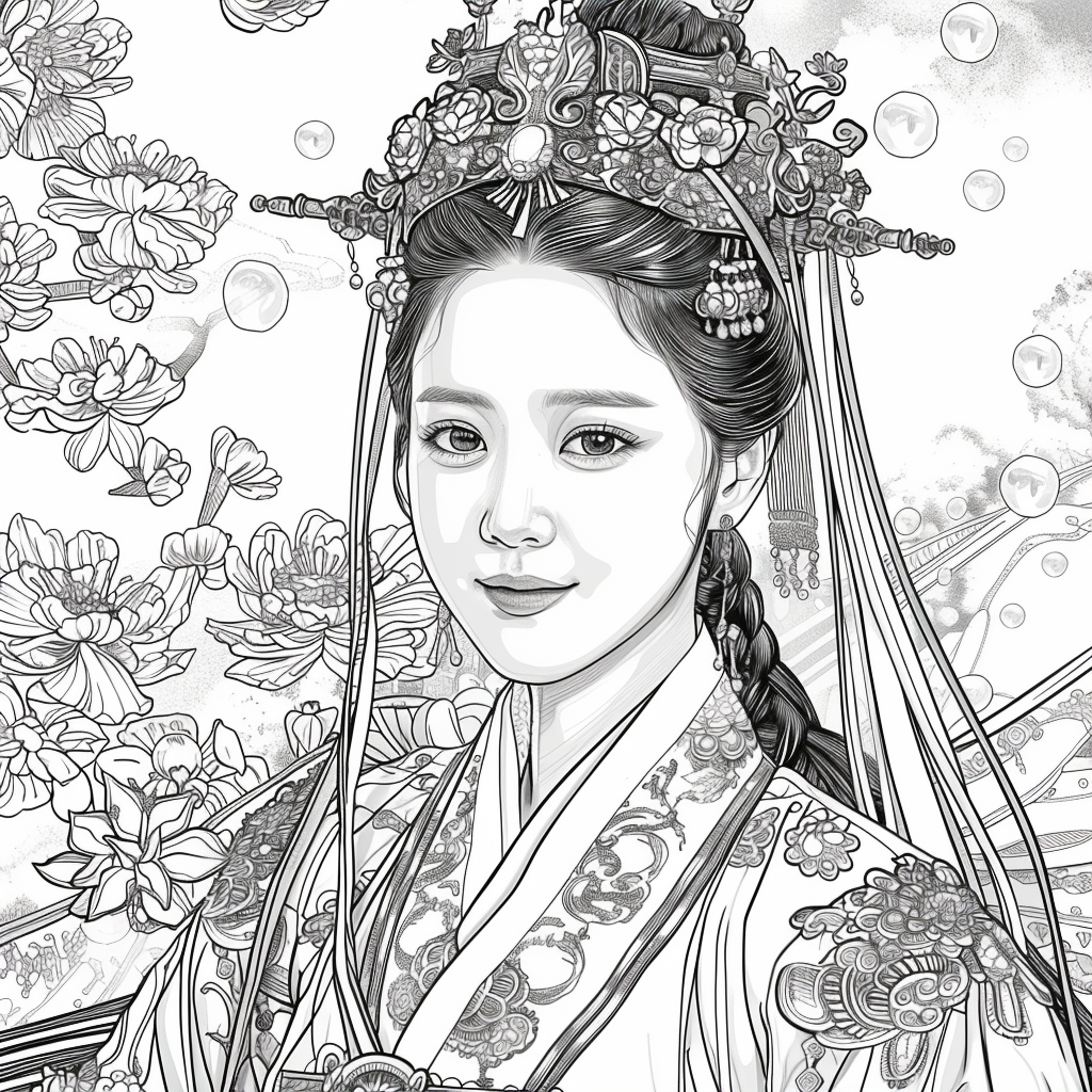 Clad in golden armor etched with imperial dragons and sacred motifs, the empress stands in resolute silence beside a majestic white elephant—her loyal companion and symbol of divine authority. Her richly adorned hanbok flows with a regal blend of cobalt blue, crimson, and saffron, while her ornate crown rises like a temple of wisdom, shimmering with celestial patterns. Behind her, clouds swirl in intricate line art, mingling with floating pearls, sacred birds, and ceremonial relics, evoking a timeless realm of sacred vows, power, and grace.