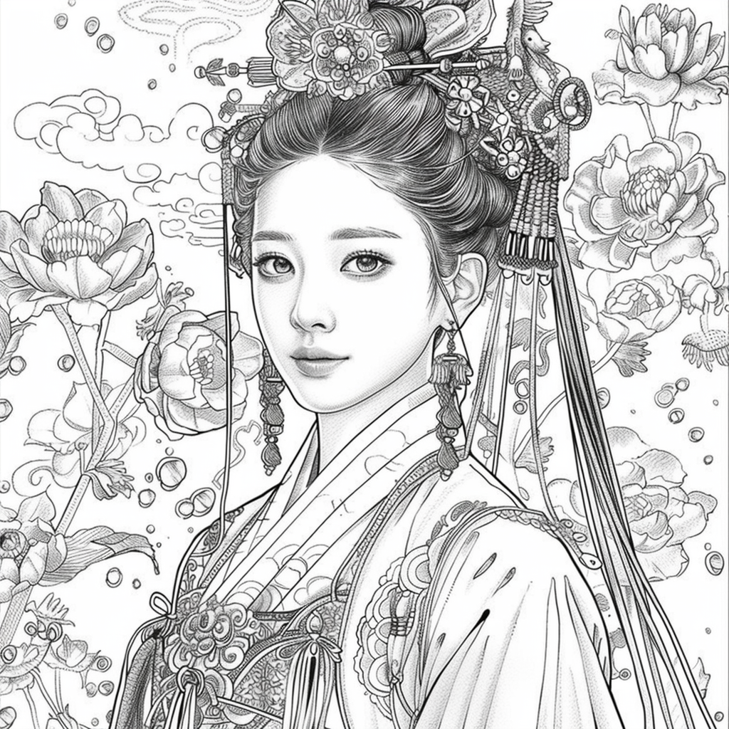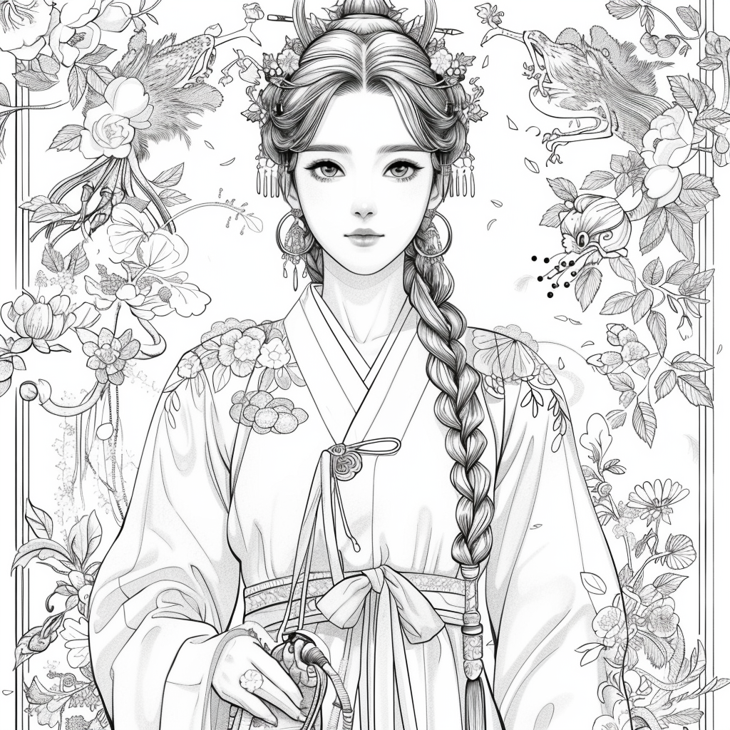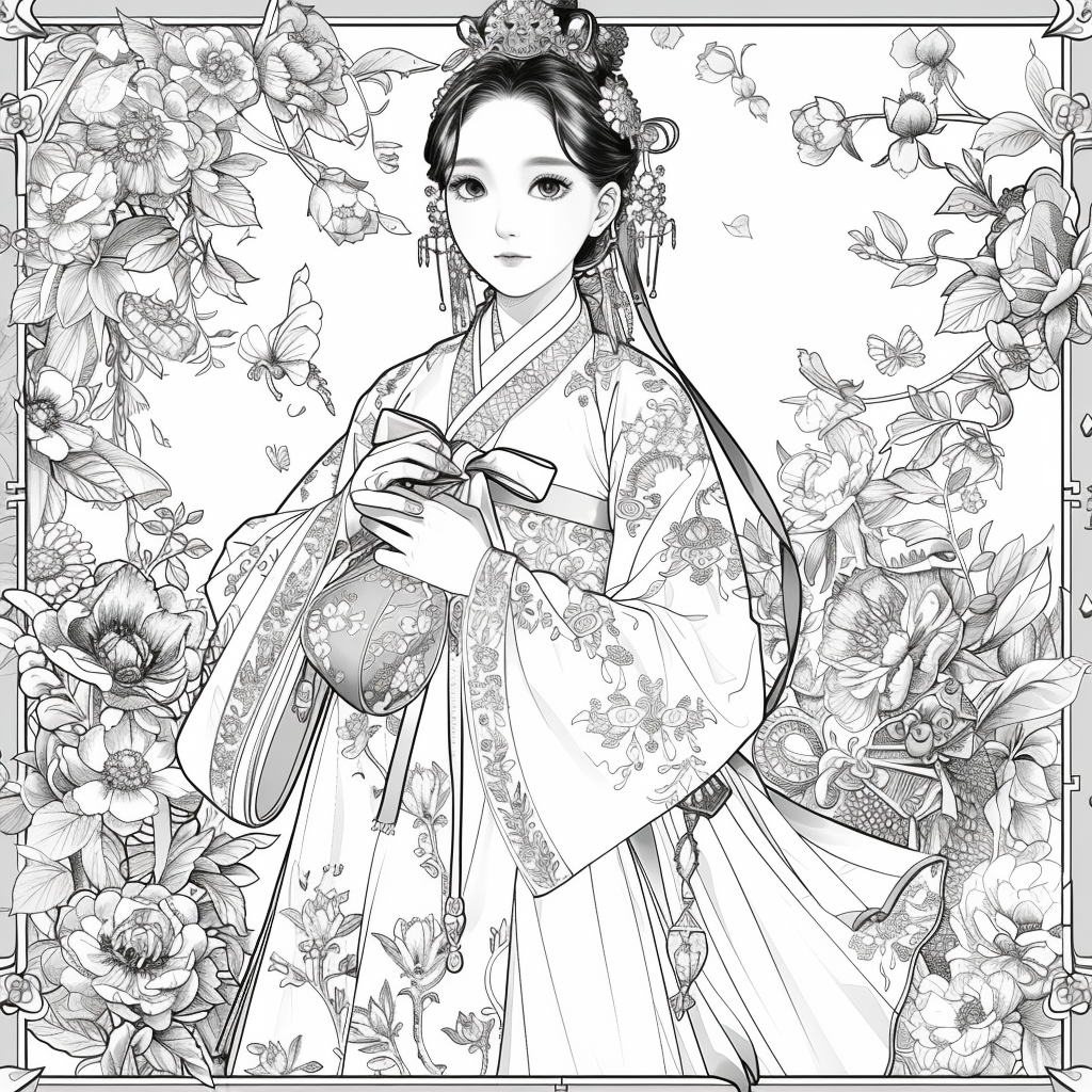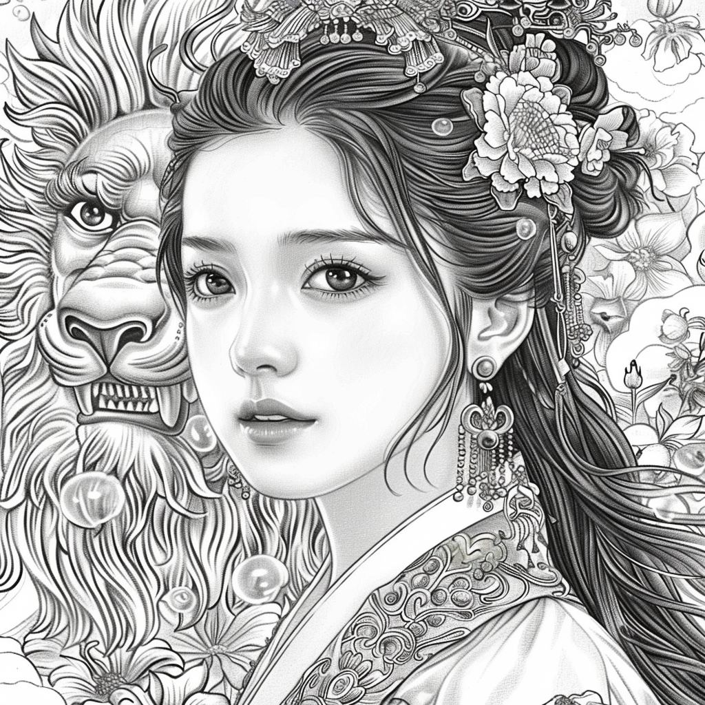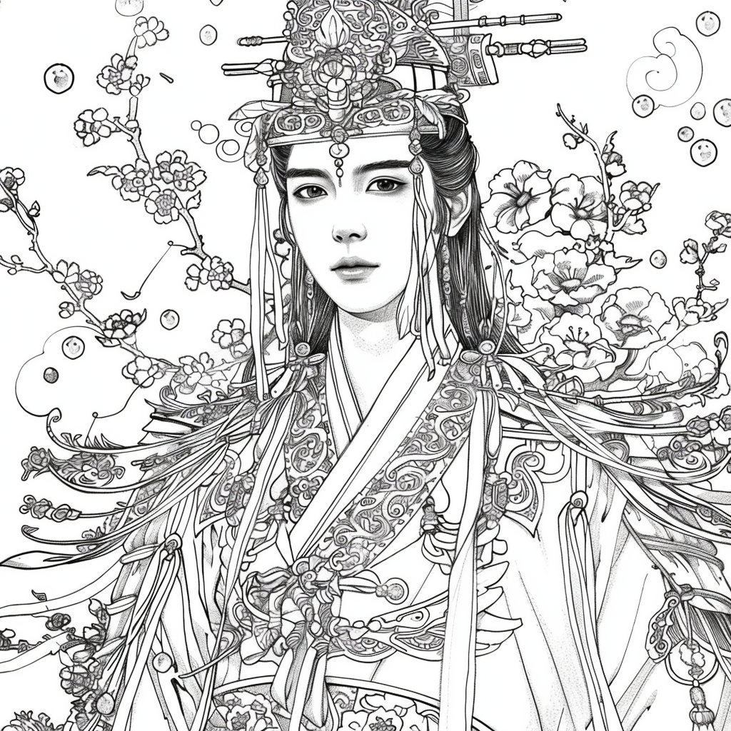 Clad in golden armor etched with imperial dragons and sacred motifs, the empress stands in resolute silence beside a majestic white elephant—her loyal companion and symbol of divine authority. Her richly adorned hanbok flows with a regal blend of cobalt blue, crimson, and saffron, while her ornate crown rises like a temple of wisdom, shimmering with celestial patterns. Behind her, clouds swirl in intricate line art, mingling with floating pearls, sacred birds, and ceremonial relics, evoking a timeless realm of sacred vows, power, and grace.