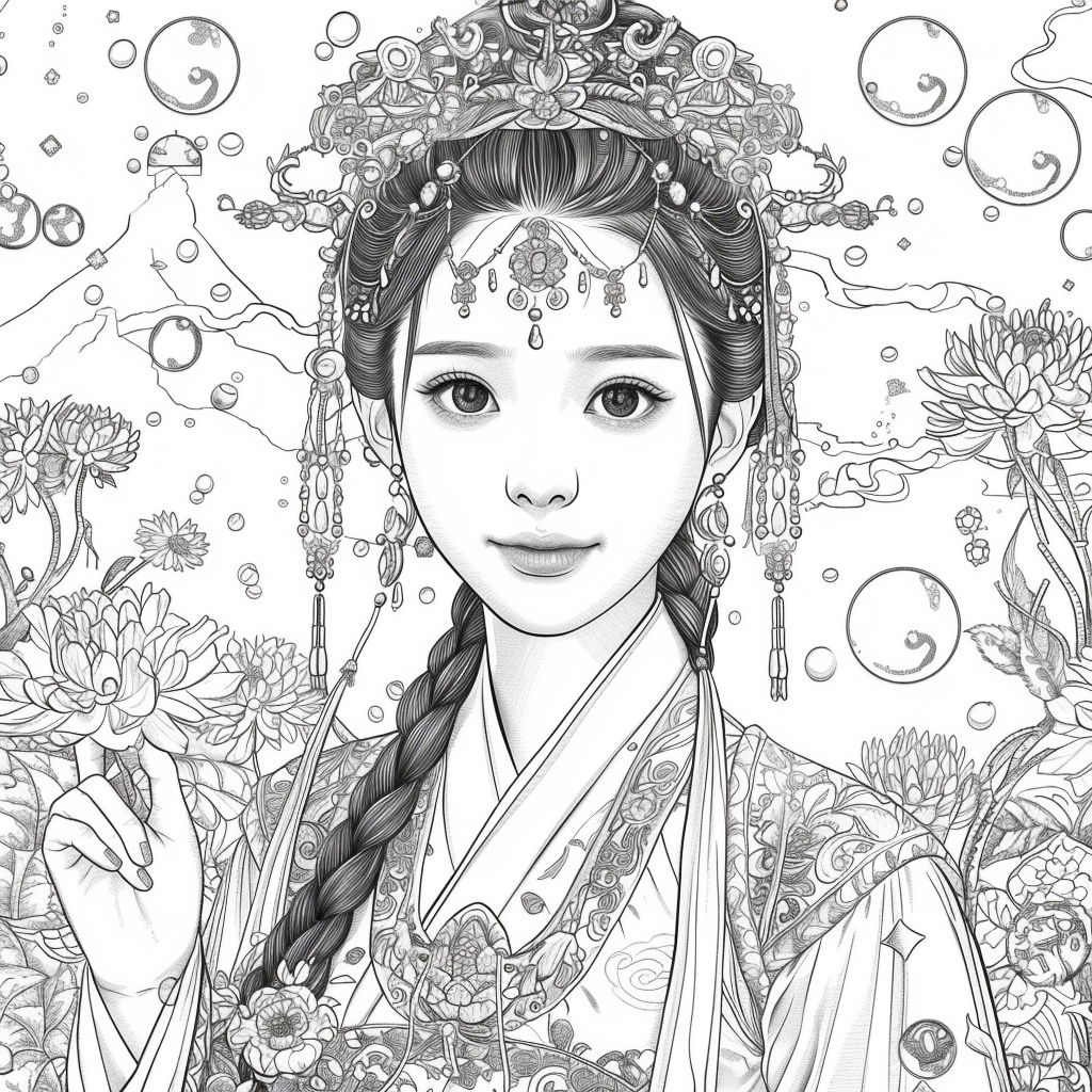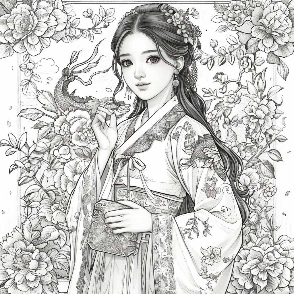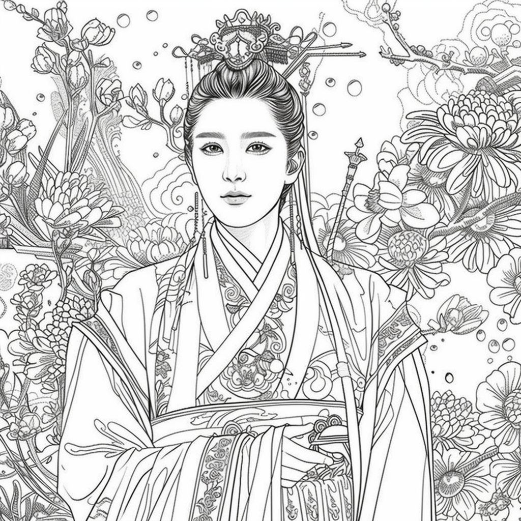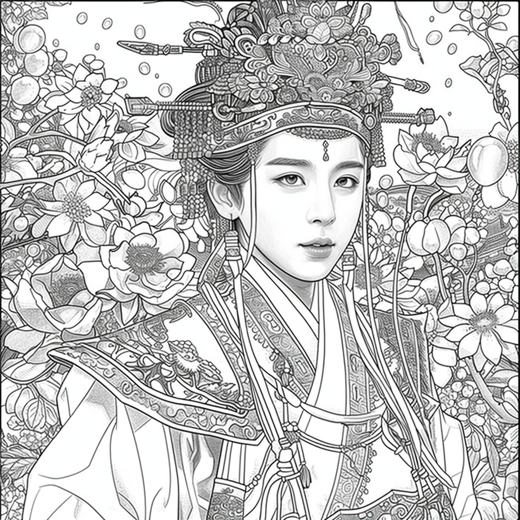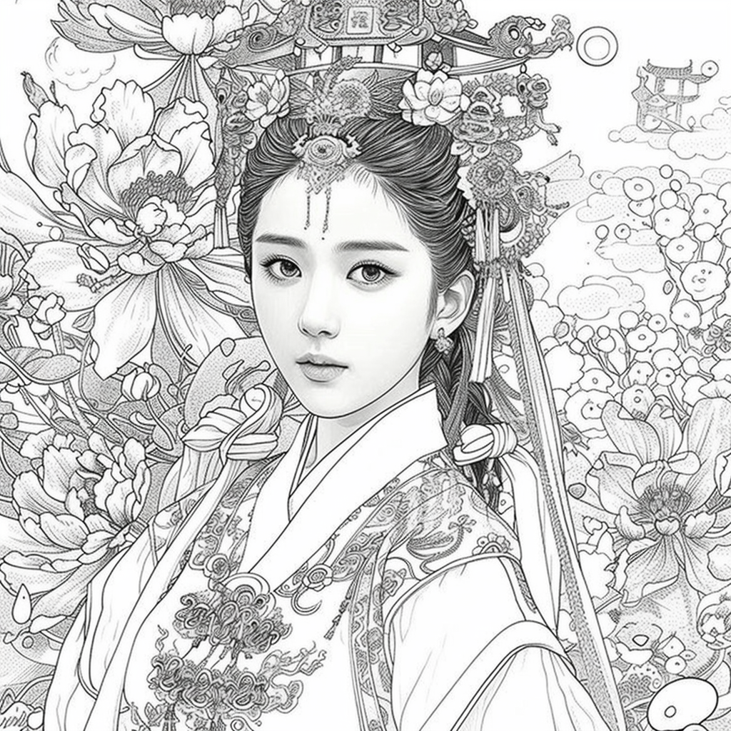 Clad in golden armor etched with imperial dragons and sacred motifs, the empress stands in resolute silence beside a majestic white elephant—her loyal companion and symbol of divine authority. Her richly adorned hanbok flows with a regal blend of cobalt blue, crimson, and saffron, while her ornate crown rises like a temple of wisdom, shimmering with celestial patterns. Behind her, clouds swirl in intricate line art, mingling with floating pearls, sacred birds, and ceremonial relics, evoking a timeless realm of sacred vows, power, and grace.