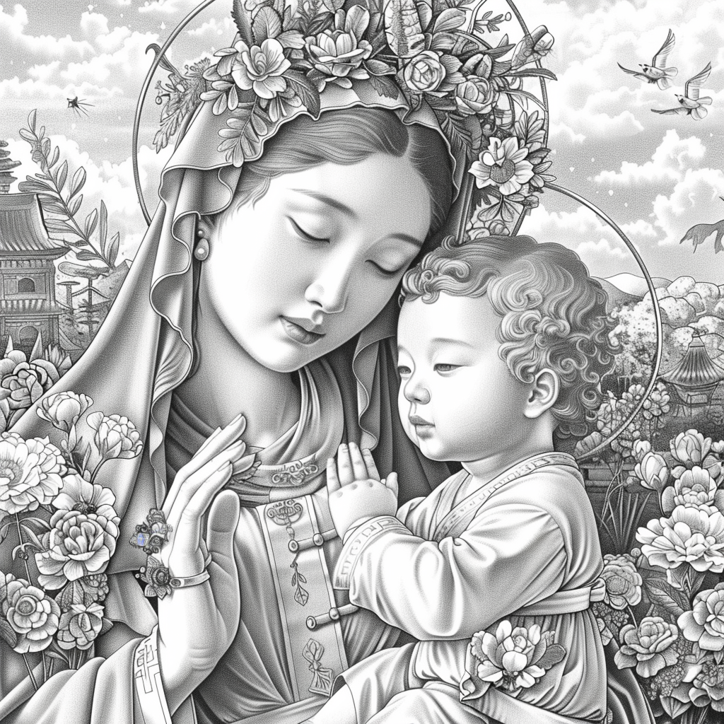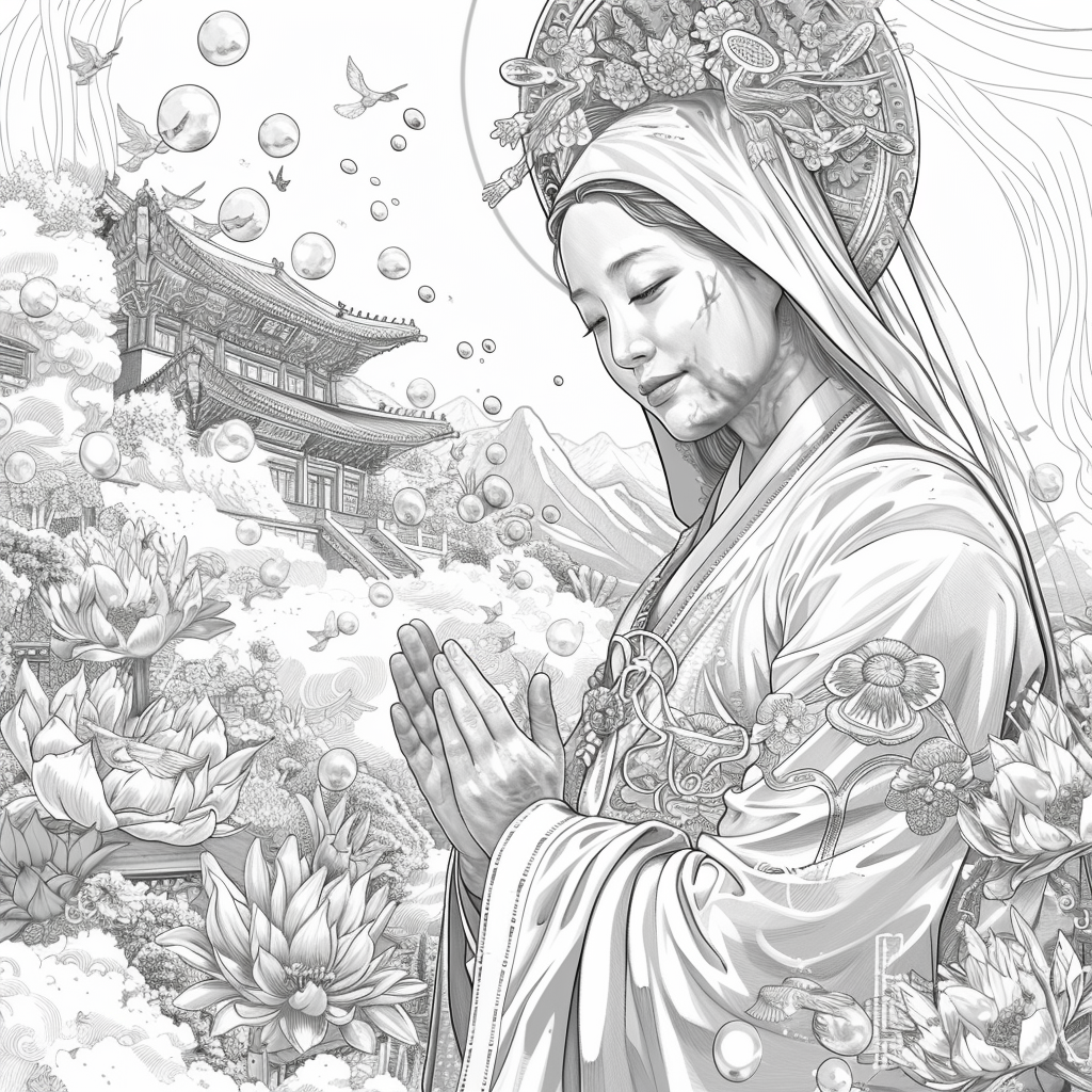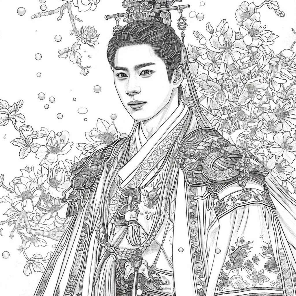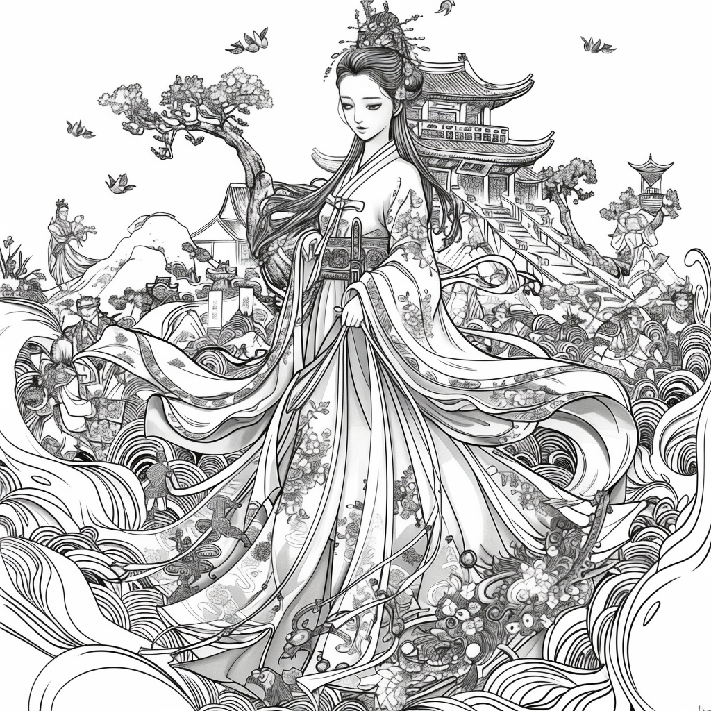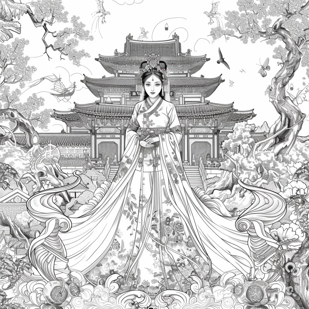 Clad in golden armor etched with imperial dragons and sacred motifs, the empress stands in resolute silence beside a majestic white elephant—her loyal companion and symbol of divine authority. Her richly adorned hanbok flows with a regal blend of cobalt blue, crimson, and saffron, while her ornate crown rises like a temple of wisdom, shimmering with celestial patterns. Behind her, clouds swirl in intricate line art, mingling with floating pearls, sacred birds, and ceremonial relics, evoking a timeless realm of sacred vows, power, and grace.