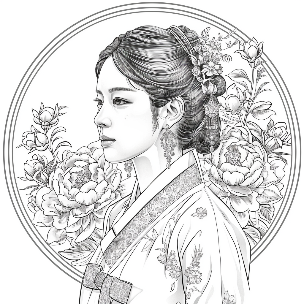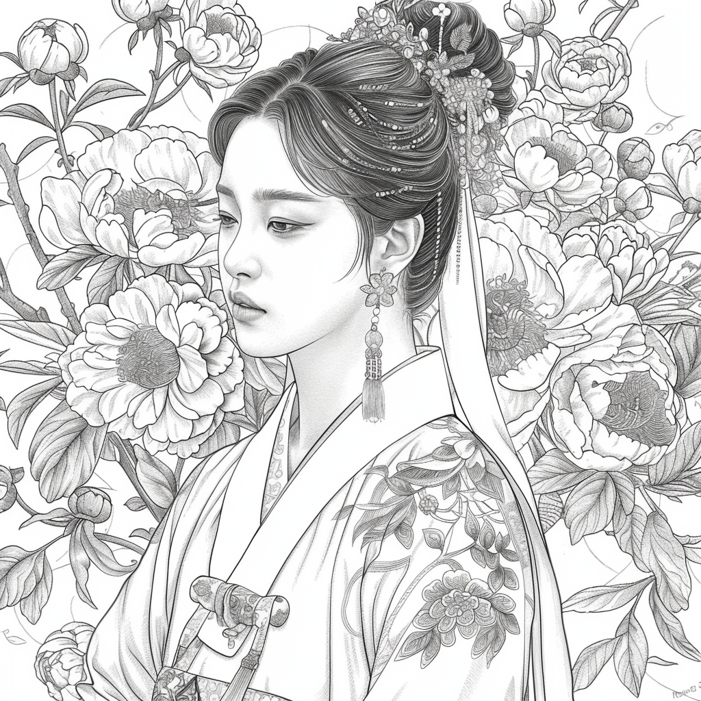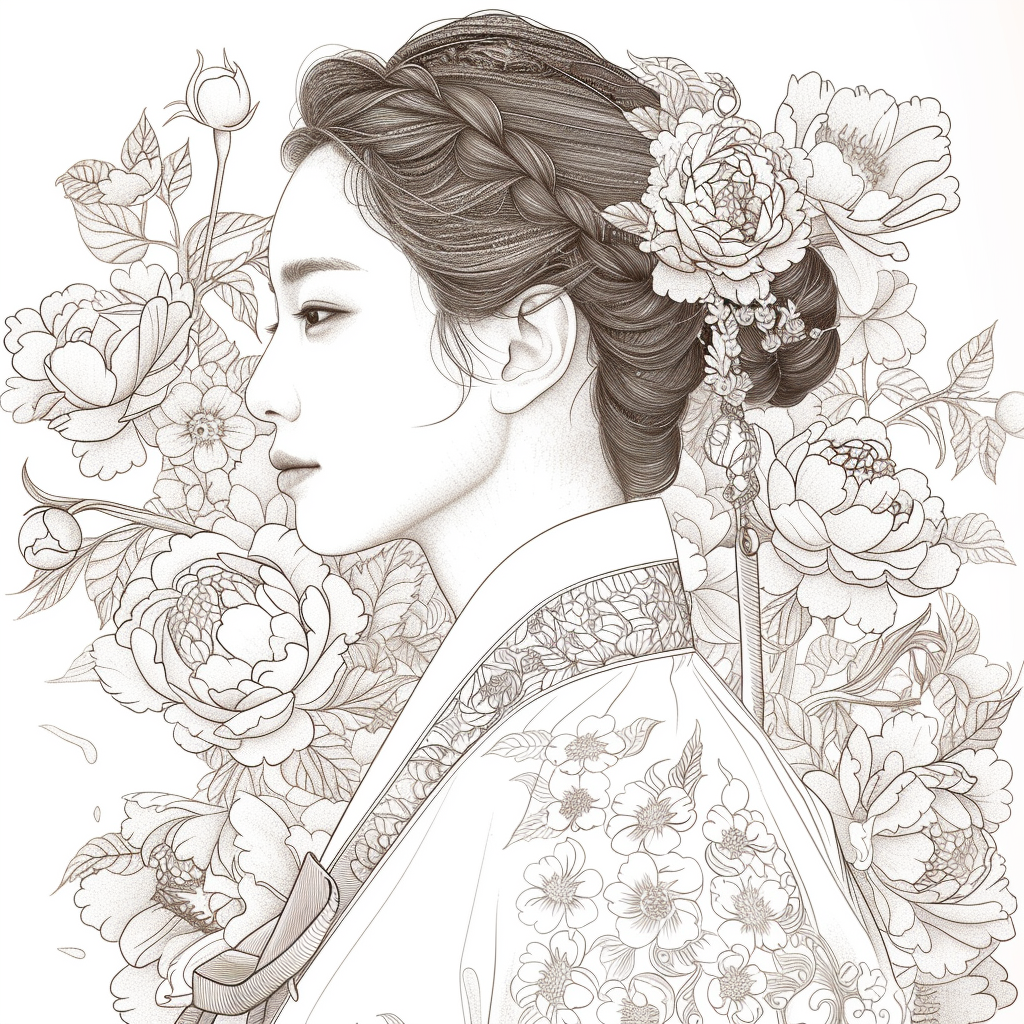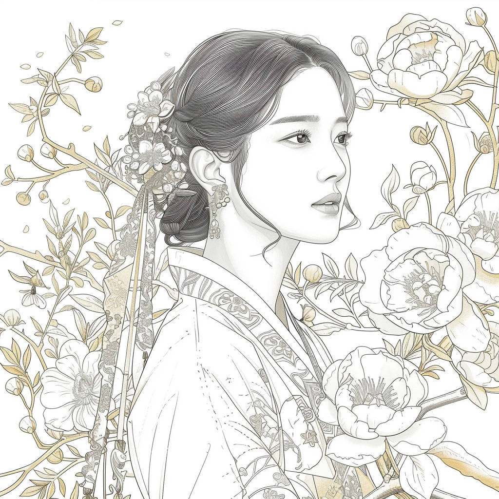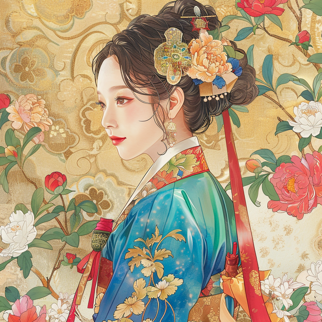A refined portrait of a beautiful Korean woman in traditional hanbok, adorned with elegant floral hair ornaments and golden accessories. Her serene profile is framed by blooming peonies and delicate patterns, symbolizing grace, nobility, and timeless cultural heritage. The vivid blue silk contrasts with the warm floral background, evoking harmony between tradition and nature.