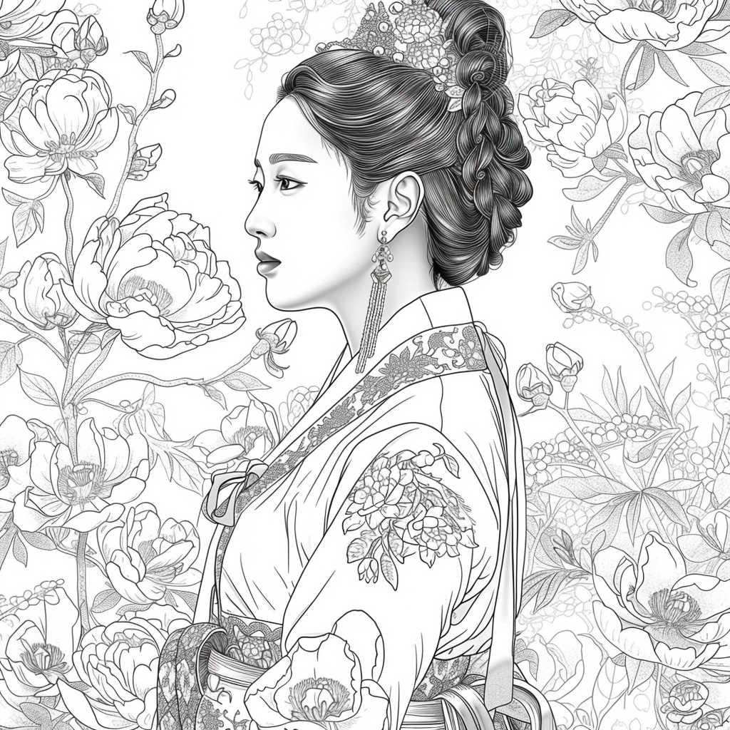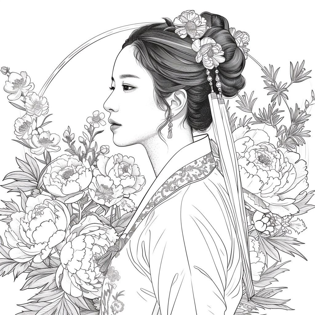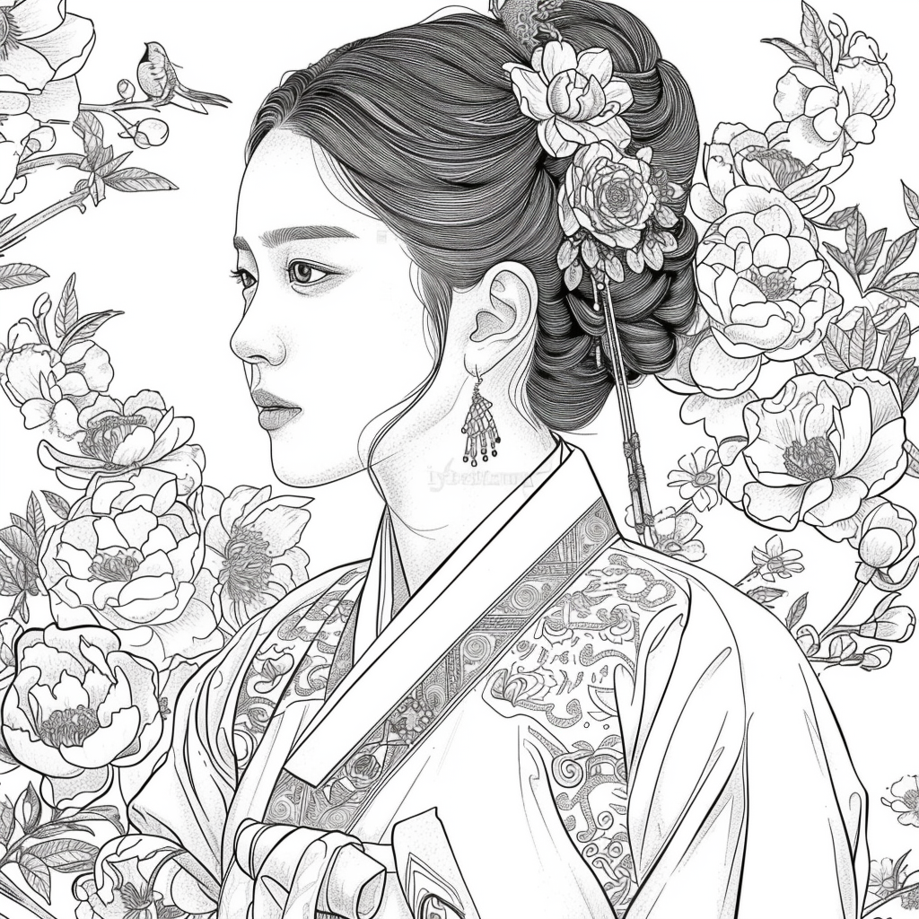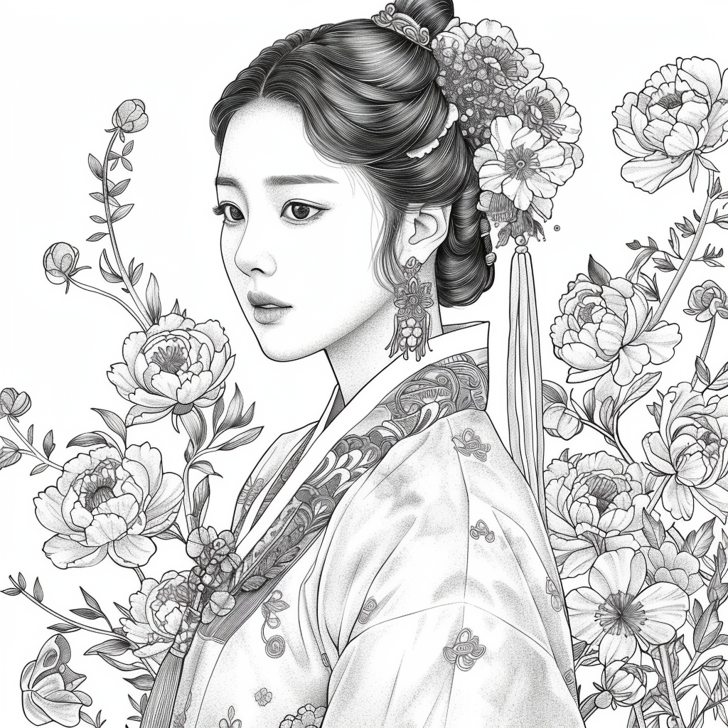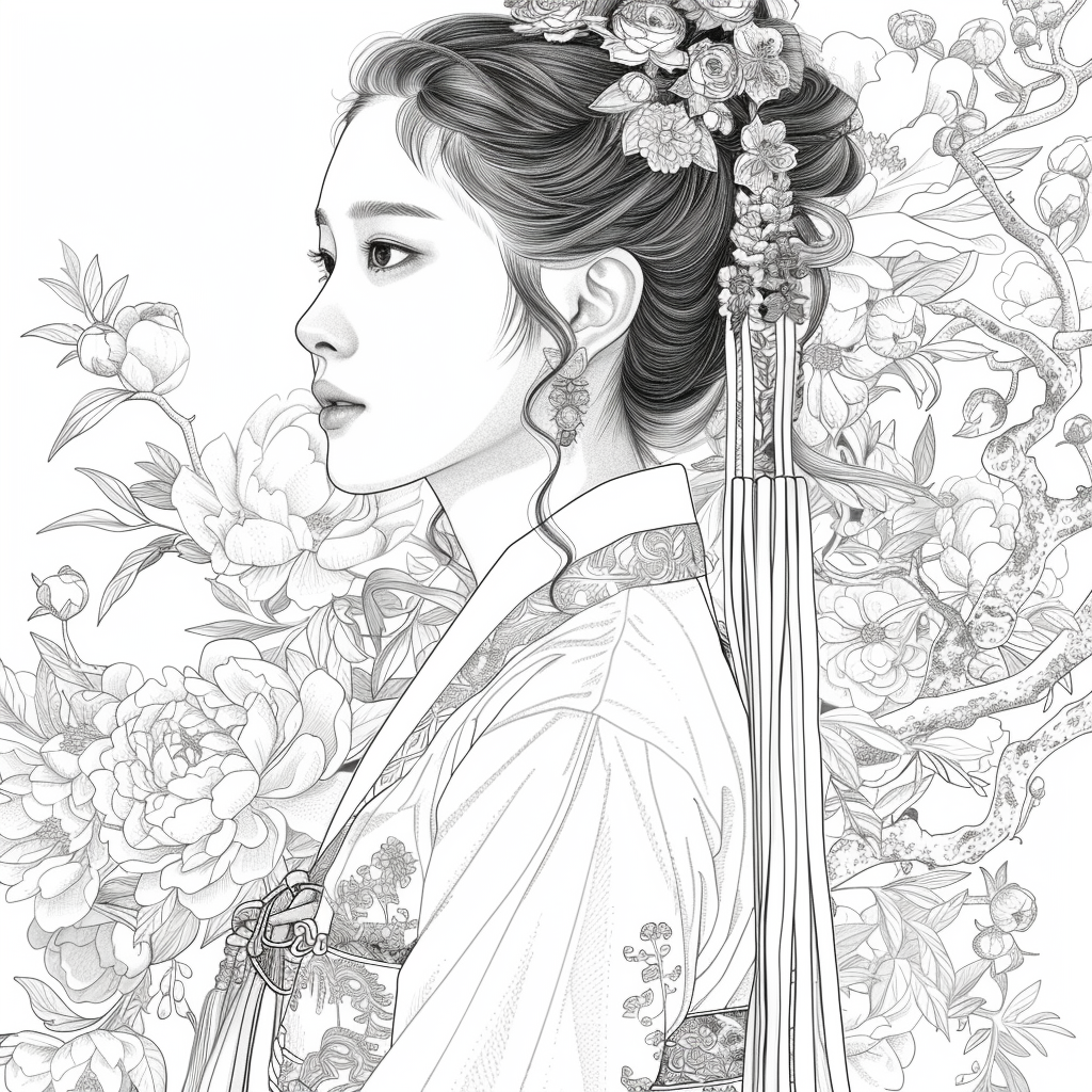 A refined portrait of a beautiful Korean woman in traditional hanbok, adorned with elegant floral hair ornaments and golden accessories. Her serene profile is framed by blooming peonies and delicate patterns, symbolizing grace, nobility, and timeless cultural heritage. The vivid blue silk contrasts with the warm floral background, evoking harmony between tradition and nature.