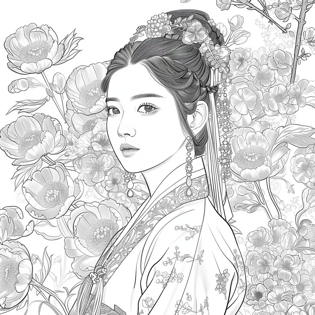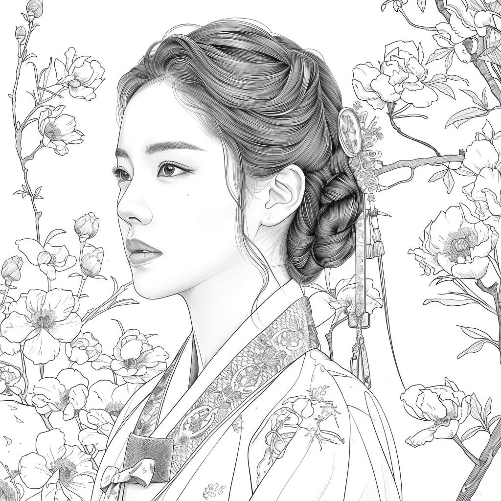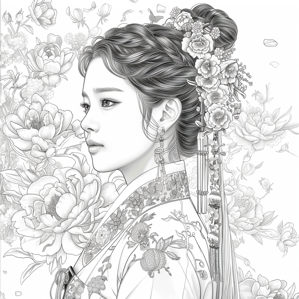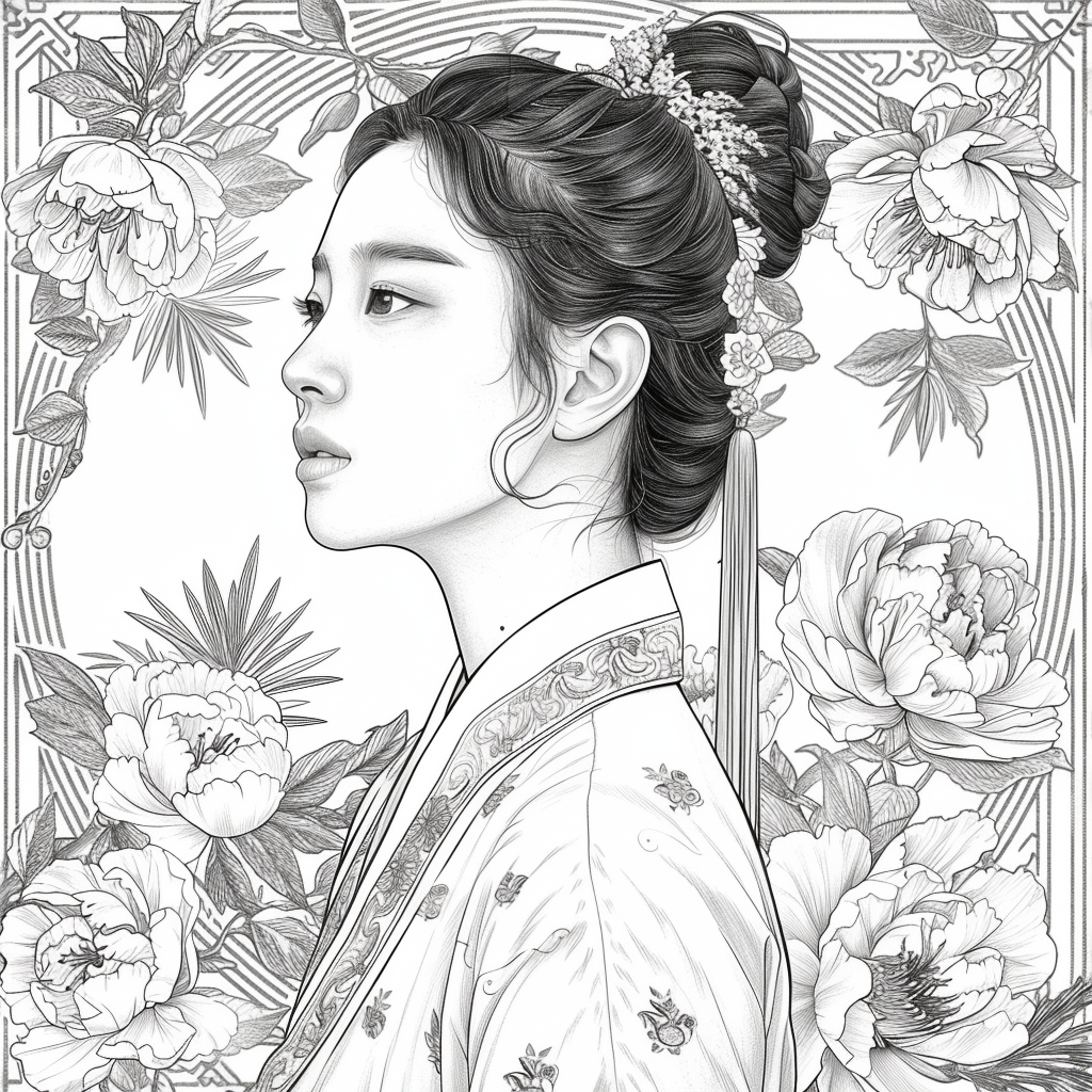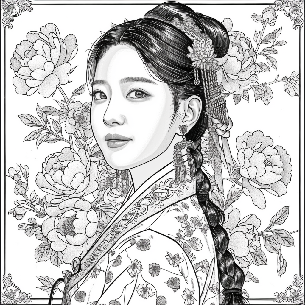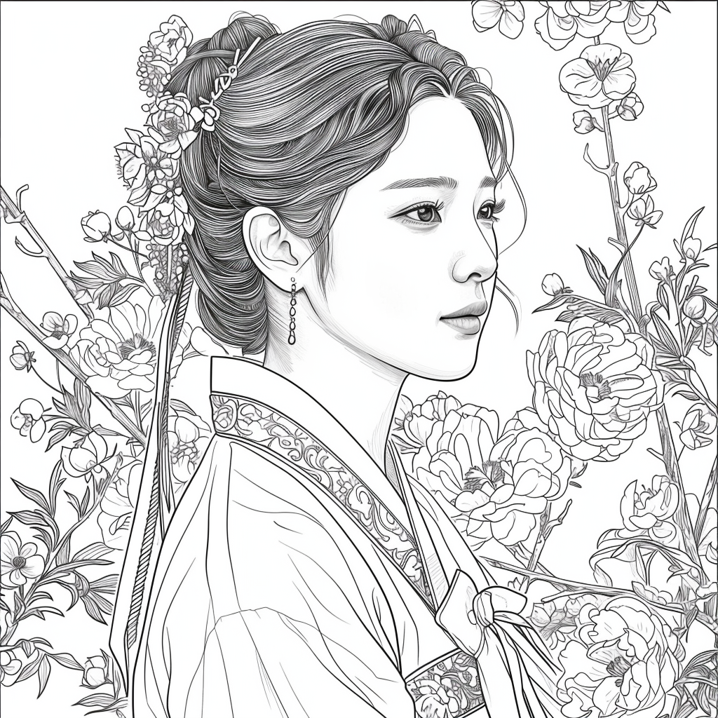 A refined portrait of a beautiful Korean woman in traditional hanbok, adorned with elegant floral hair ornaments and golden accessories. Her serene profile is framed by blooming peonies and delicate patterns, symbolizing grace, nobility, and timeless cultural heritage. The vivid blue silk contrasts with the warm floral background, evoking harmony between tradition and nature.