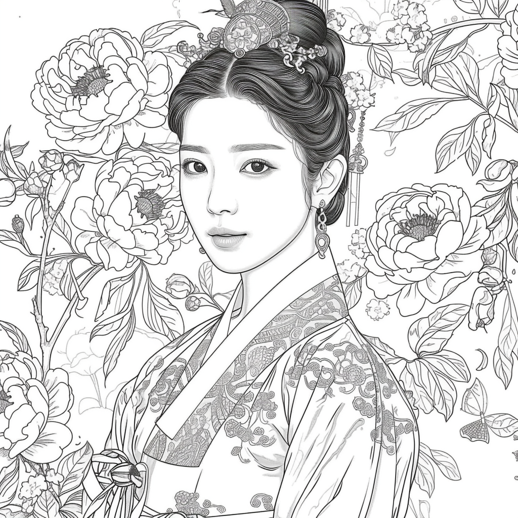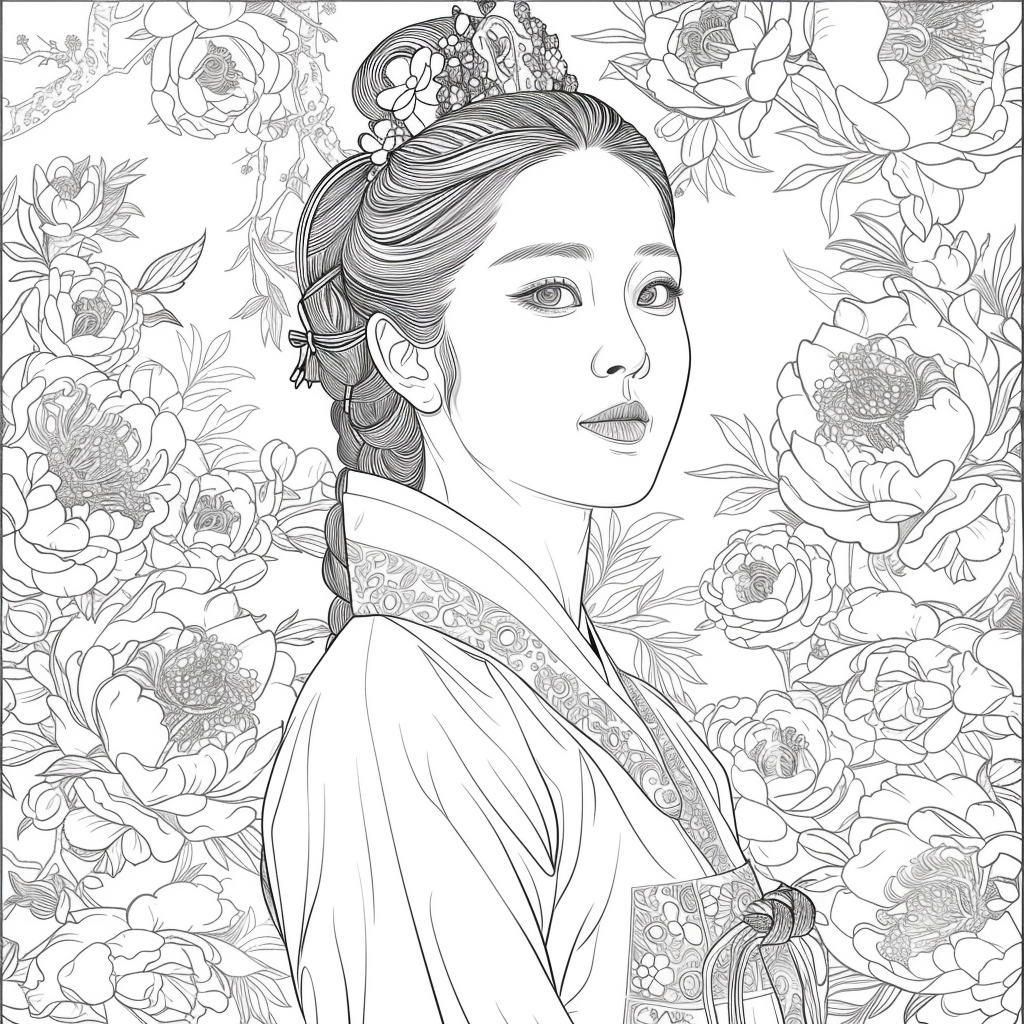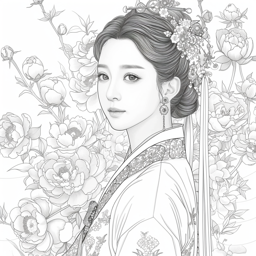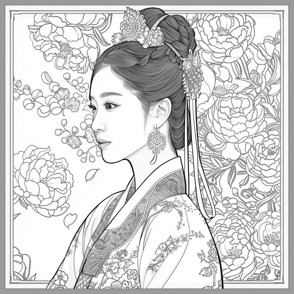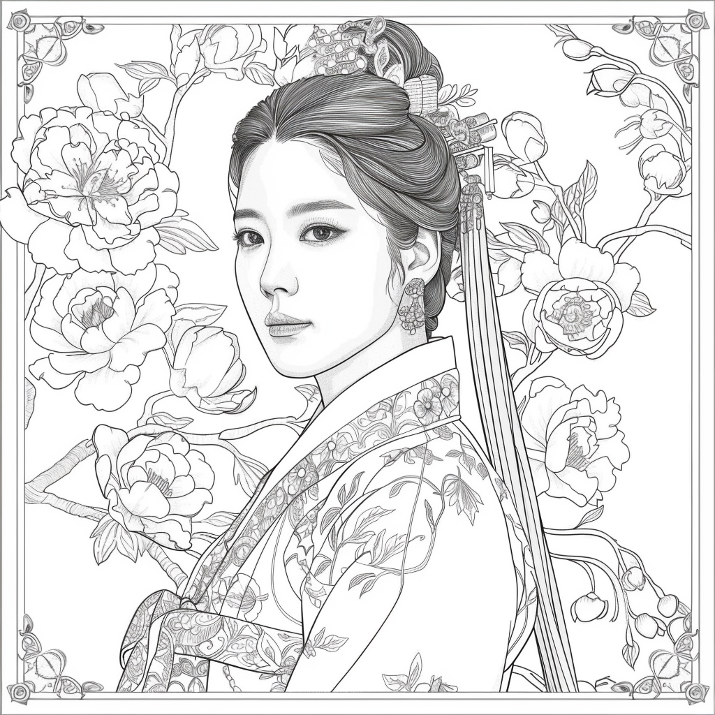 A refined portrait of a beautiful Korean woman in traditional hanbok, adorned with elegant floral hair ornaments and golden accessories. Her serene profile is framed by blooming peonies and delicate patterns, symbolizing grace, nobility, and timeless cultural heritage. The vivid blue silk contrasts with the warm floral background, evoking harmony between tradition and nature.