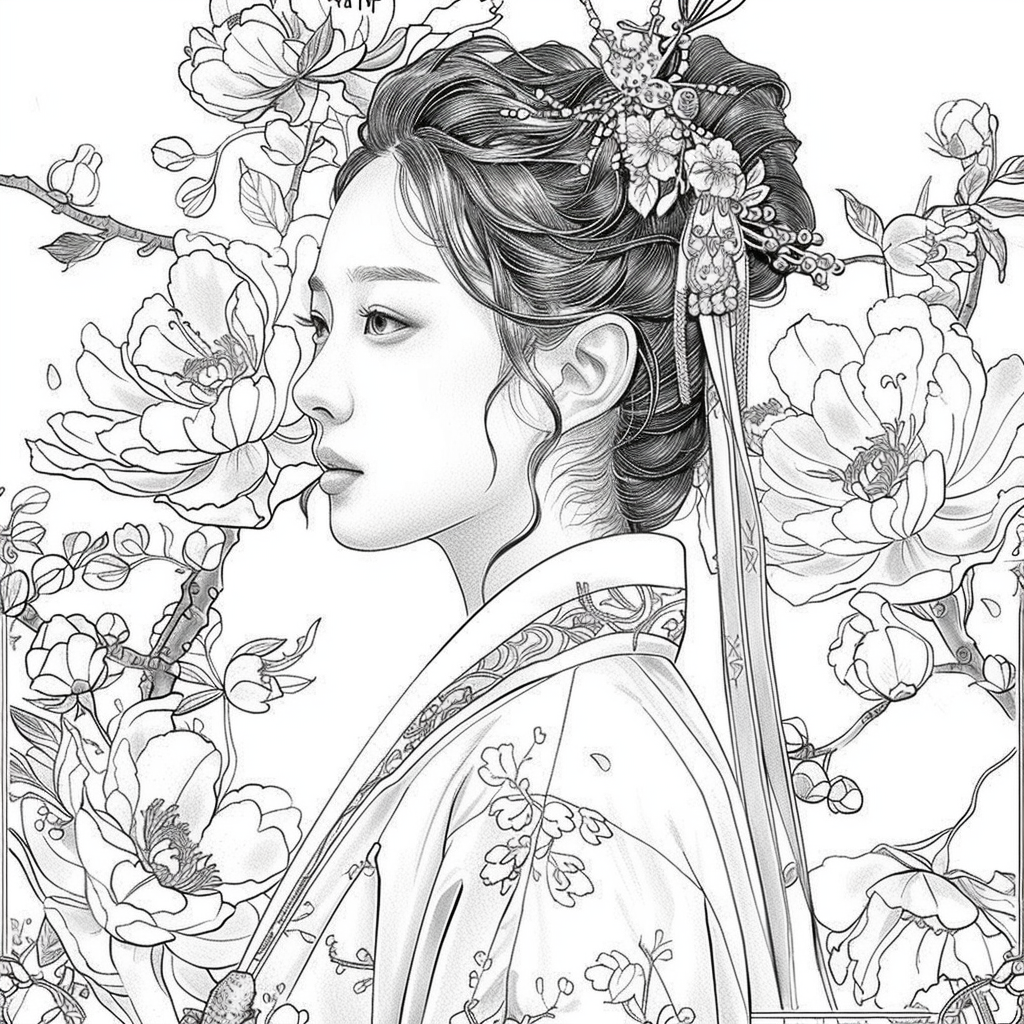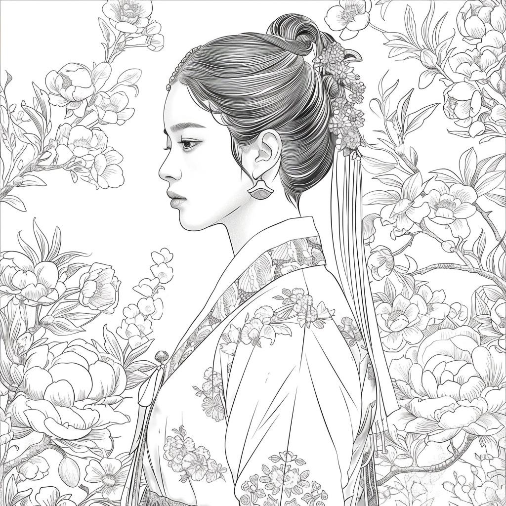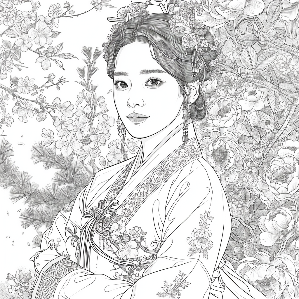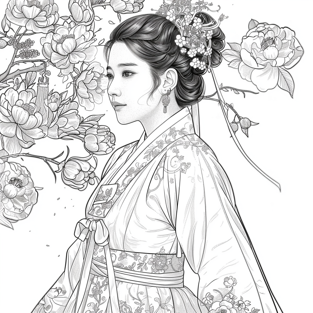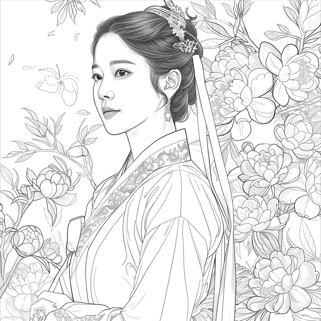 A refined portrait of a beautiful Korean woman in traditional hanbok, adorned with elegant floral hair ornaments and golden accessories. Her serene profile is framed by blooming peonies and delicate patterns, symbolizing grace, nobility, and timeless cultural heritage. The vivid blue silk contrasts with the warm floral background, evoking harmony between tradition and nature.