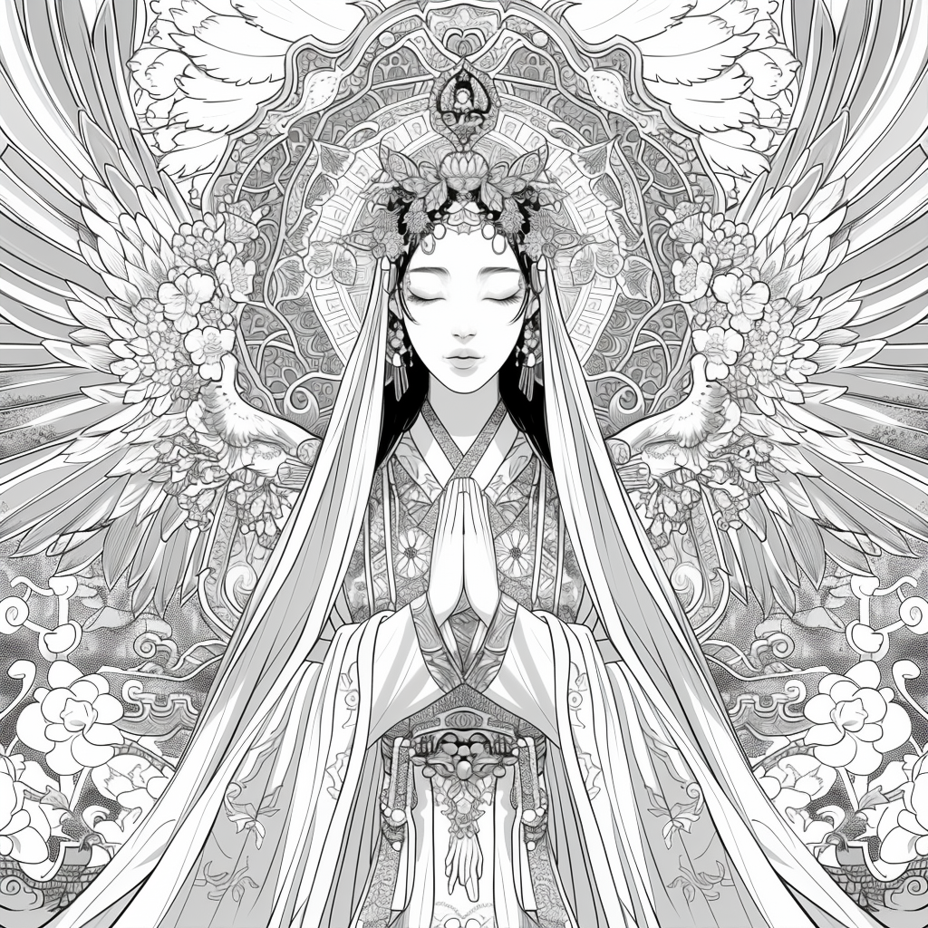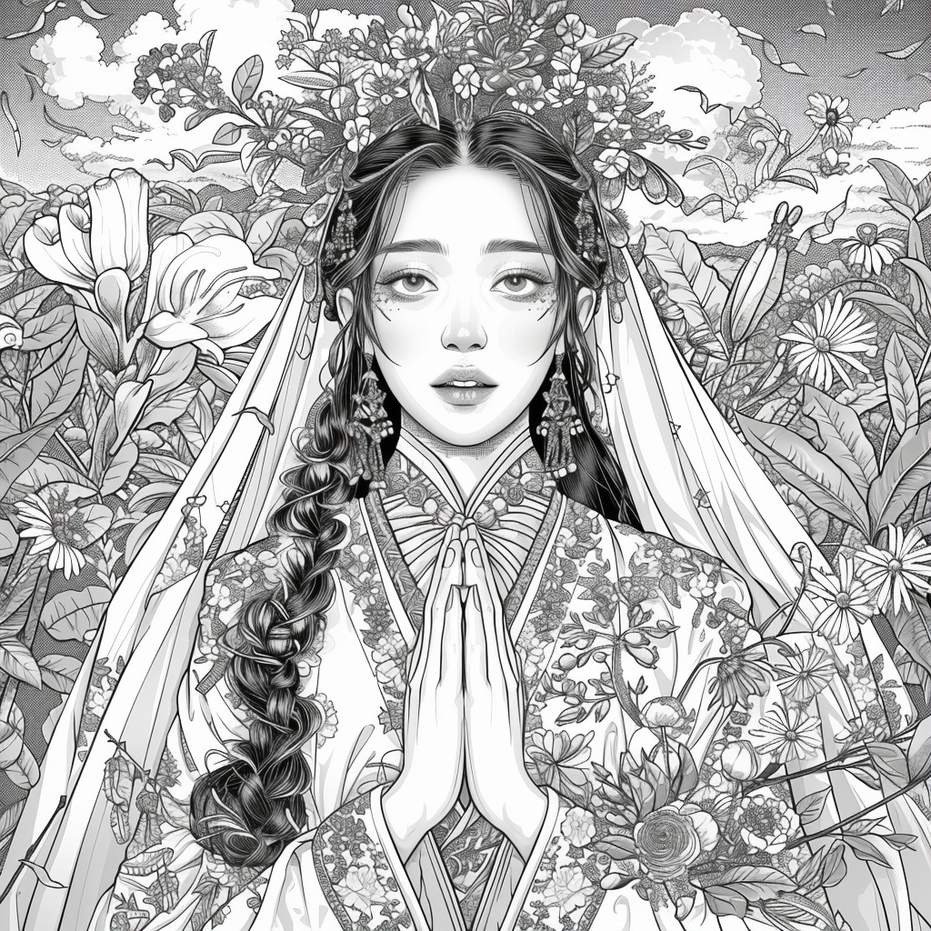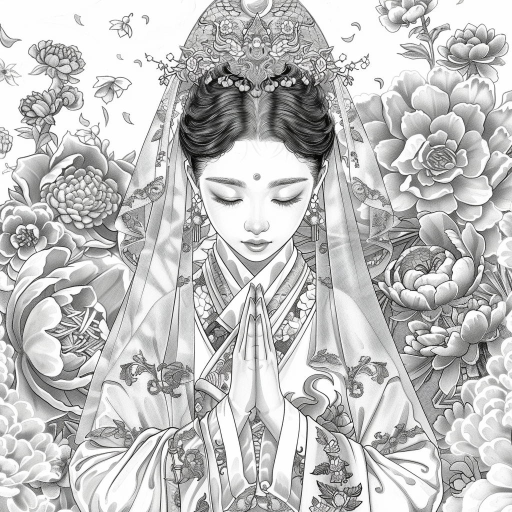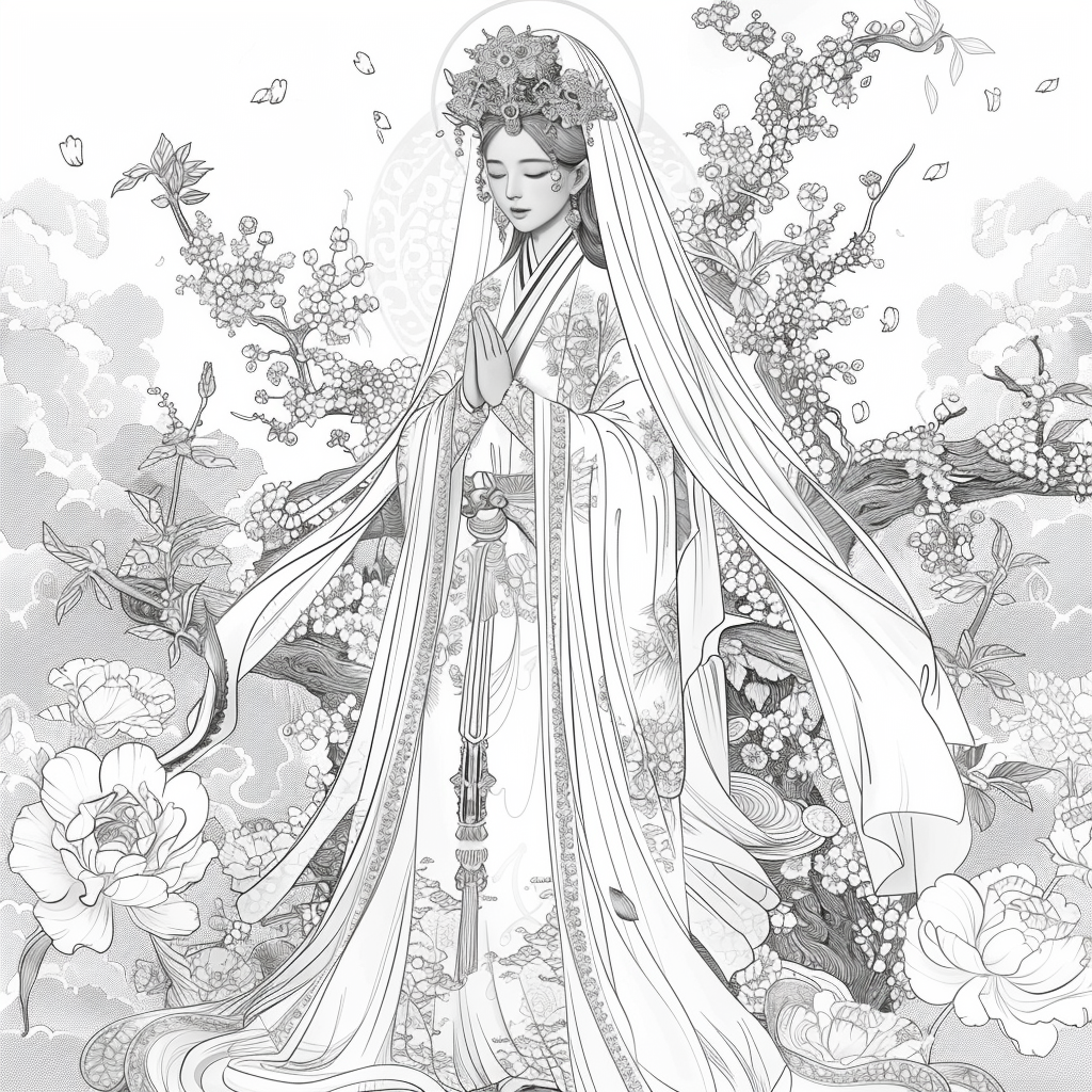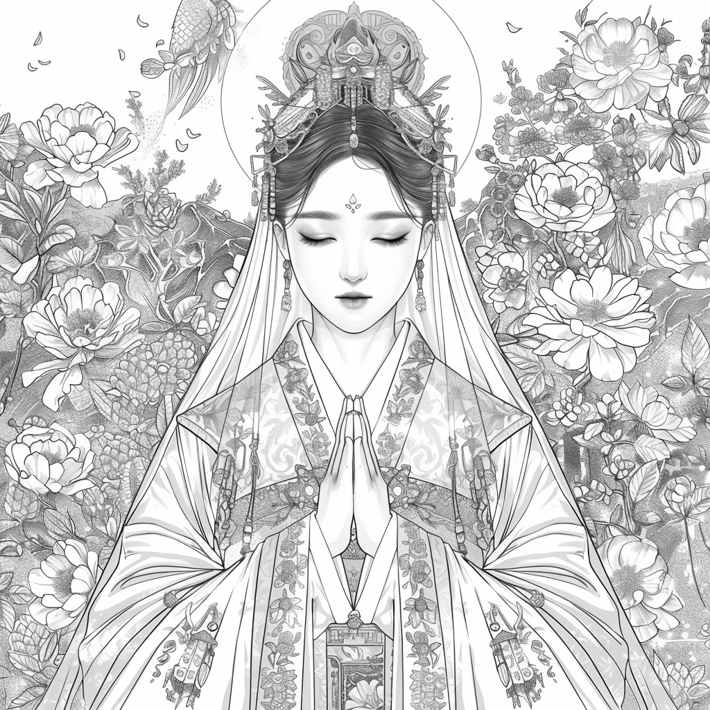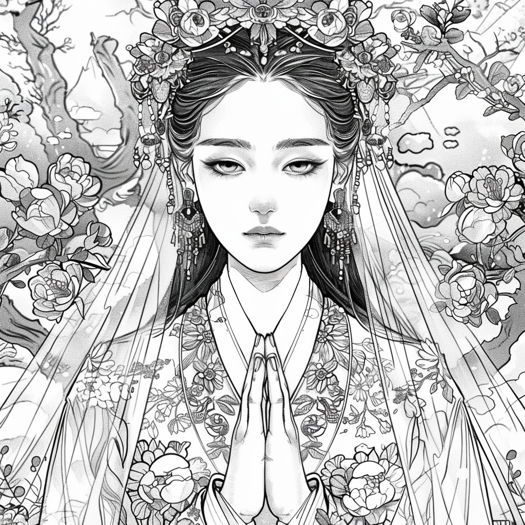This majestic digital painting illustrates a powerful and serene water goddess cloaked in vibrant ceremonial robes, standing at the heart of a mythical realm. With hands joined in prayer and her veil flowing like mist, she radiates spiritual sovereignty, balance, and elemental command.