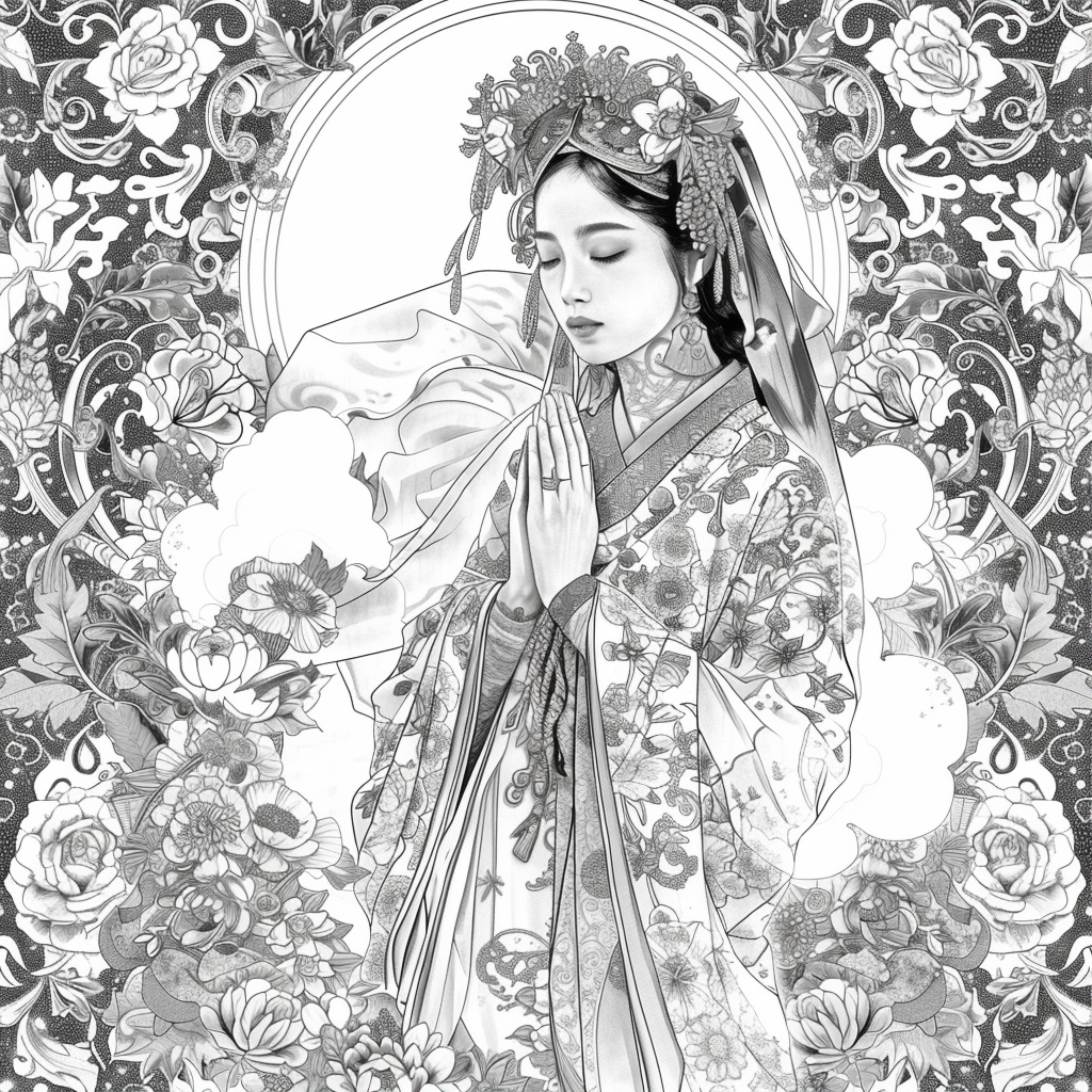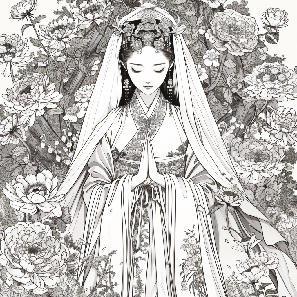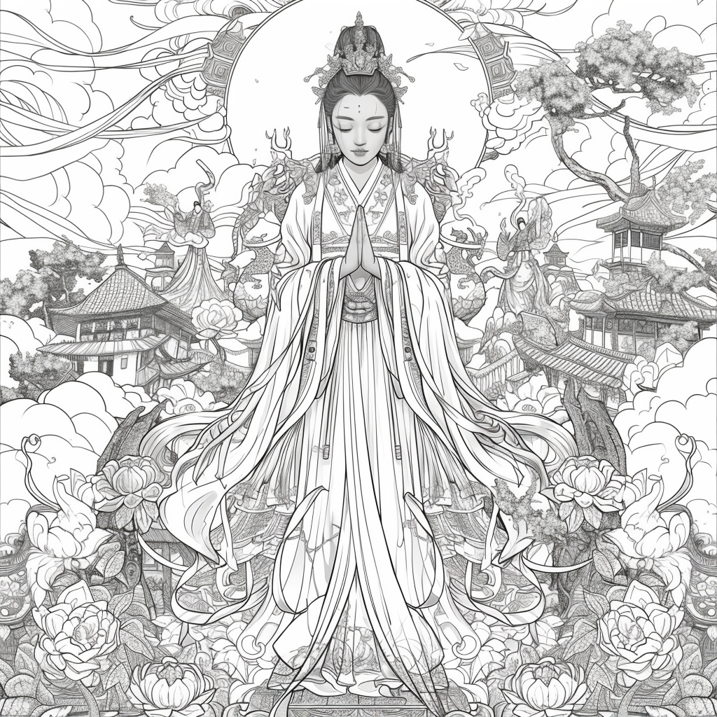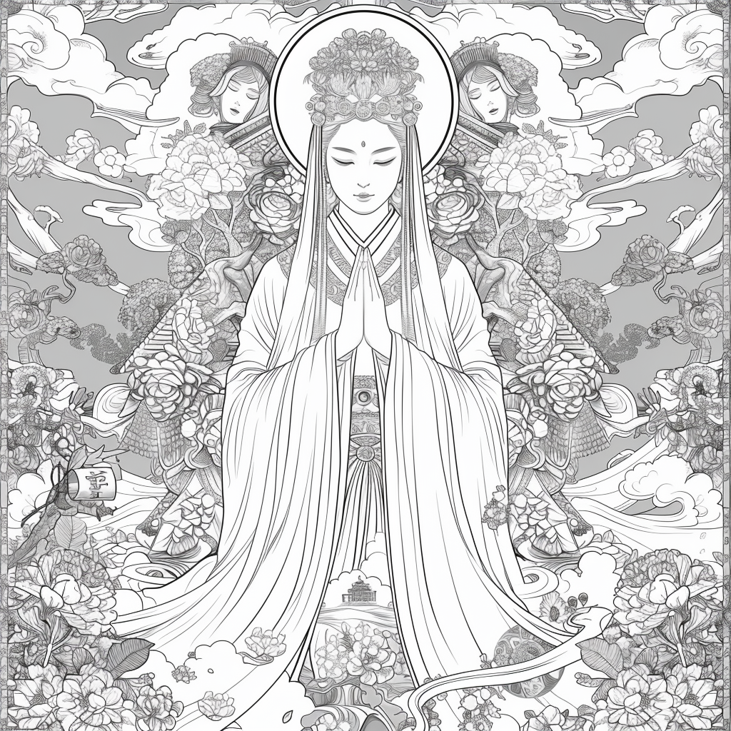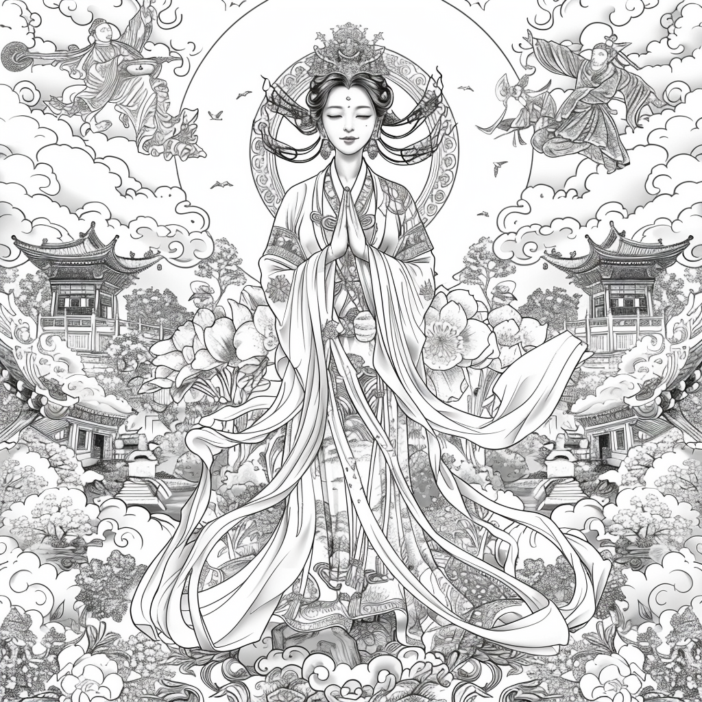 This majestic digital painting illustrates a powerful and serene water goddess cloaked in vibrant ceremonial robes, standing at the heart of a mythical realm. With hands joined in prayer and her veil flowing like mist, she radiates spiritual sovereignty, balance, and elemental command.