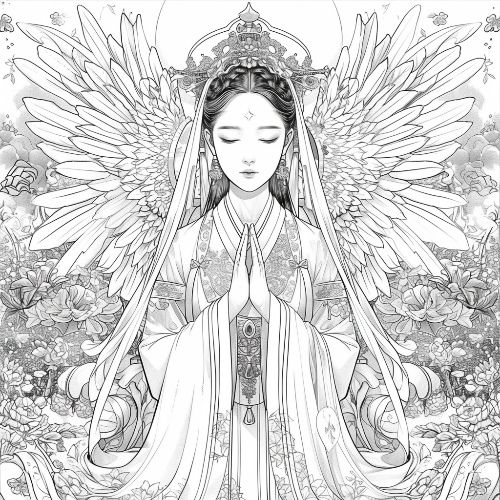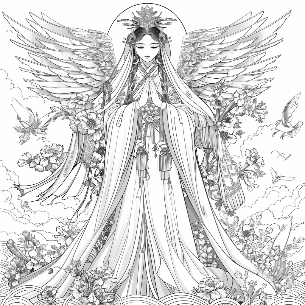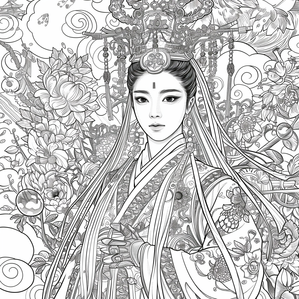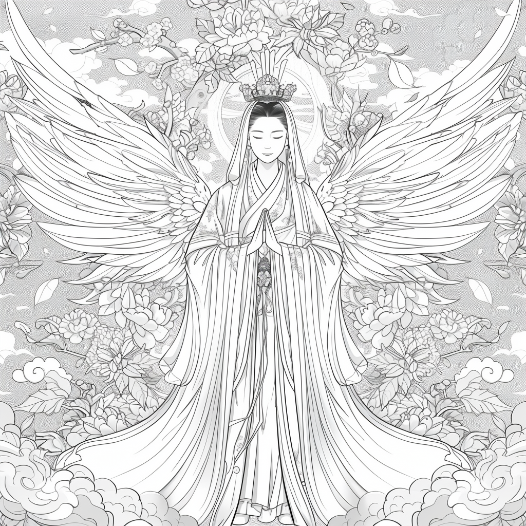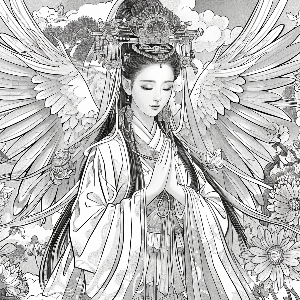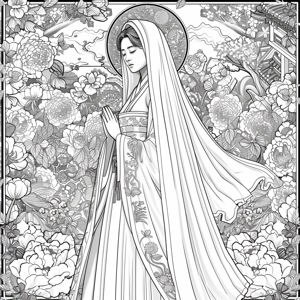 This majestic digital painting illustrates a powerful and serene water goddess cloaked in vibrant ceremonial robes, standing at the heart of a mythical realm. With hands joined in prayer and her veil flowing like mist, she radiates spiritual sovereignty, balance, and elemental command.