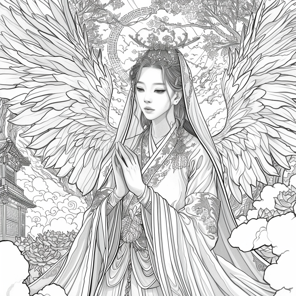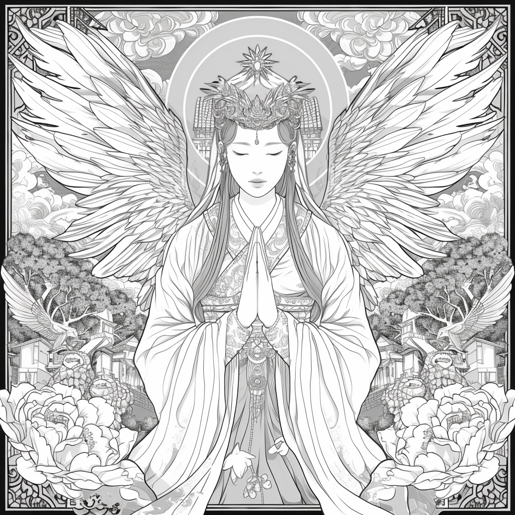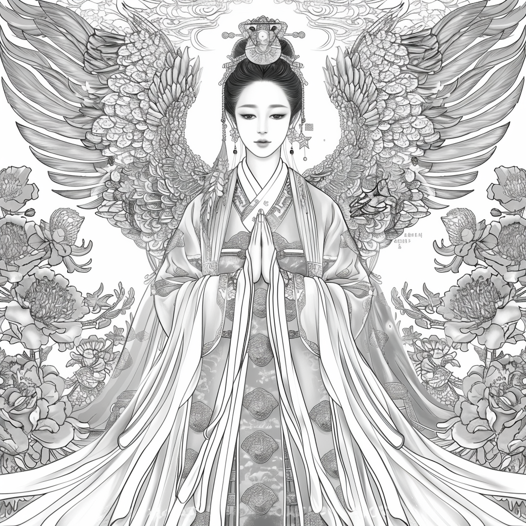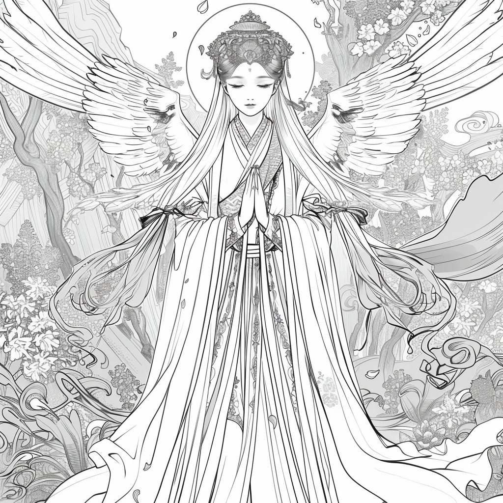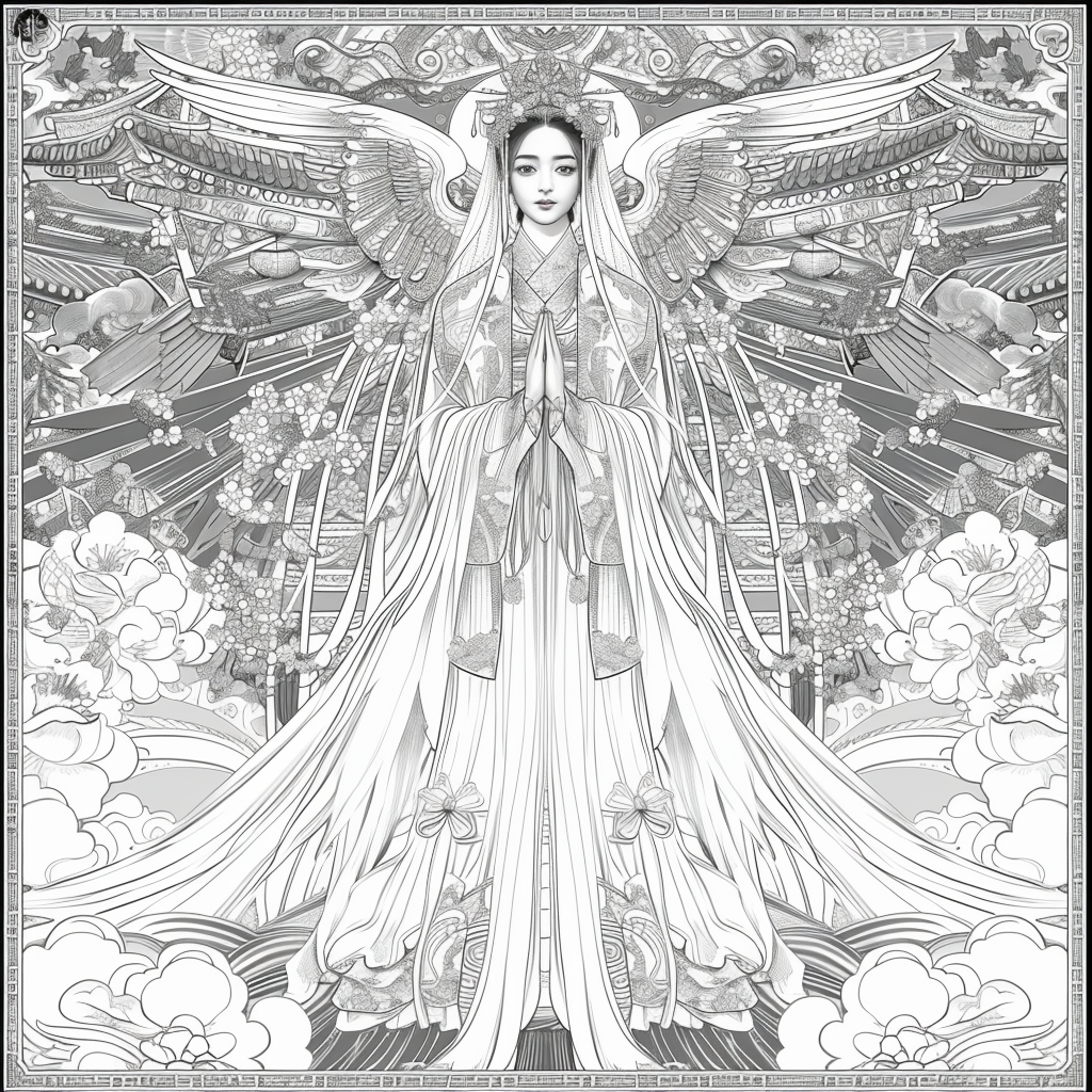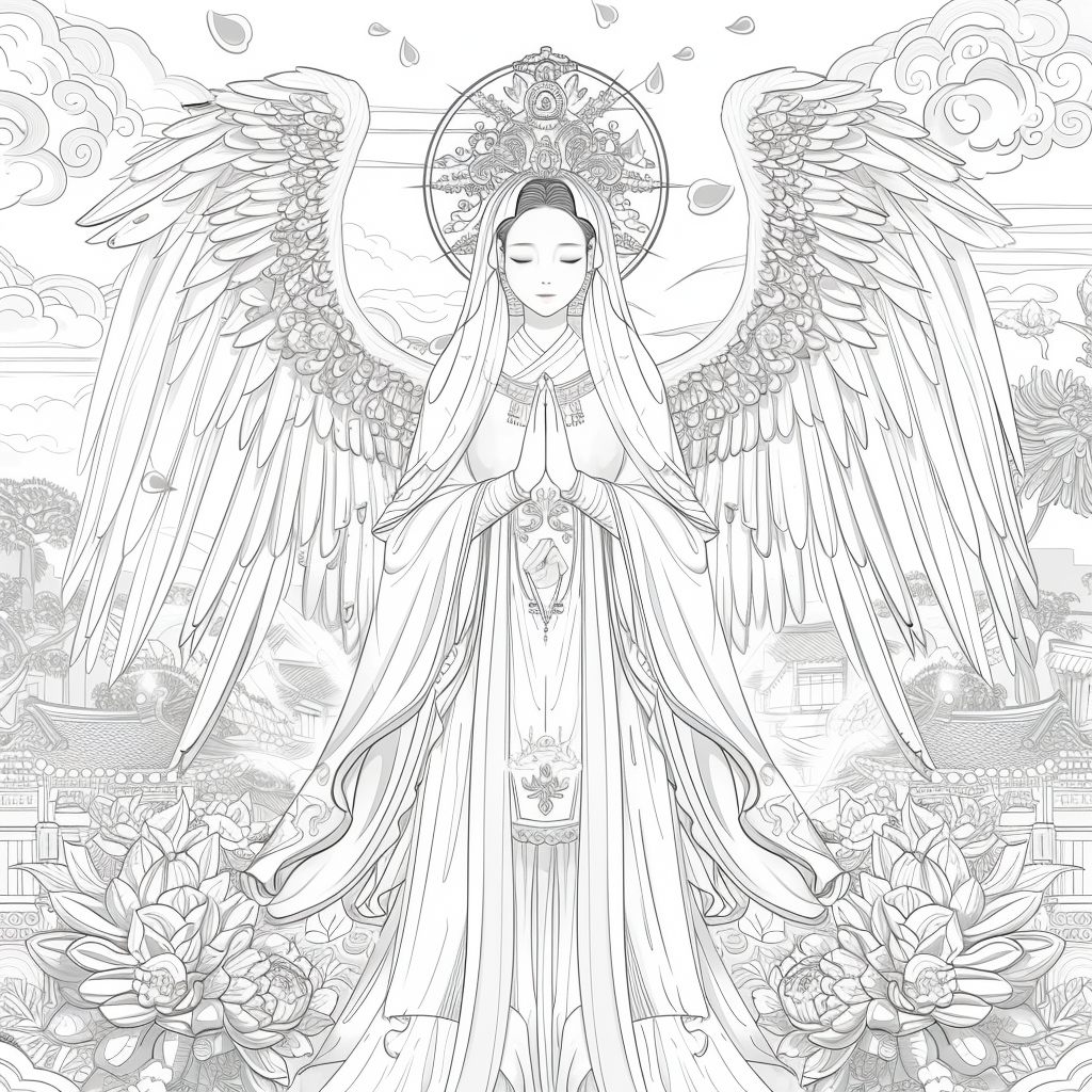 This majestic digital painting illustrates a powerful and serene water goddess cloaked in vibrant ceremonial robes, standing at the heart of a mythical realm. With hands joined in prayer and her veil flowing like mist, she radiates spiritual sovereignty, balance, and elemental command.