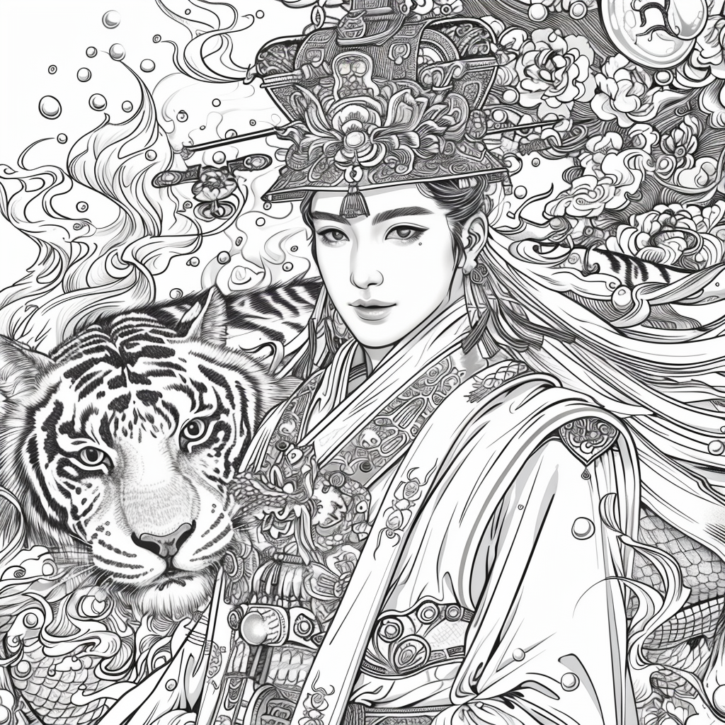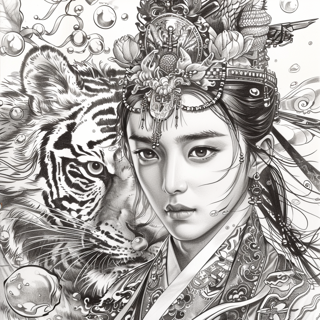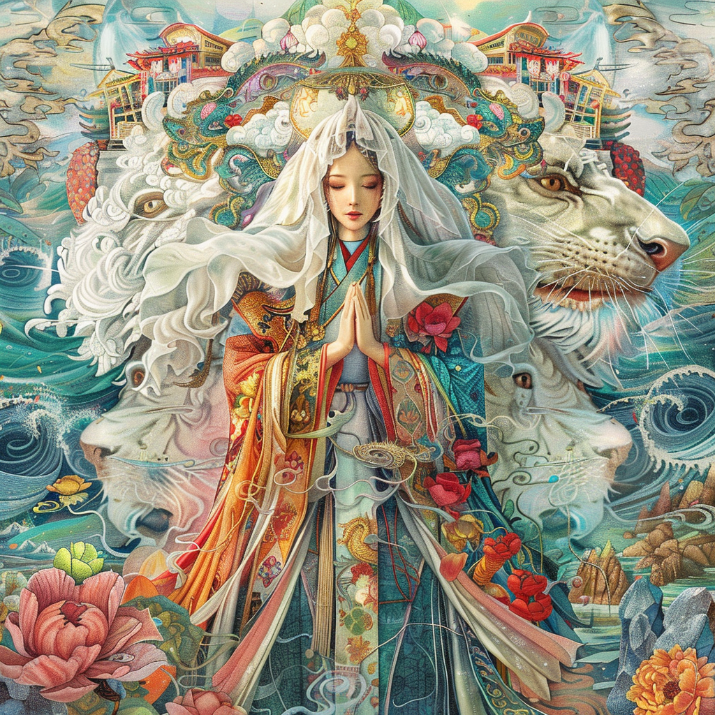 Behind her rise two monumental white guardian lions or mythical tigers, symbolizing strength, protection, and cosmic order. These sacred beasts blend seamlessly with a swirling sea, blooming lotuses, floating petals, and a divine palace nestled in the clouds—creating an image where heaven, earth, and ocean converge.