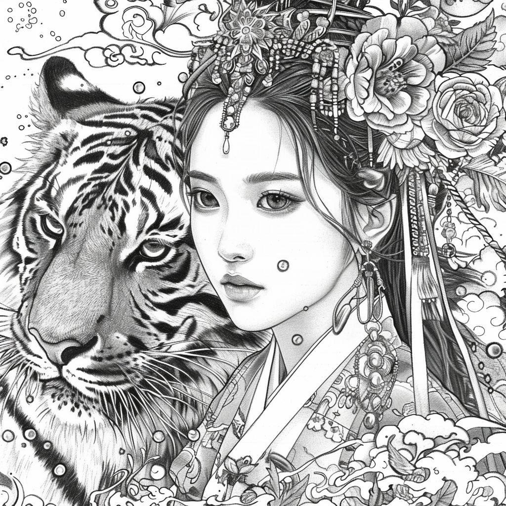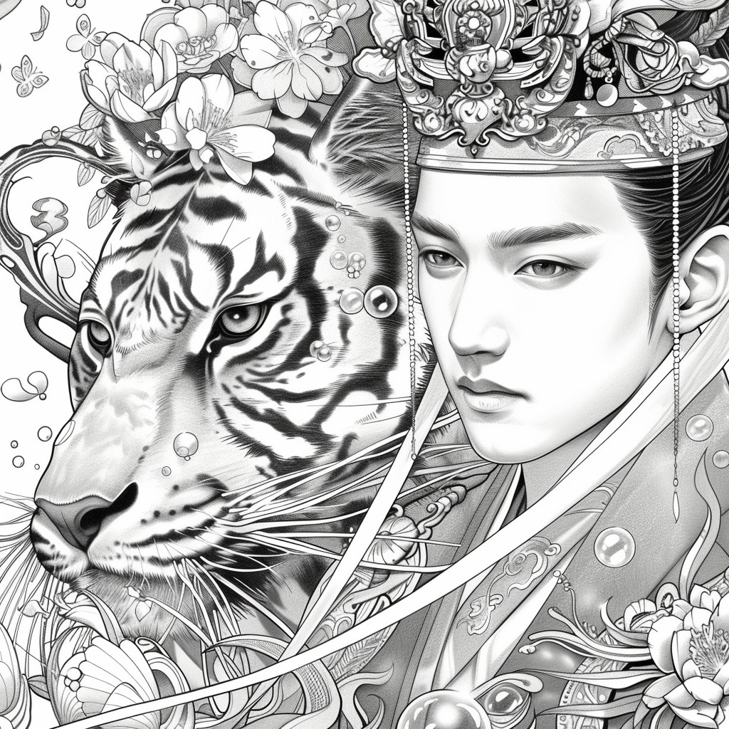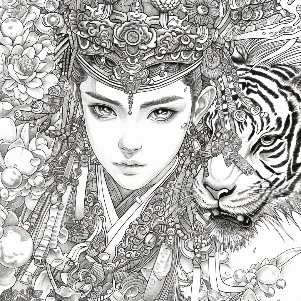 Behind her rise two monumental white guardian lions or mythical tigers, symbolizing strength, protection, and cosmic order. These sacred beasts blend seamlessly with a swirling sea, blooming lotuses, floating petals, and a divine palace nestled in the clouds—creating an image where heaven, earth, and ocean converge.