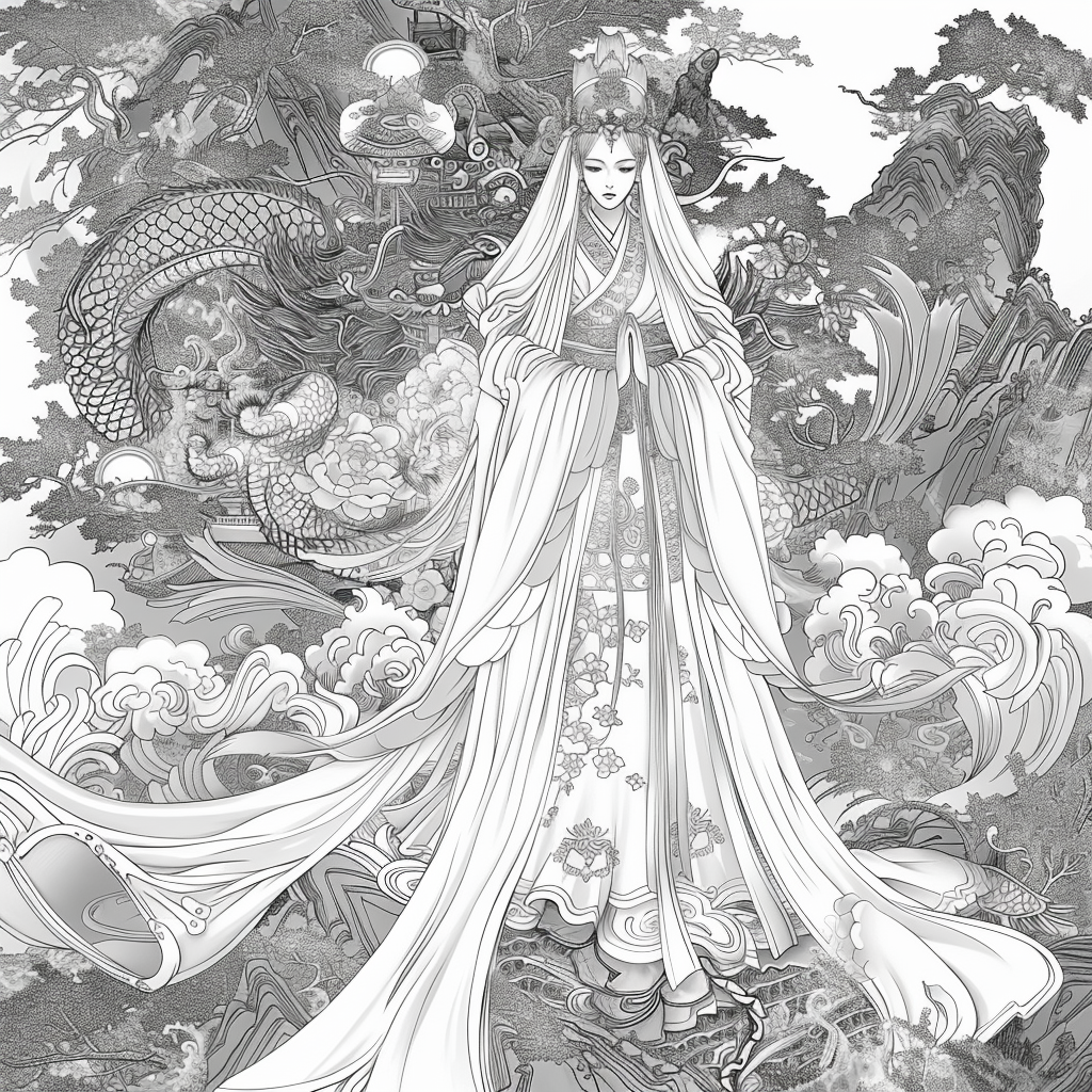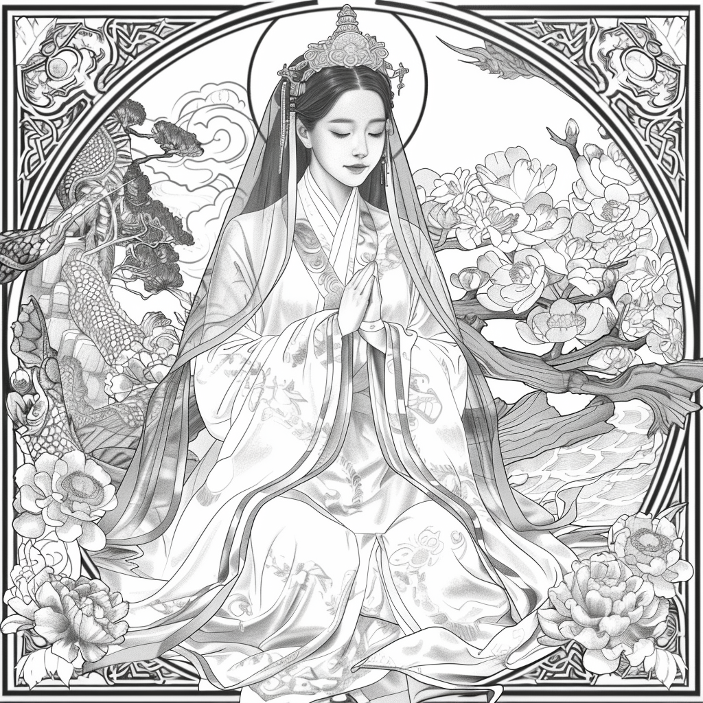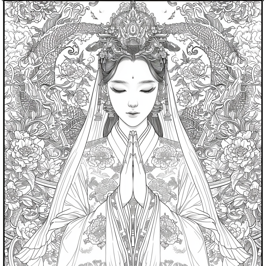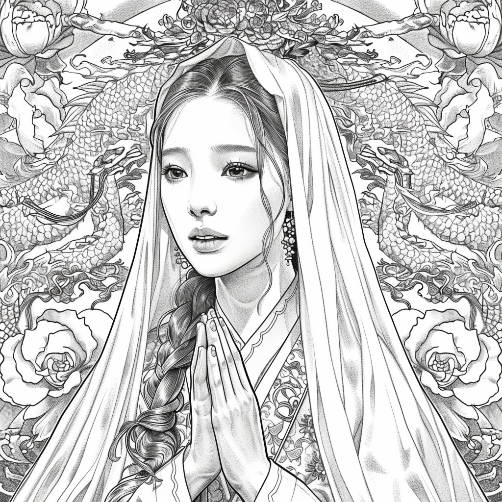 This captivating artwork depicts a serene princess dressed in a magnificent blue hanbok adorned with vibrant, flowing patterns. With her hands joined in prayer, she stands at the center of swirling waves and drifting lotus blossoms. Behind her, two mighty dragons—one golden and one emerald—encircle her presence, symbolizing balance, protection, and divine power. The intricate details of her attire, the ethereal aura of the background, and the mystical interplay of colors evoke a sense of spiritual harmony and transcendence. A masterpiece of cultural fantasy and sacred elegance.