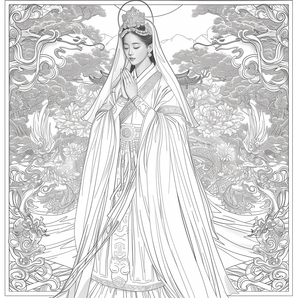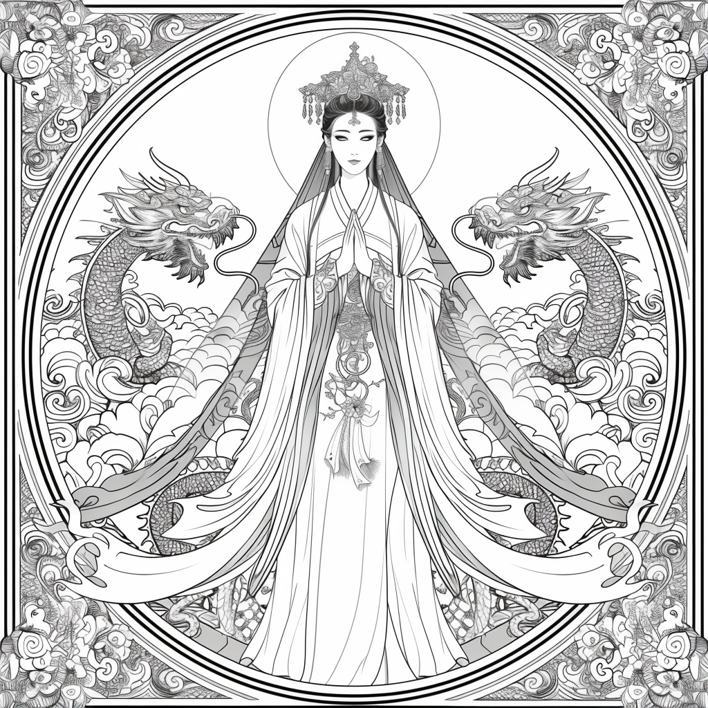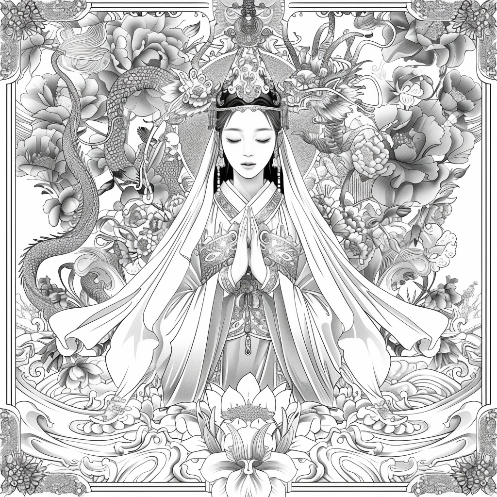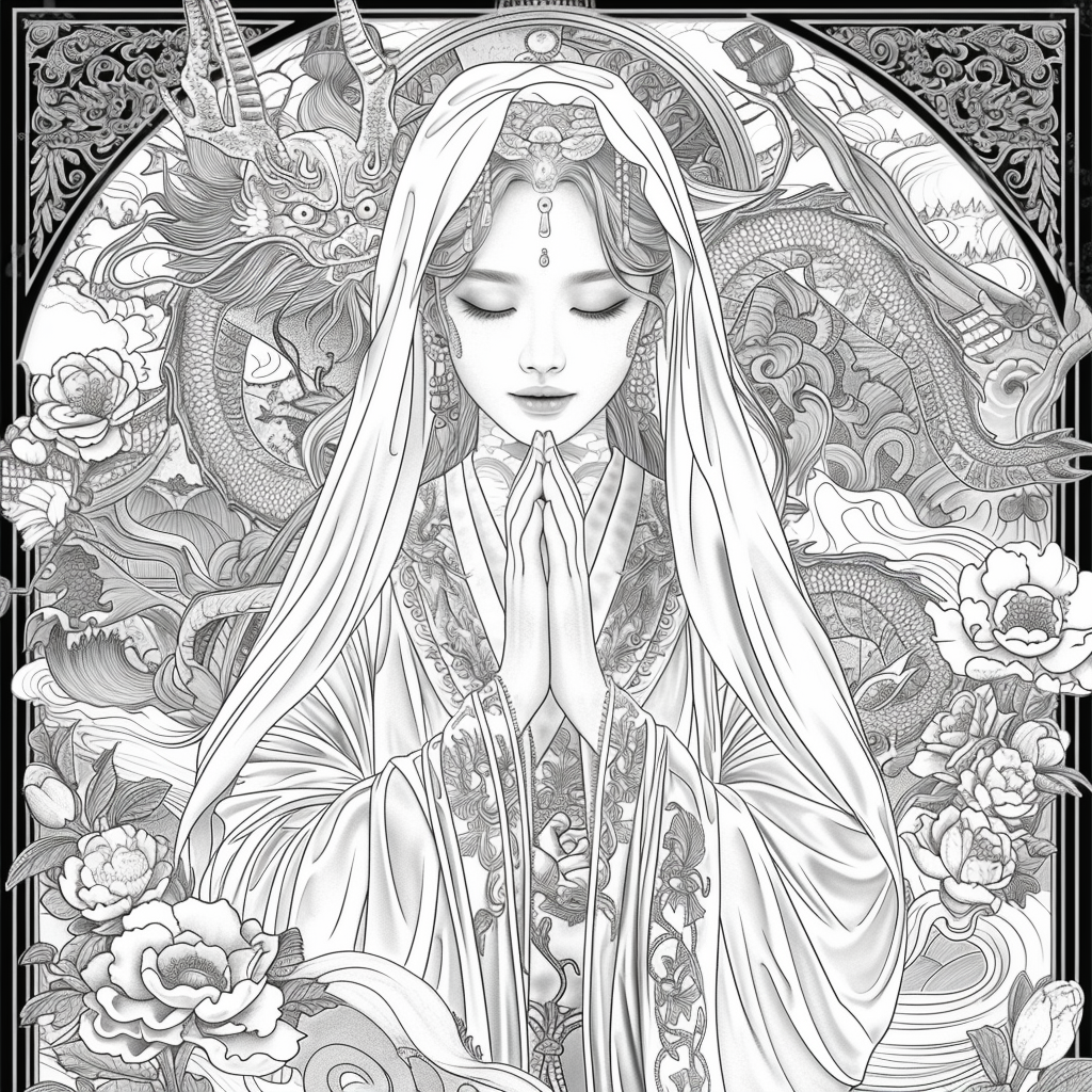 This captivating artwork depicts a serene princess dressed in a magnificent blue hanbok adorned with vibrant, flowing patterns. With her hands joined in prayer, she stands at the center of swirling waves and drifting lotus blossoms. Behind her, two mighty dragons—one golden and one emerald—encircle her presence, symbolizing balance, protection, and divine power. The intricate details of her attire, the ethereal aura of the background, and the mystical interplay of colors evoke a sense of spiritual harmony and transcendence. A masterpiece of cultural fantasy and sacred elegance.