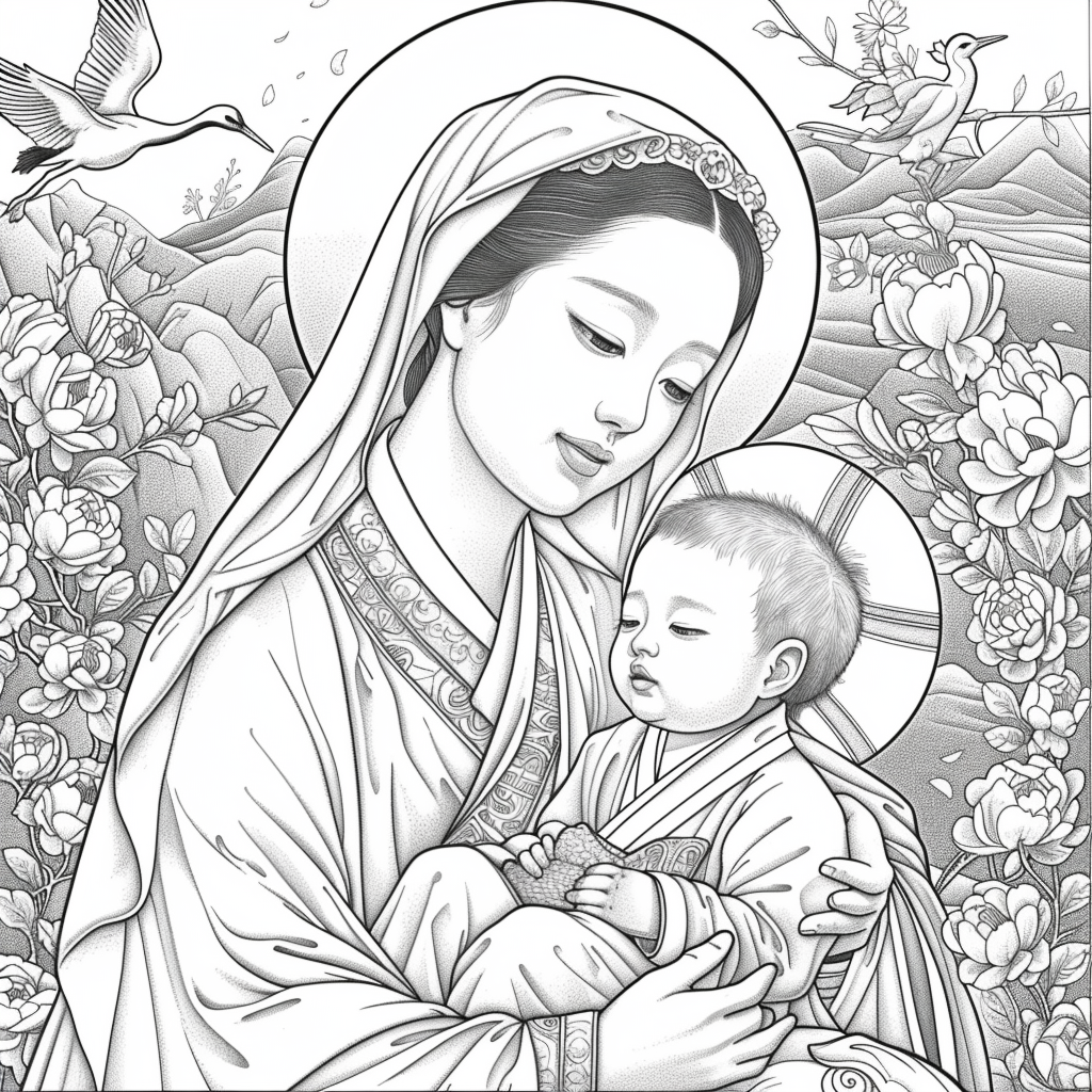 A serene mother clothed in a resplendent hanbok gently cradles her child, embodying grace and devotion. Her flowing robes of emerald, crimson, and sapphire are adorned with delicate embroidery, while a translucent green veil drapes softly over her shoulders. A golden halo frames her face, emphasizing her spiritual radiance. The child rests peacefully in her arms, wrapped in a purple cloth, symbolizing purity and protection. Surrounding them are blooming peonies and camellias, along with cranes soaring gracefully across the sky, representing longevity and harmony. This artwork harmonizes sacred symbolism with Korean traditional aesthetics, creating a timeless vision of maternal love and divine grace.